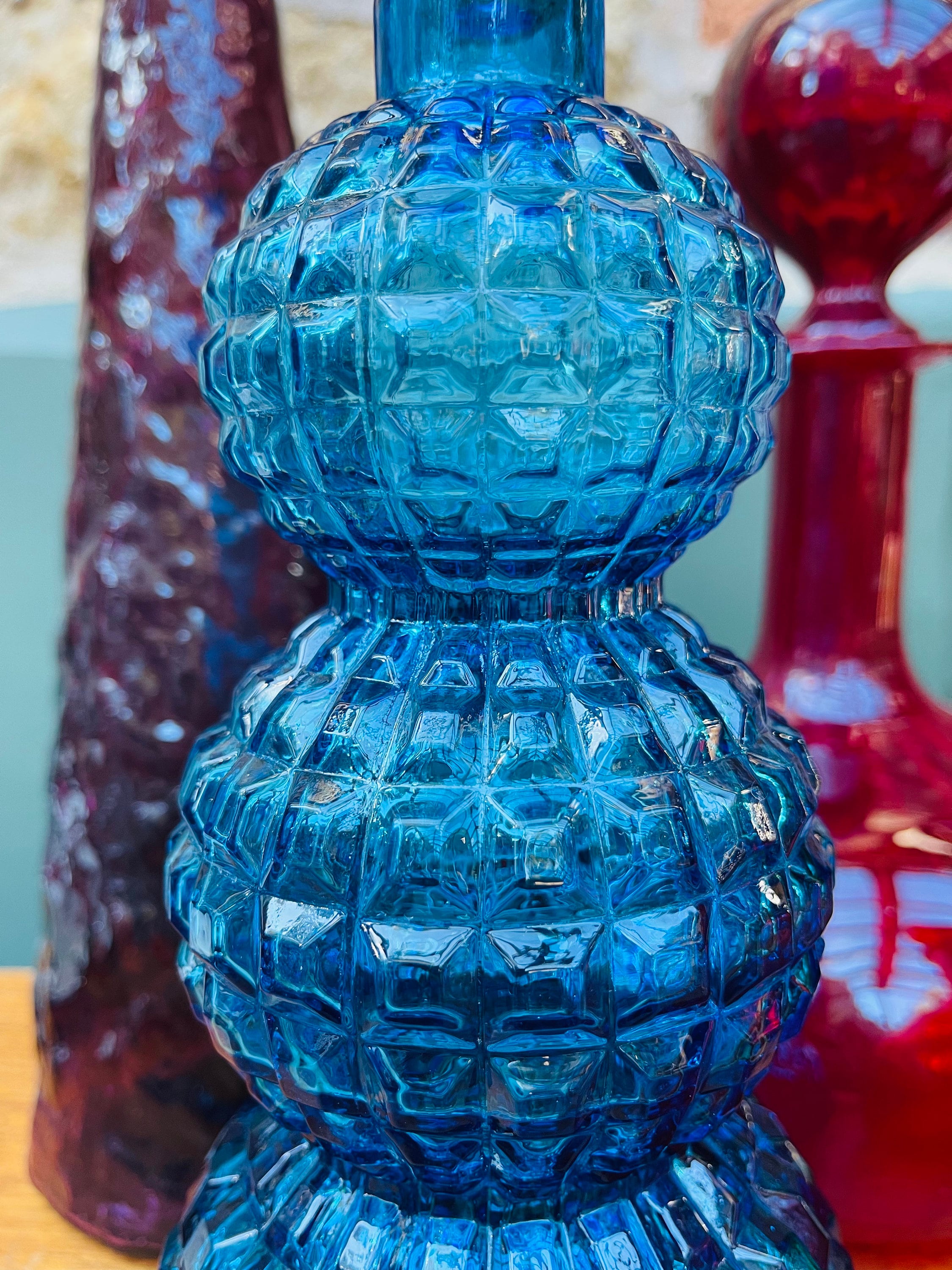 Glittering 1960s decanter made in the glass factories of Empoli on the outskirts of Florence, and now sought after by collectors around the world. This shape of bottle comes in several known colours (green, amber, blue, clear, cobalt) and looks fabulous displayed alone or with varying genie bottle shapes.