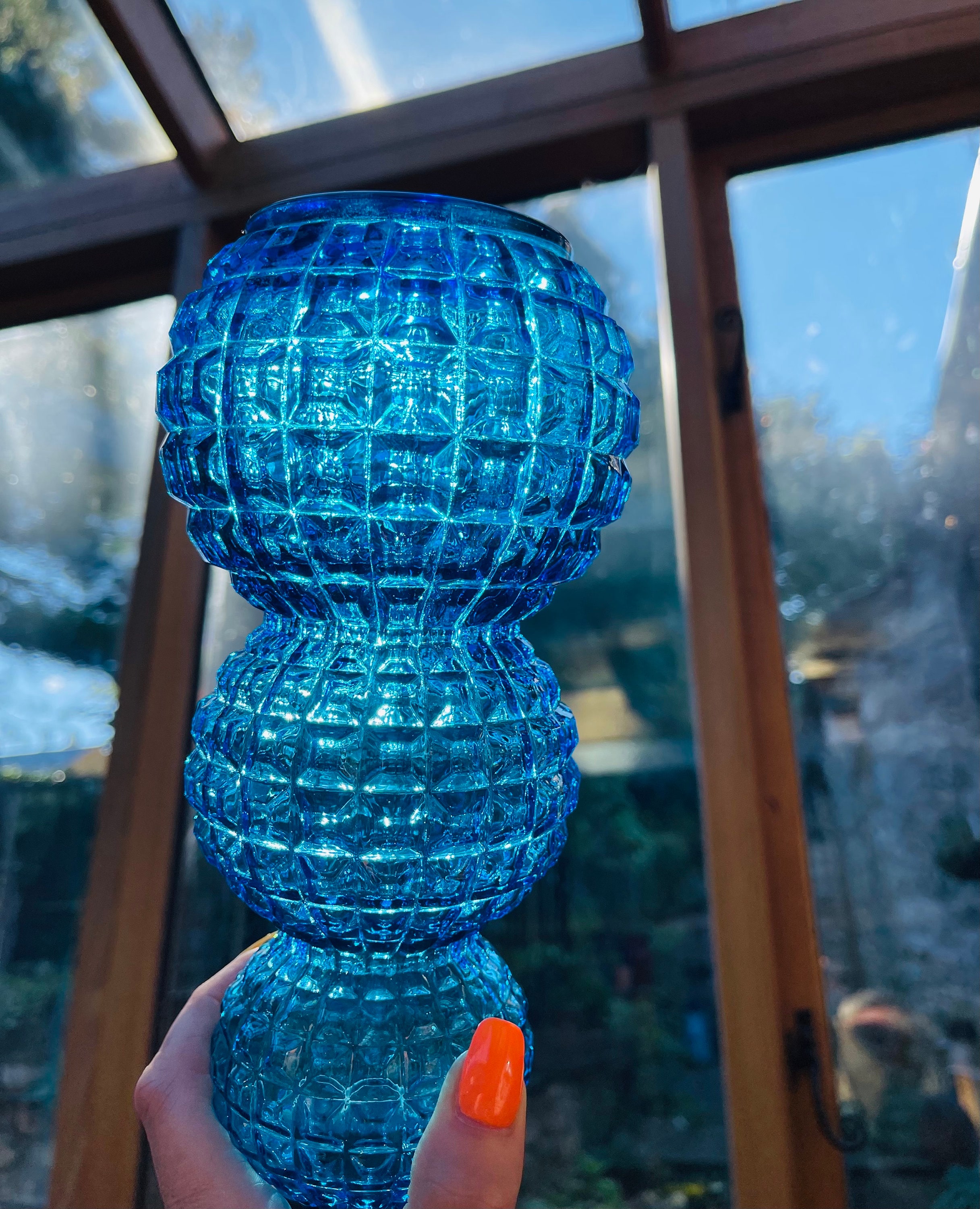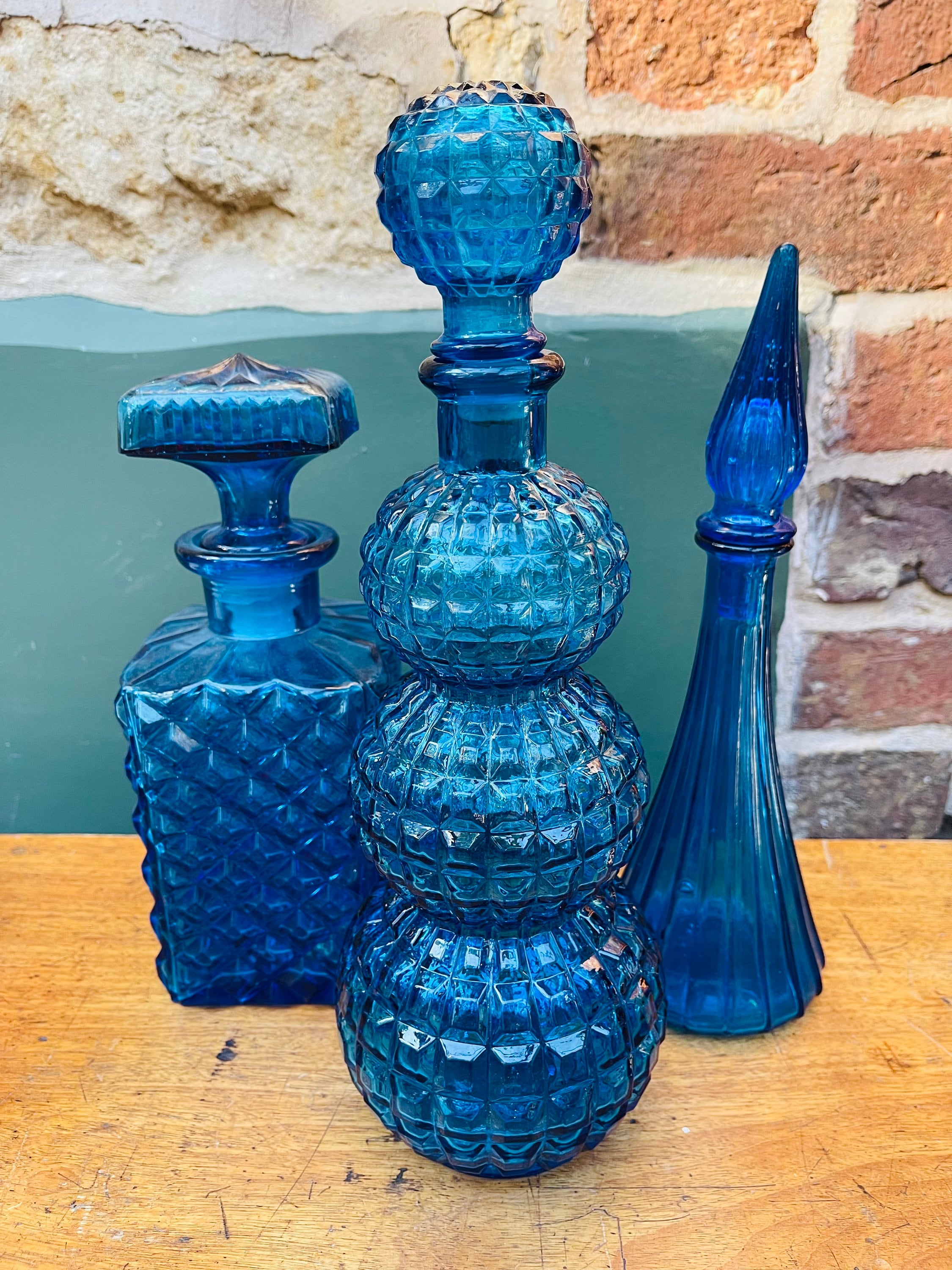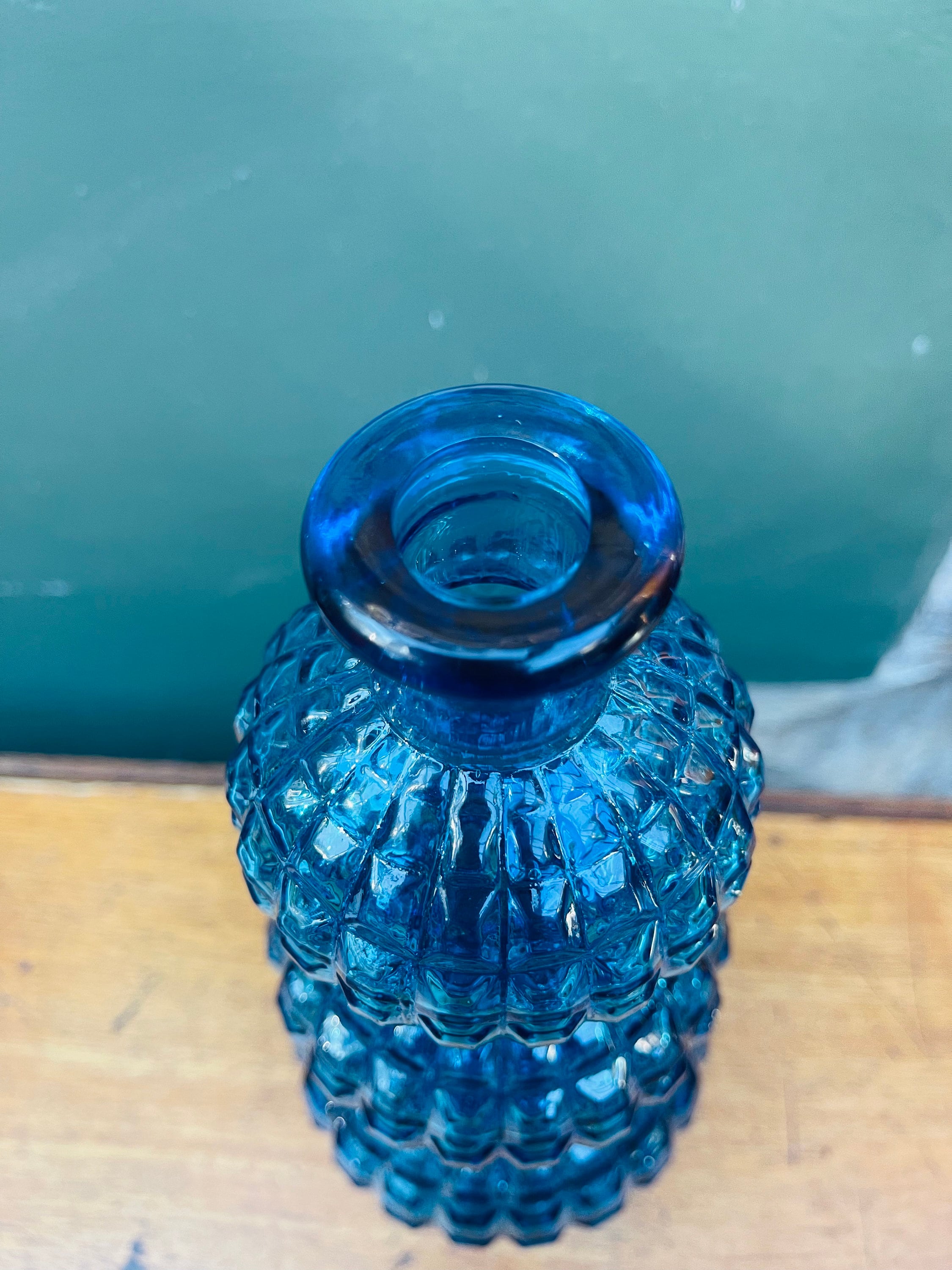 Stunning vintage blue Italian genie bottle decanter in the highly collectable triple gourd shape with diamond point pattern.