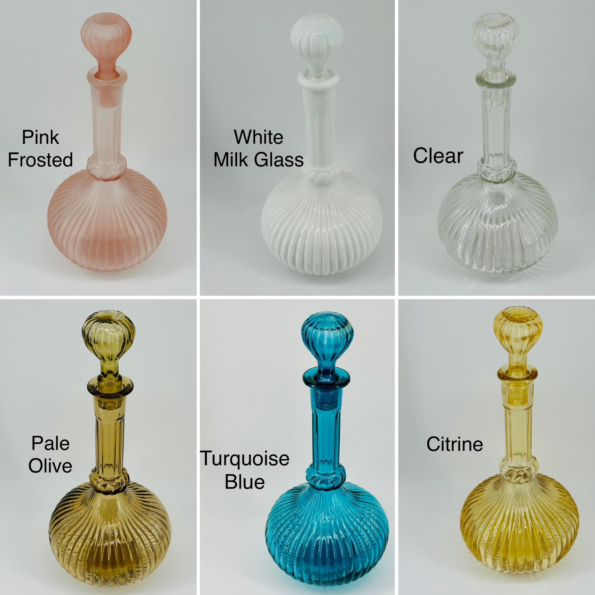 Nicknamed “Hot Air Balloon” Decanters by collectors, these are Italian-made vintage 1960s and 1970s ribbed glass decanters with a rope twist effect around the lower neck, and stopper shape reminiscent of vintage hot air balloons. These bottles are 32.5cm/12.75” tall, and come in a wide range of transparent, frosted and opaque milk glass colours, similar to other Empoli genie bottles. Some have a faint “MADE IN ITALY” stamp to the base that can just be made out, some have plain bases.