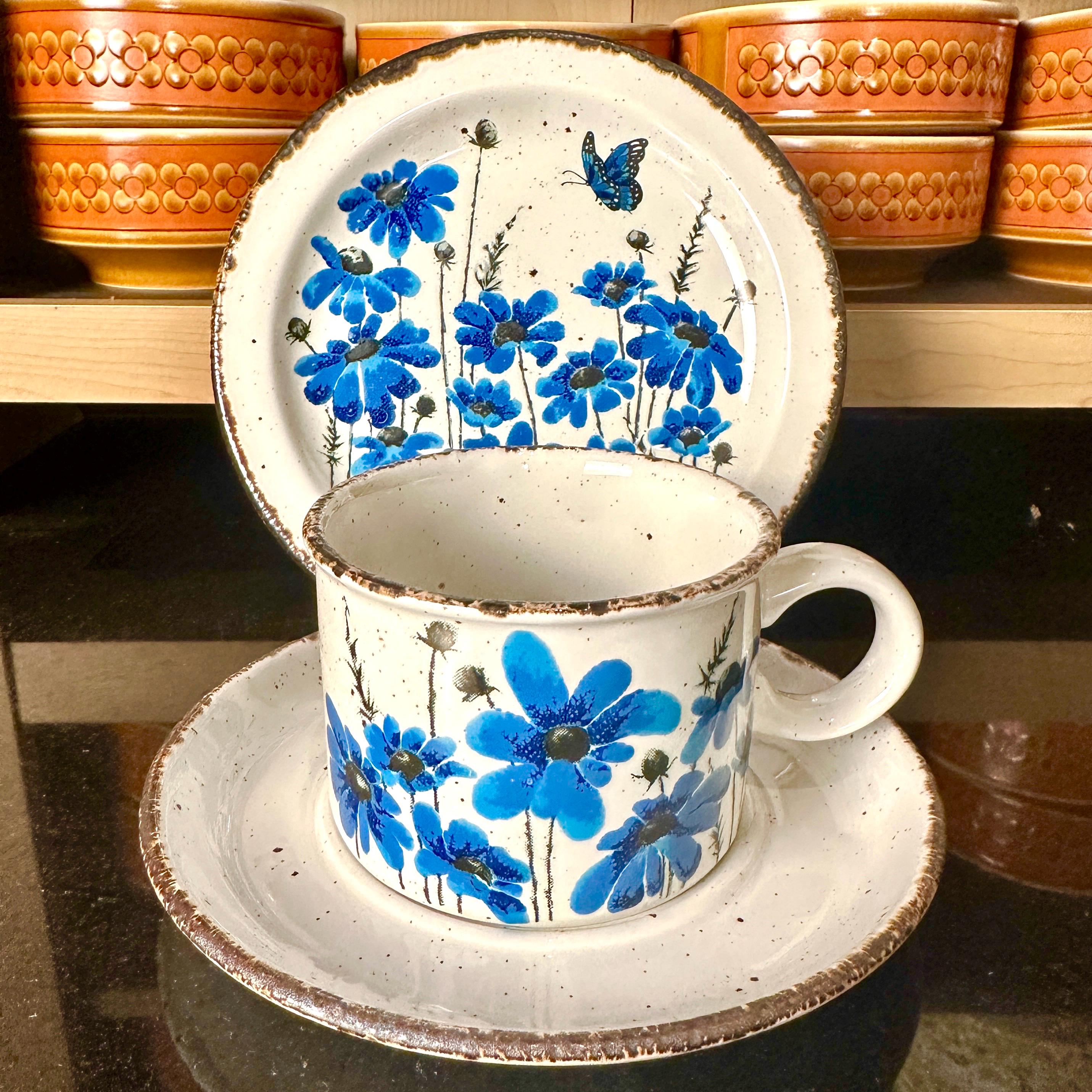 Midwinter Pottery Spring Blue Teacups, Saucers and Side Plates from the 1970s Stonehenge Range