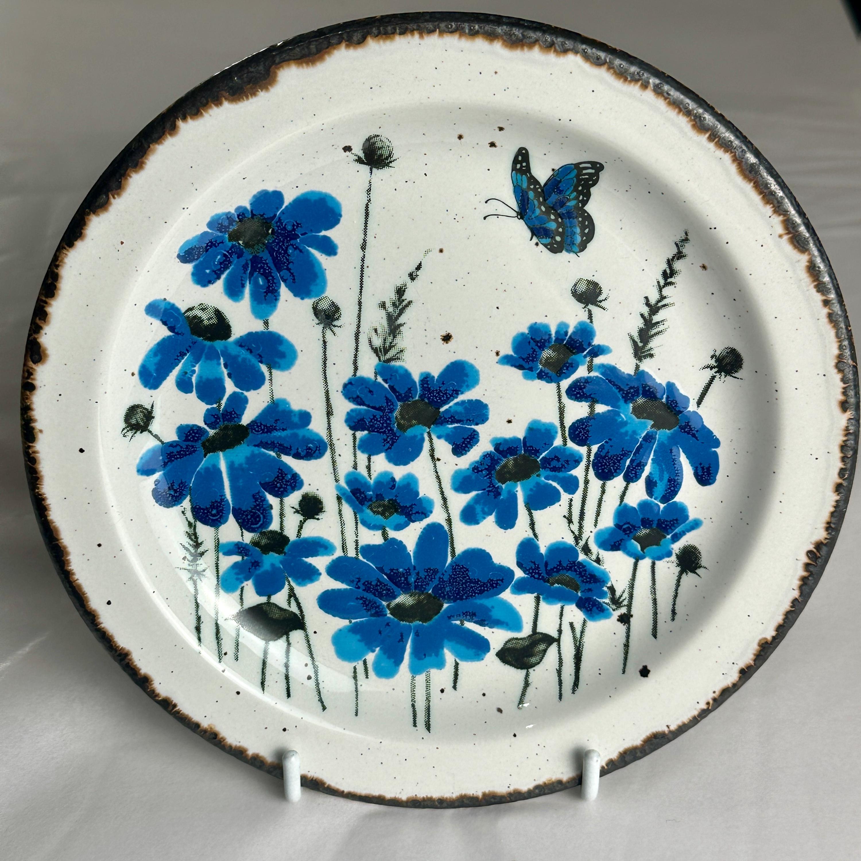The design features blue stylised flowers on the classic Stonehenge ‘Creation’ background - glossy cream with brown flecks and iron oxide brown edge detail. The pottery feels and looks chunky, earthy and substantial.