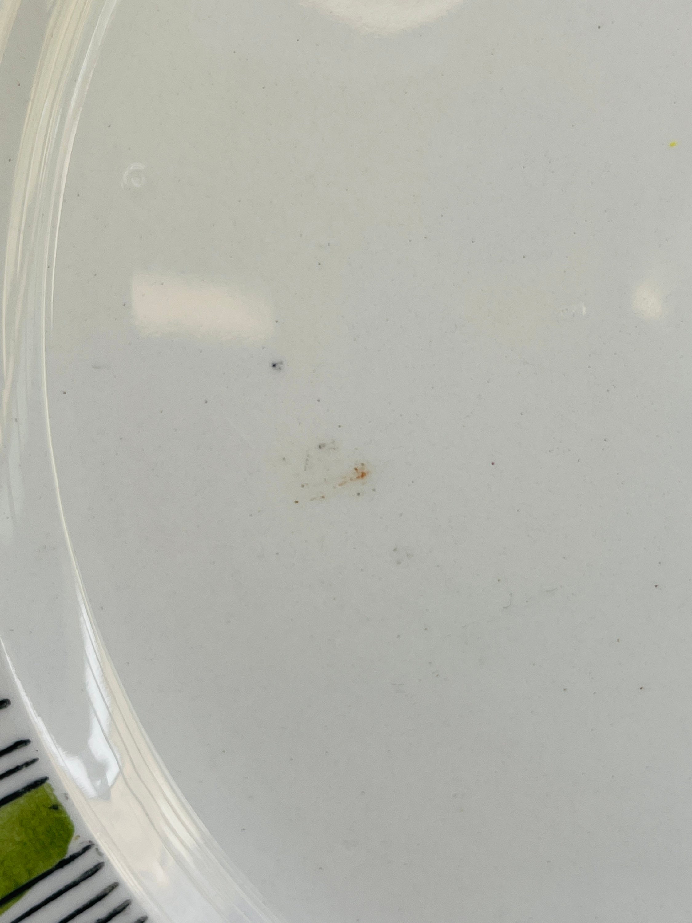 9.5" (24.2cm) circular dinner plate in excellent condition, transfer printed by a semi-automated rubber stamping process with a black outline design, and then handpainted green, brown and yellow accents were added. These designs had a 'homespun' appearance, and often varied from plate to plate with placement of motifs and positioning of the coloured accents. The plate has a couple of small underglaze smudge marks which are shown in the photographs.