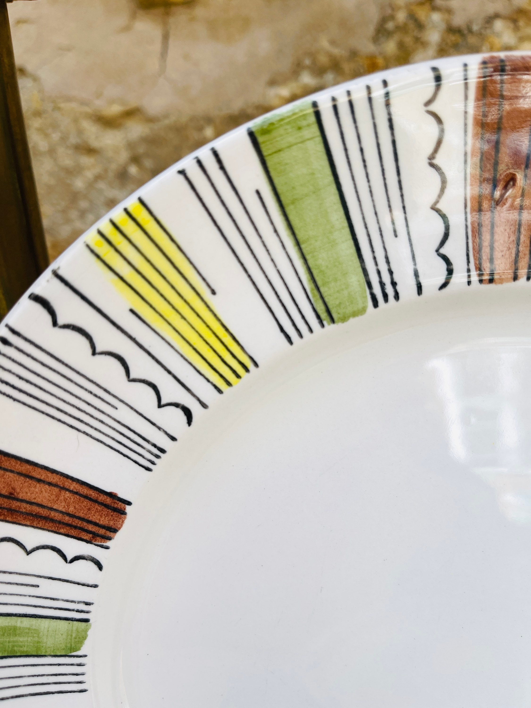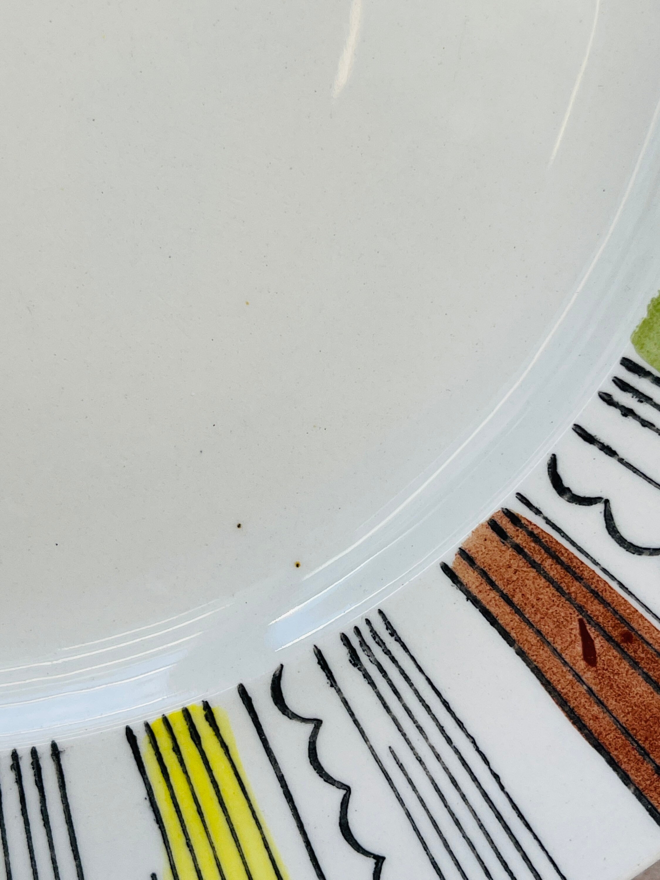 Kathie Winkle Mandalay Pattern Dinner Plate for Broadhurst Pottery - bold 1960s abstract linear design in green, yellow and brown.