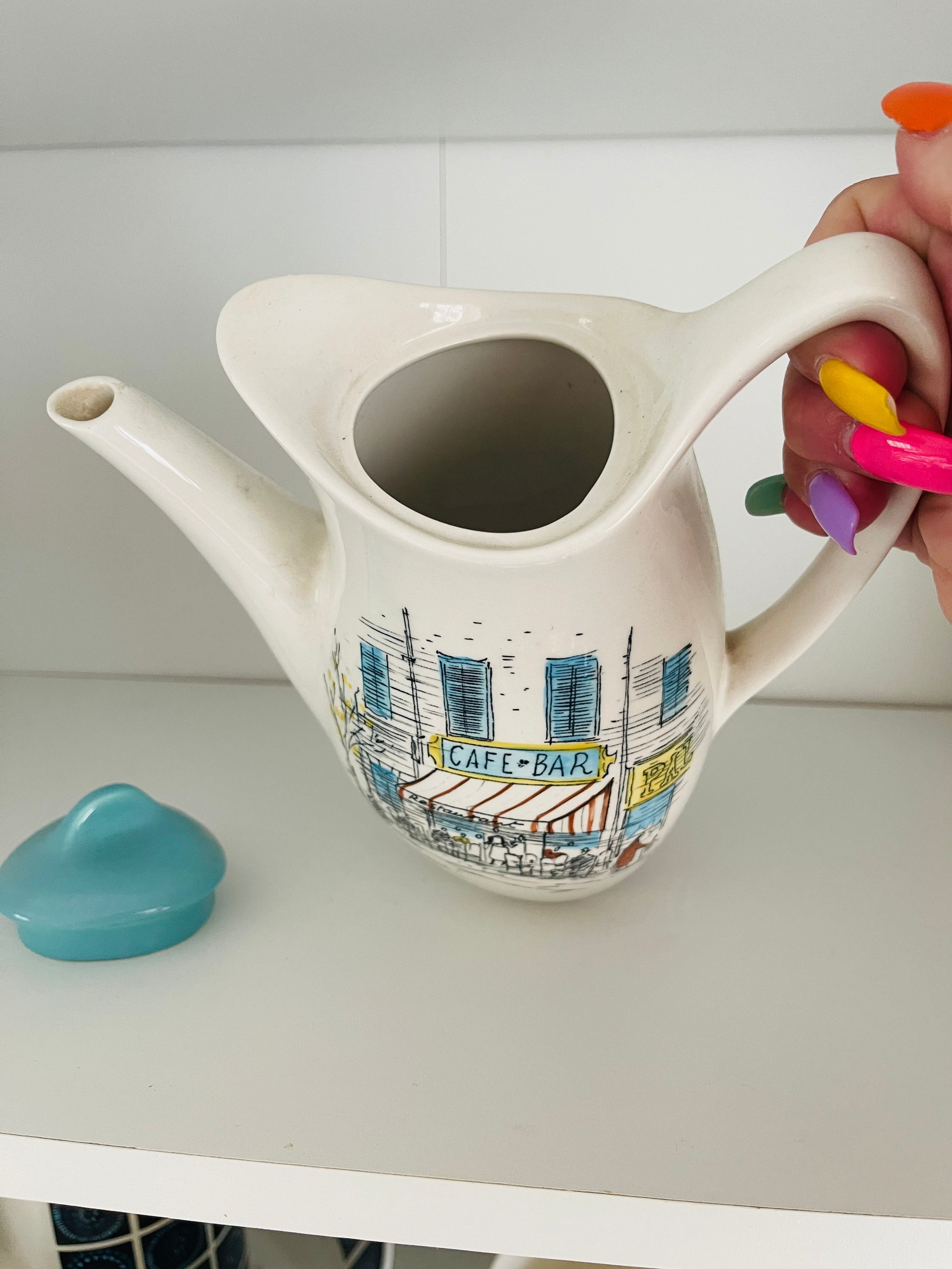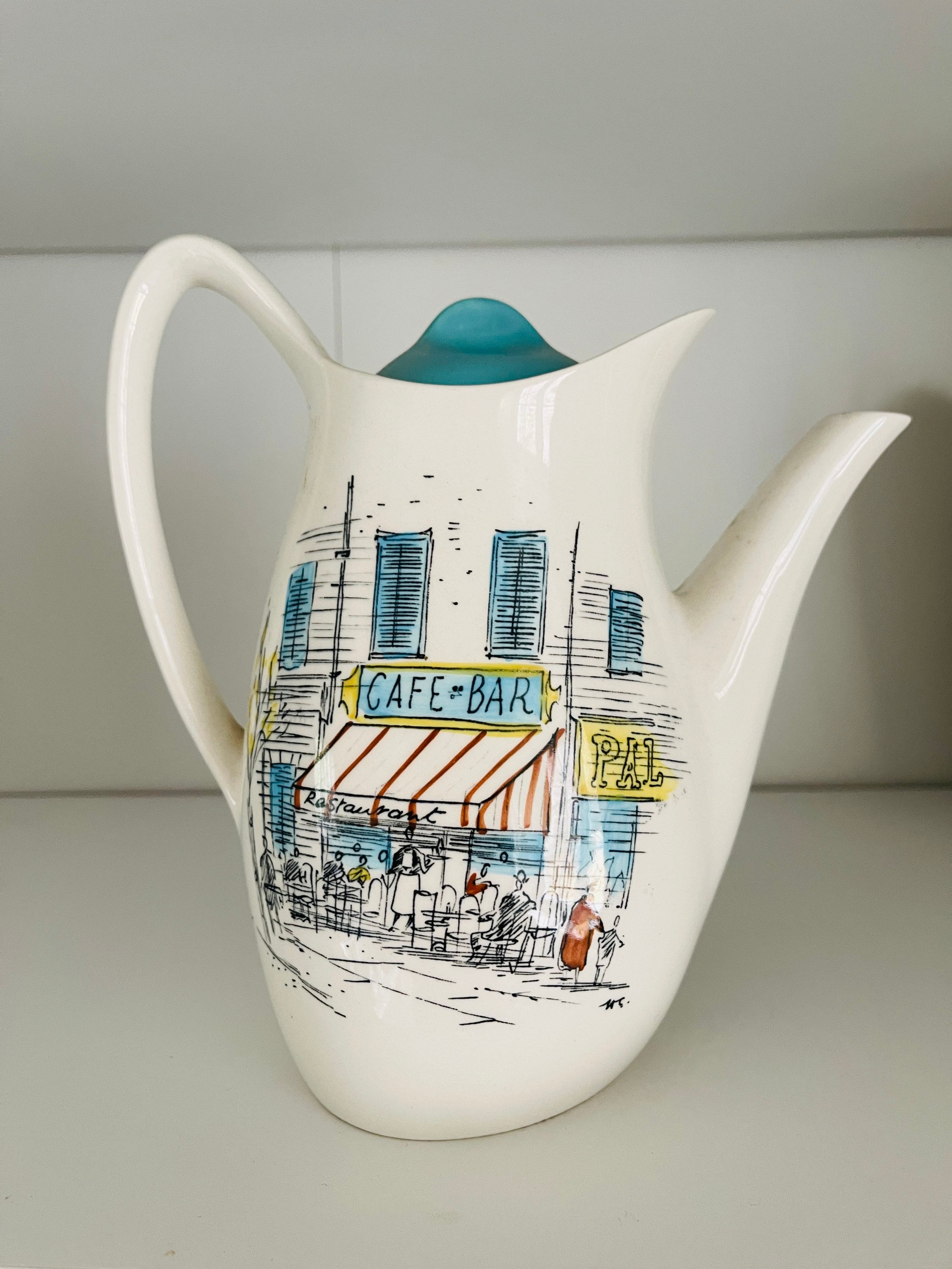 First appearing in 1954 on Midwinter's earlier Stylecraft shape, the popular pattern of French Riviera scenes was adapted and updated for the elegant new Fashion Shape in the late 50s, and continued to be manufactured into the 70s. It still looks fresh and beautiful today.