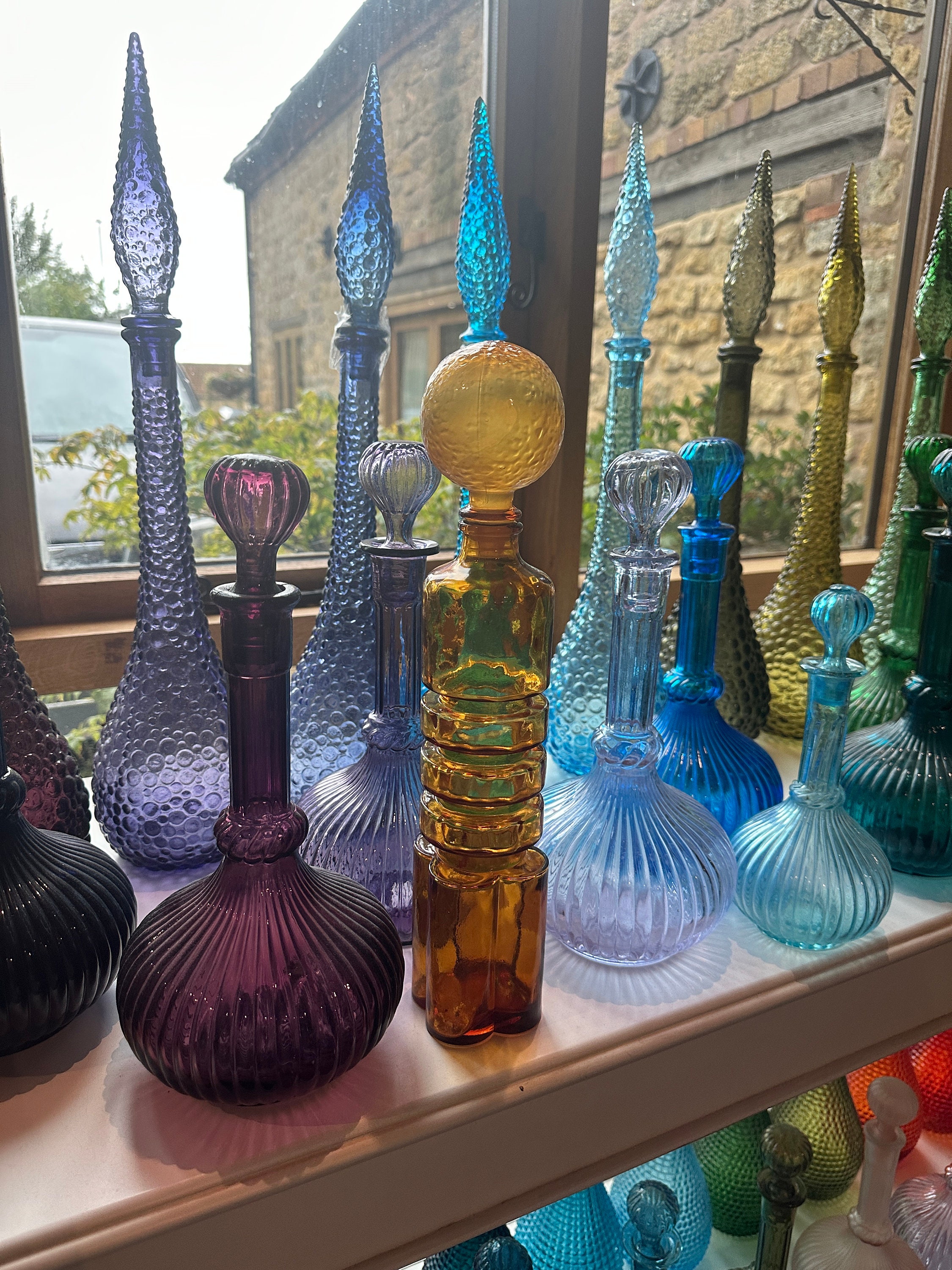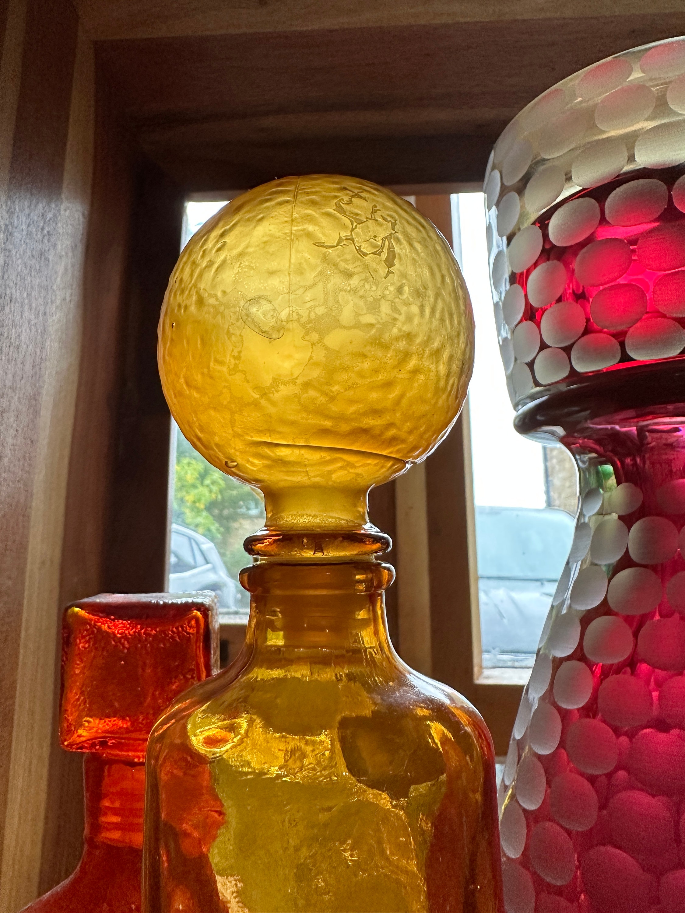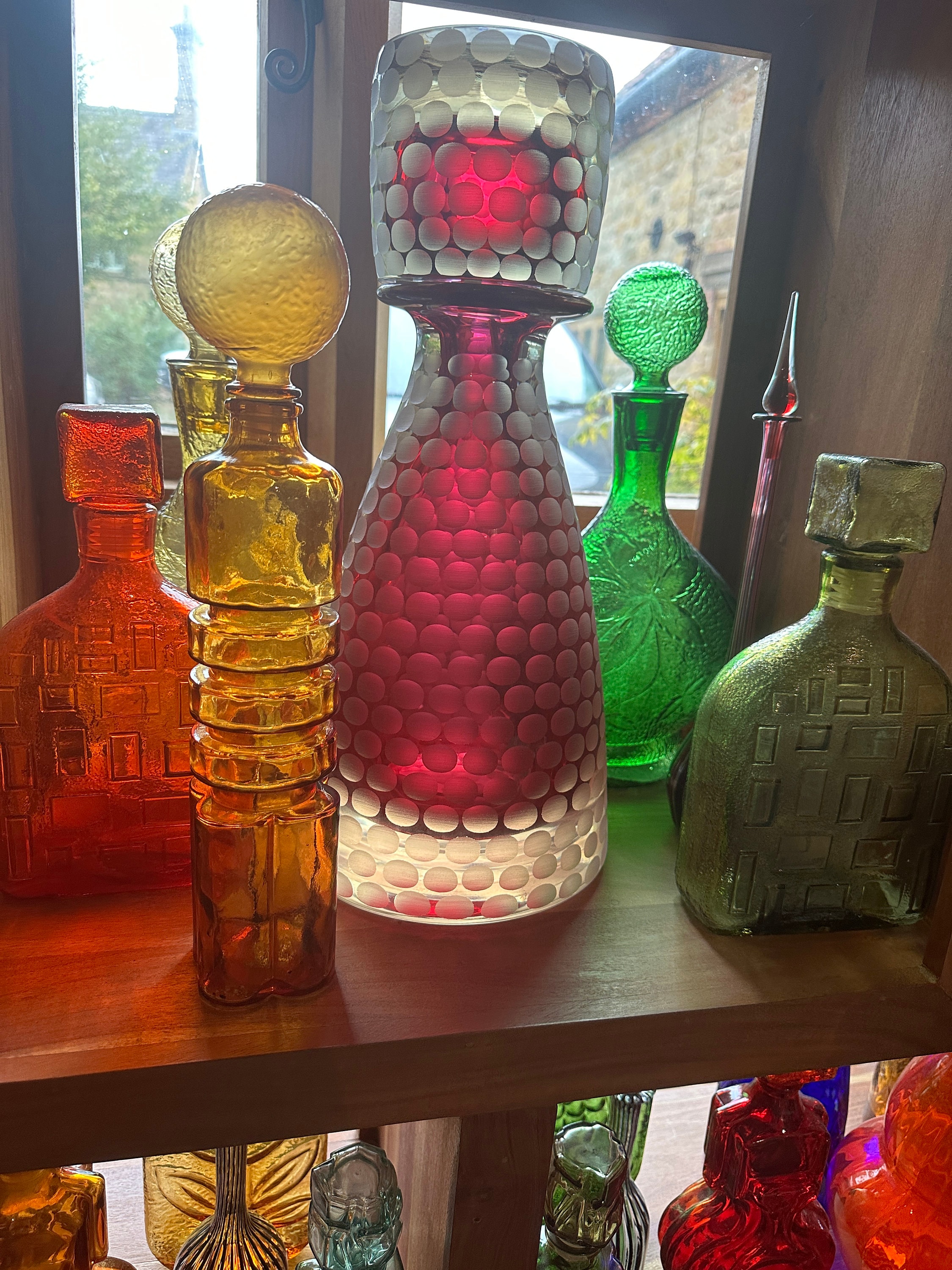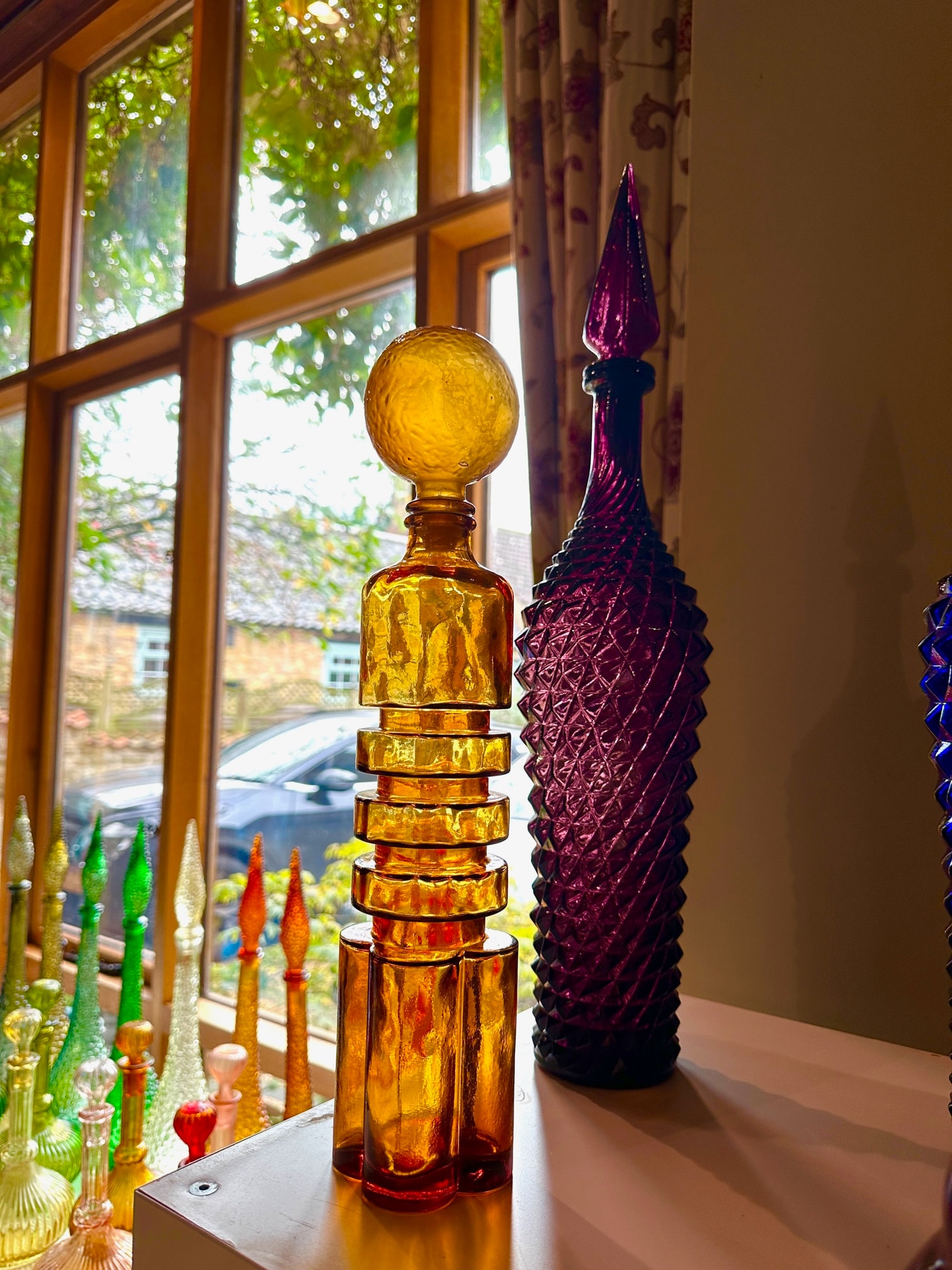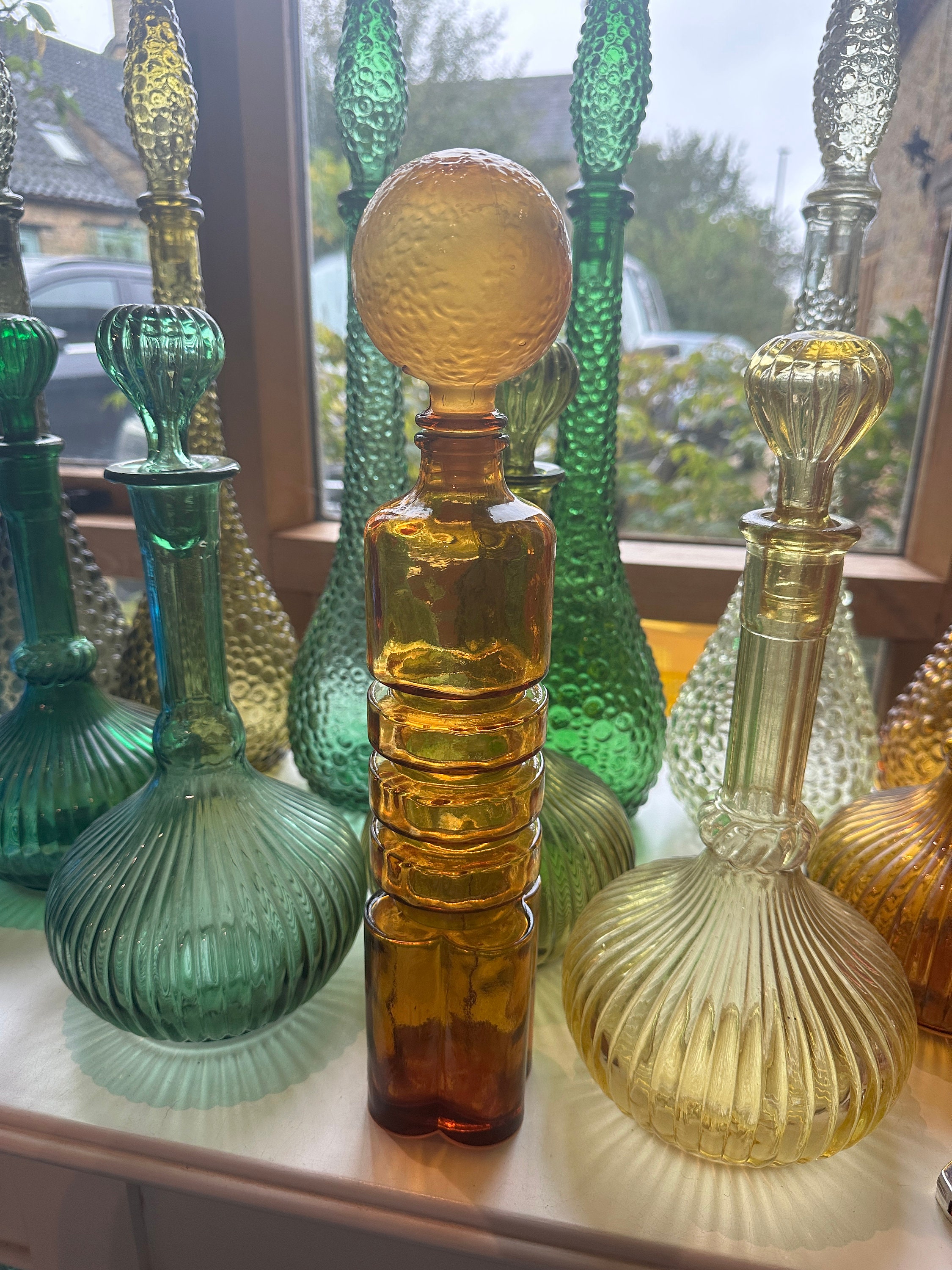 Rare and highly sought after, this is a striking mid-height Empoli bottle which displays well with all other sizes of genie. It was manufactured in at least 6 colours, including amber, green, blue, teal, red and clear.