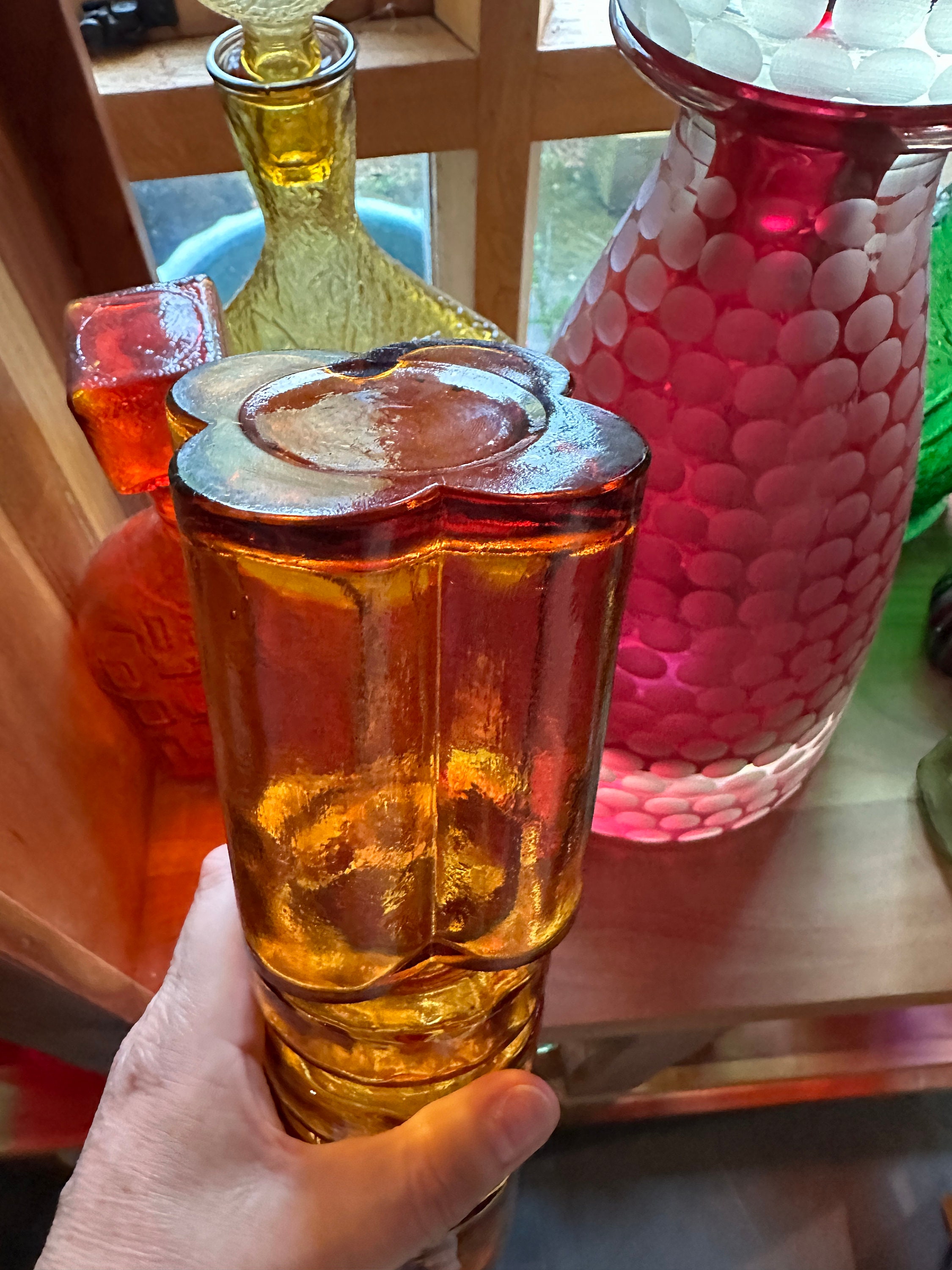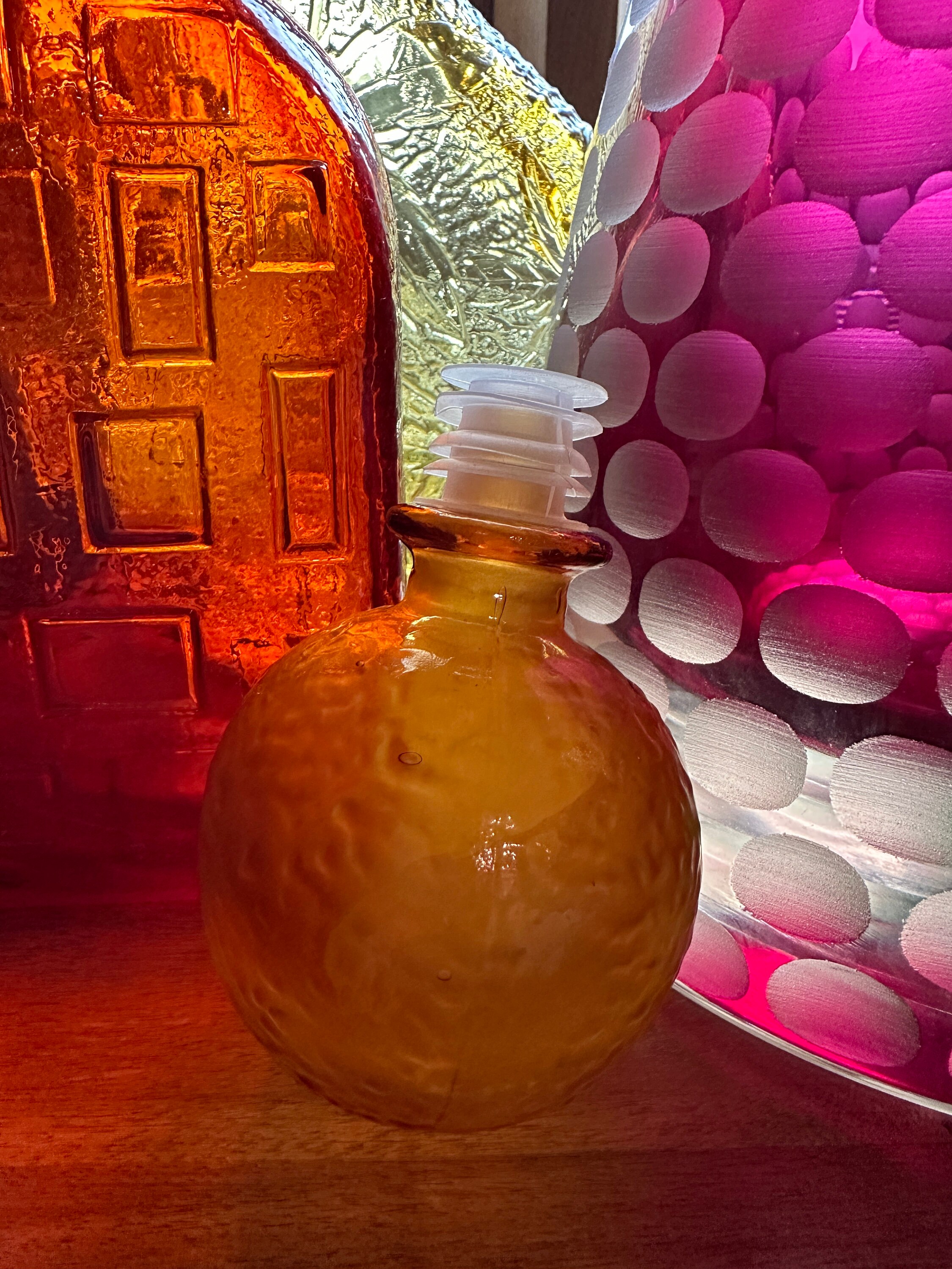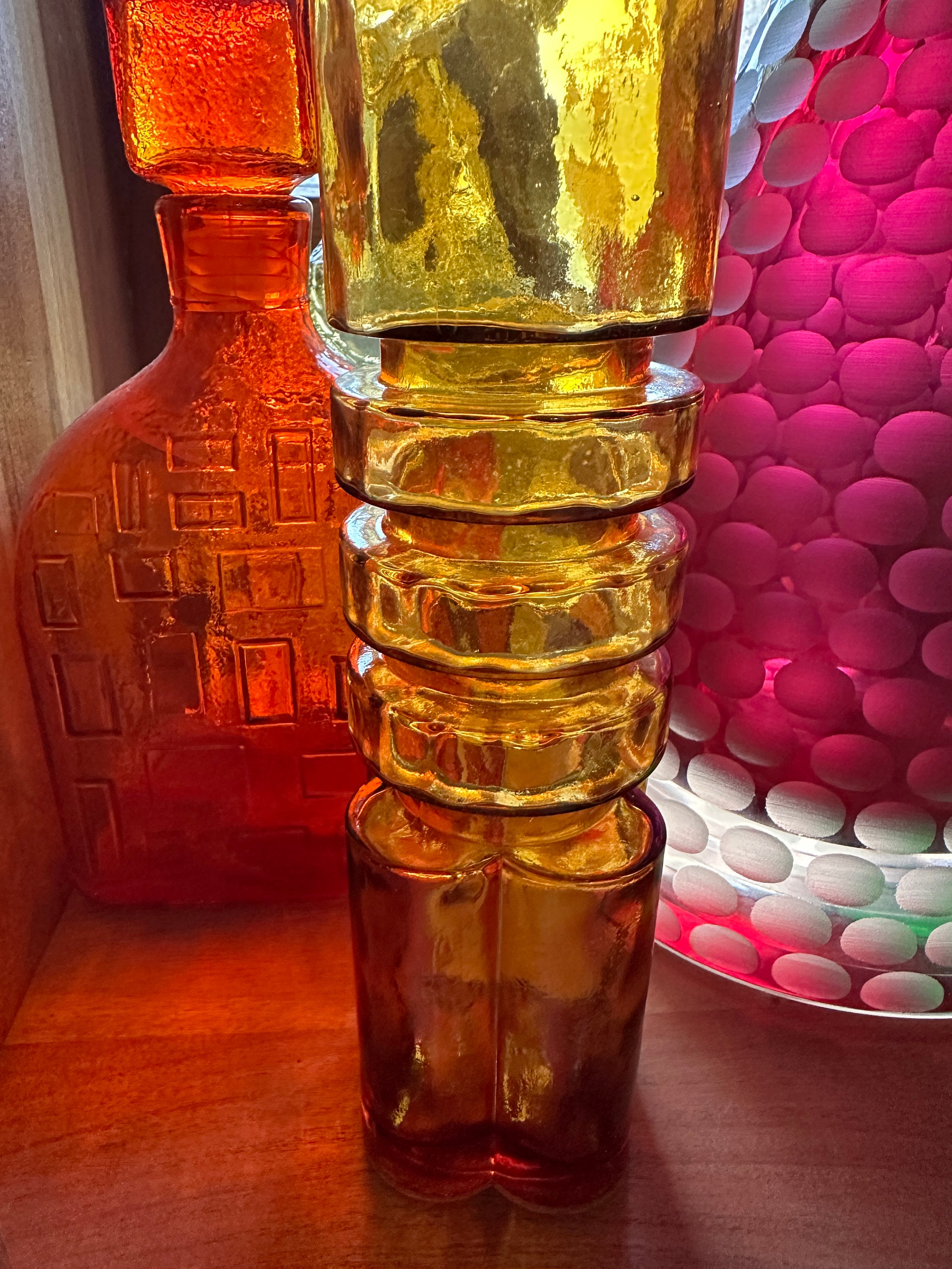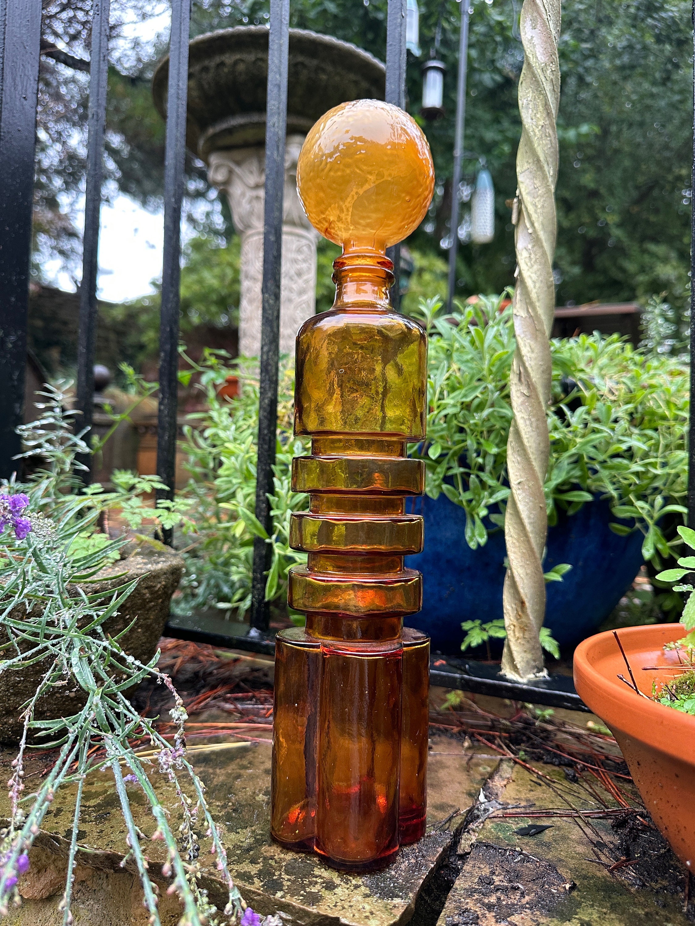 Vintage Italian Quatrefoil style amber glass genie bottle decanter, made in the Empoli region of Italy near Florence.
