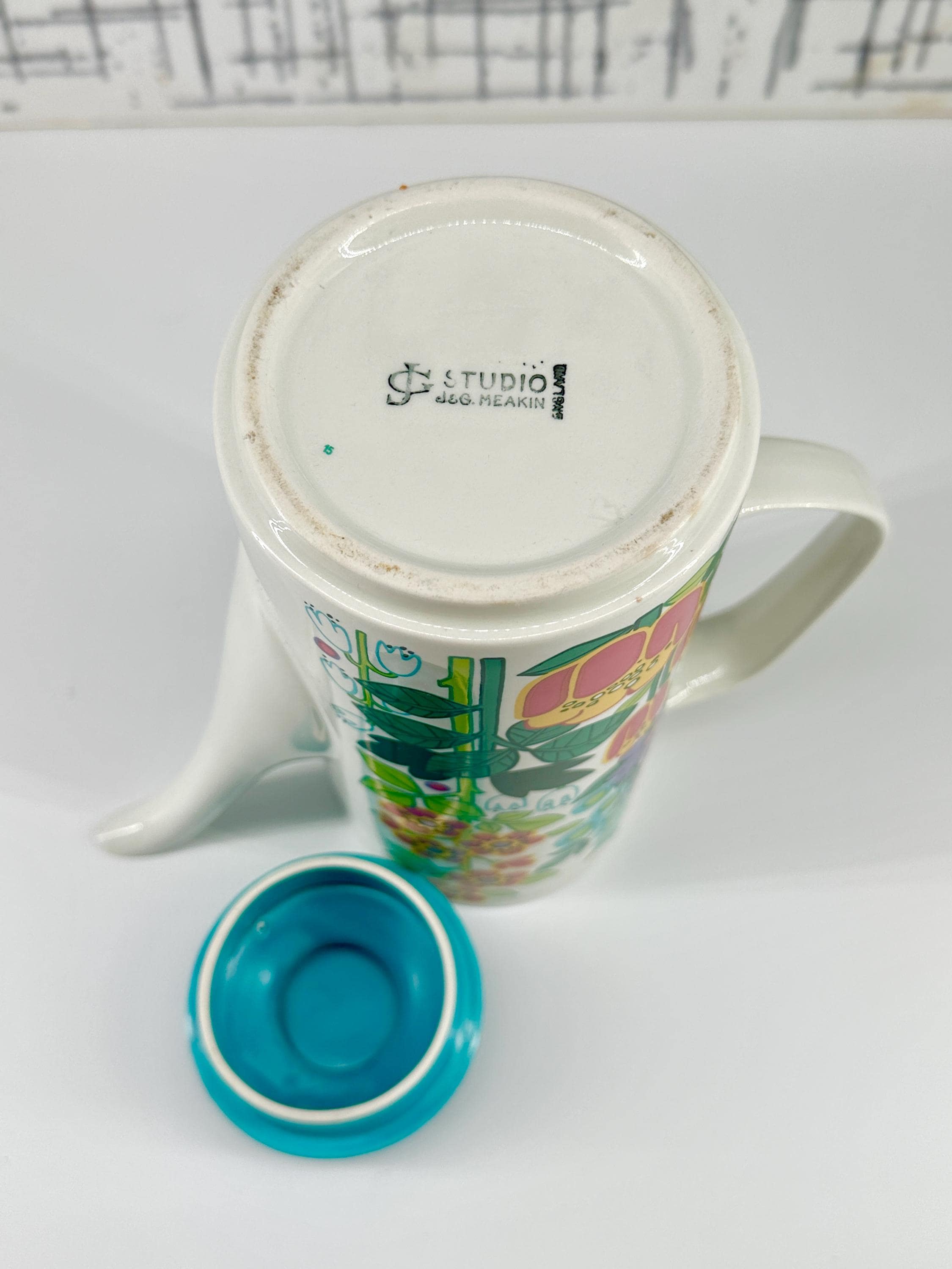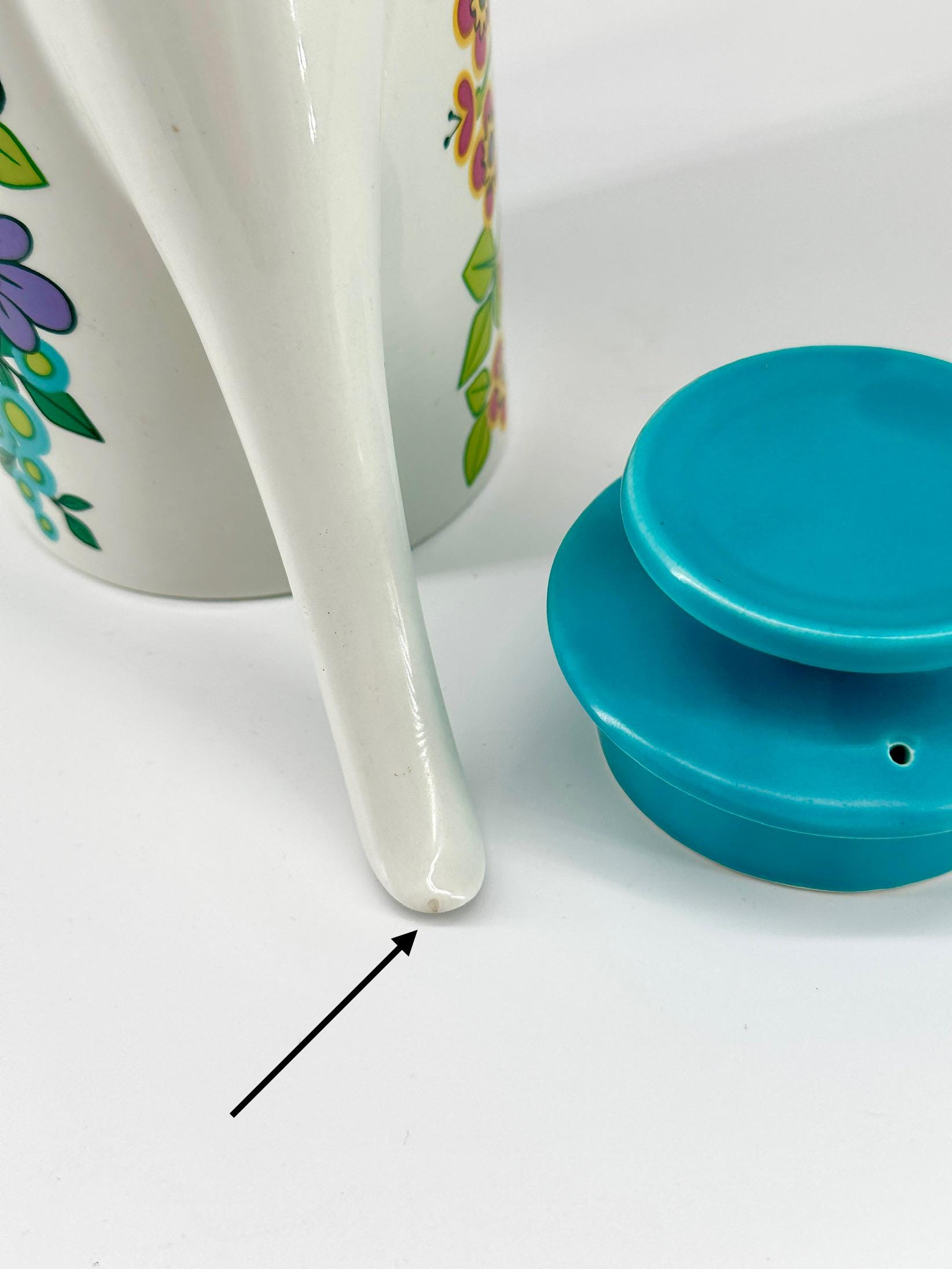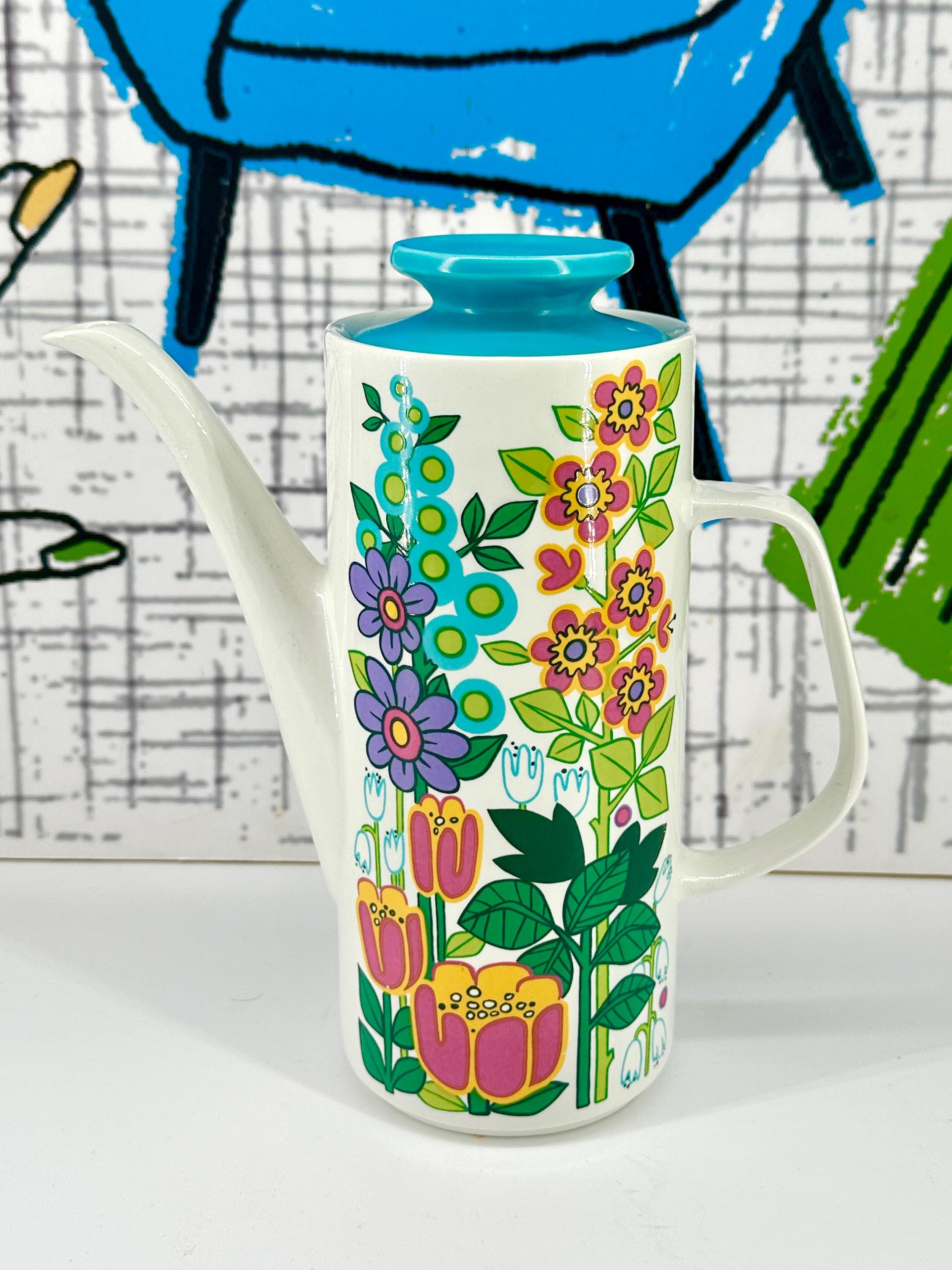 Extremely rare and sought after, this is the holy grail for J&G Meakin collectors. A white ceramic coffee pot with lively brightly coloured flower power transfer print to both sides of pot. Lid is plain turquoise. Printed maker's mark to base.