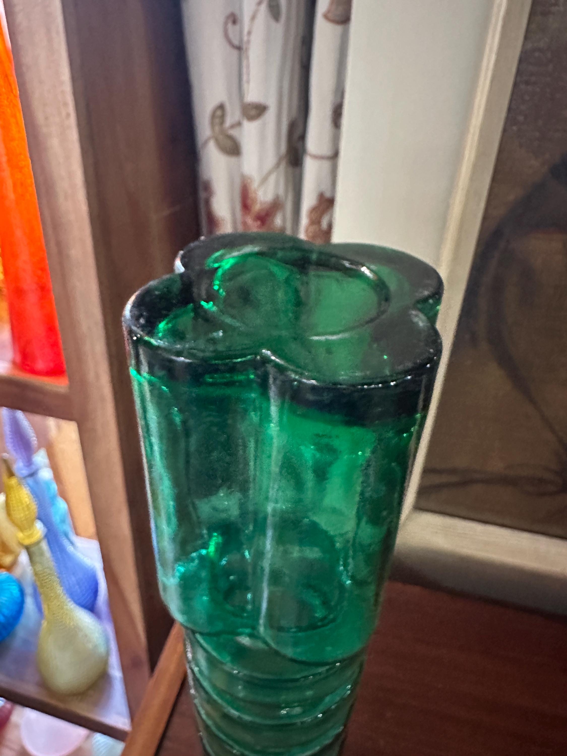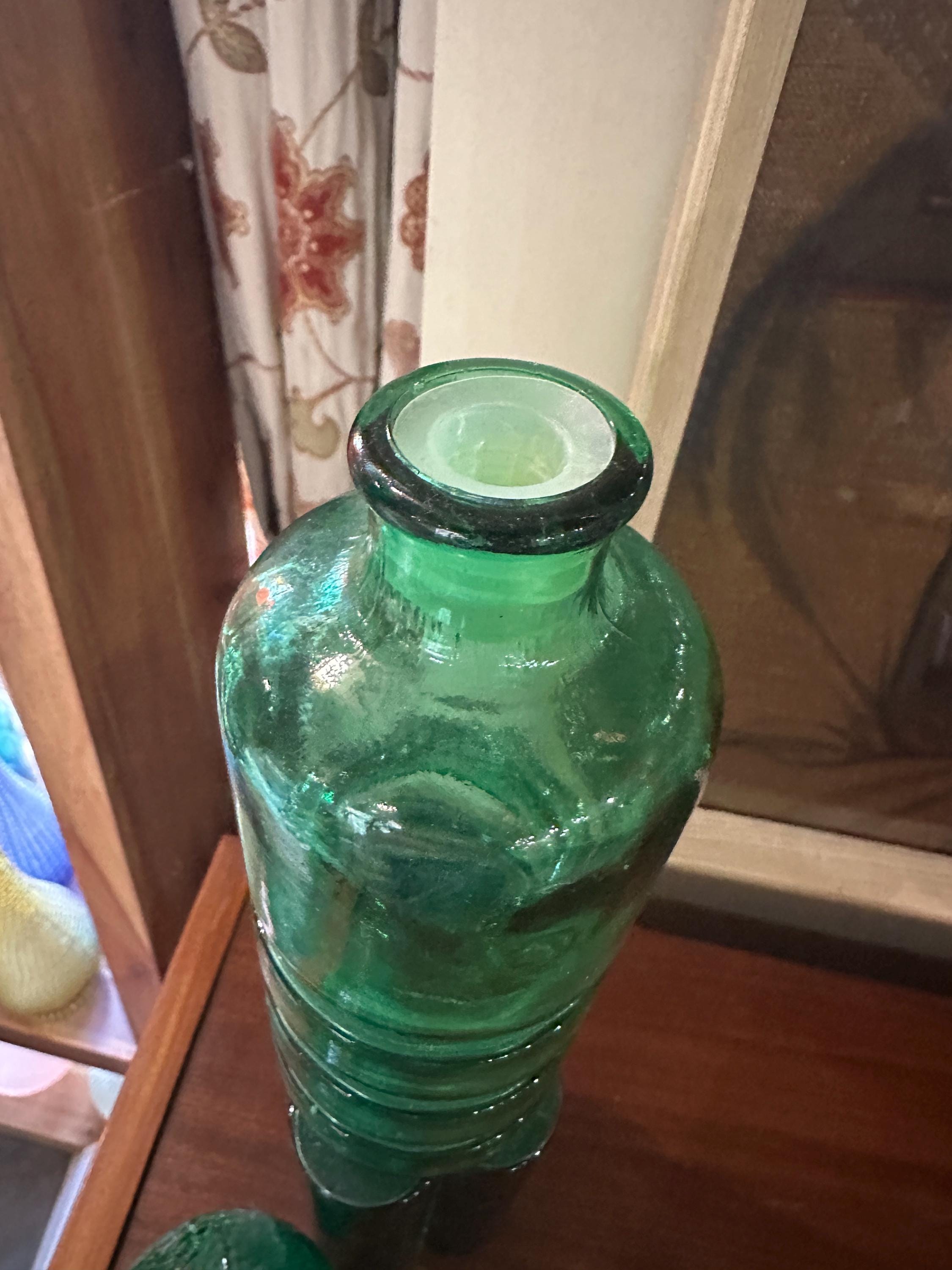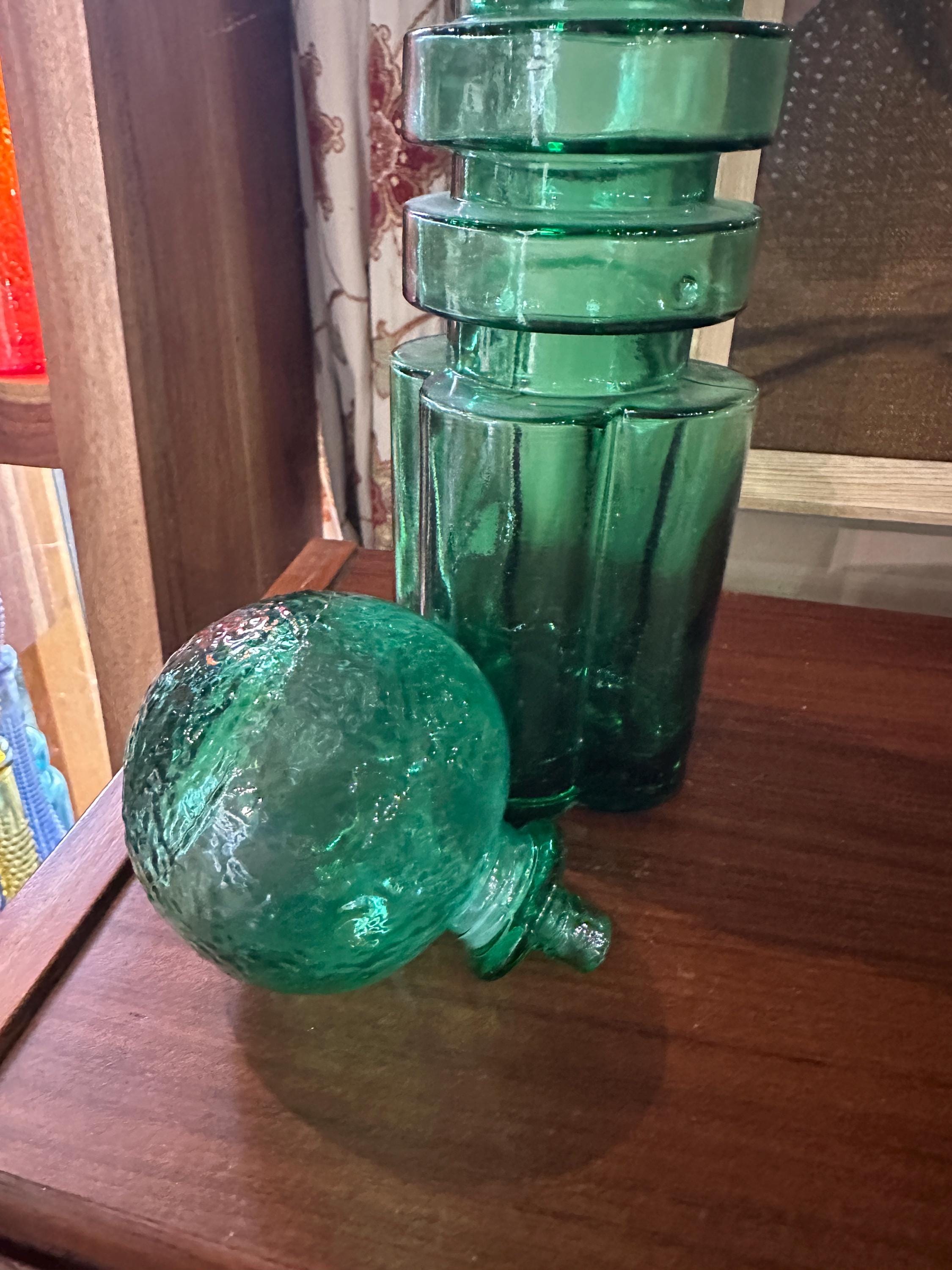 Vintage Italian Quatrefoil style green glass genie bottle decanter, made in the Empoli region of Italy near Florence.