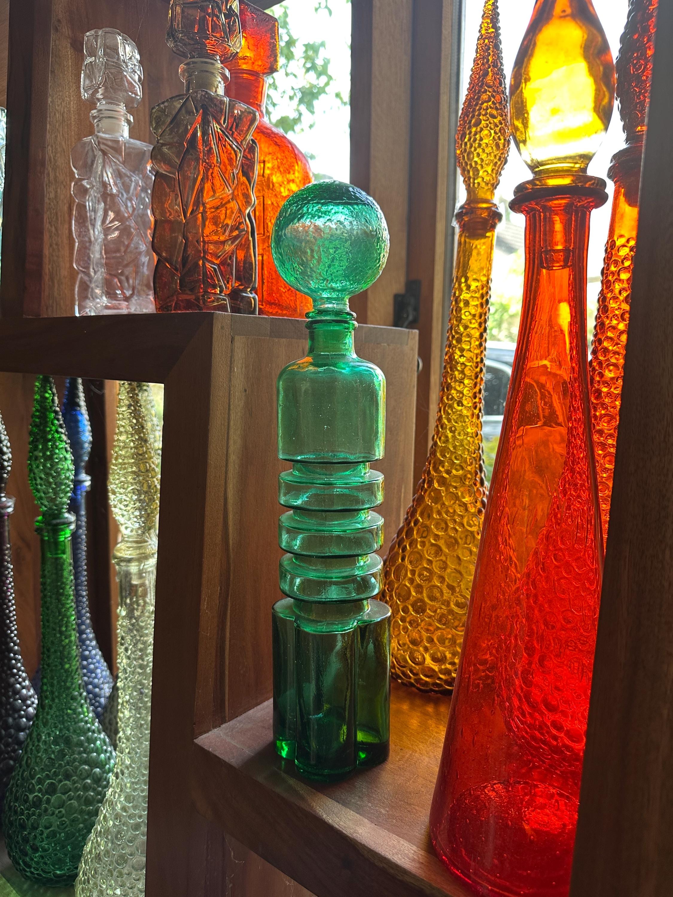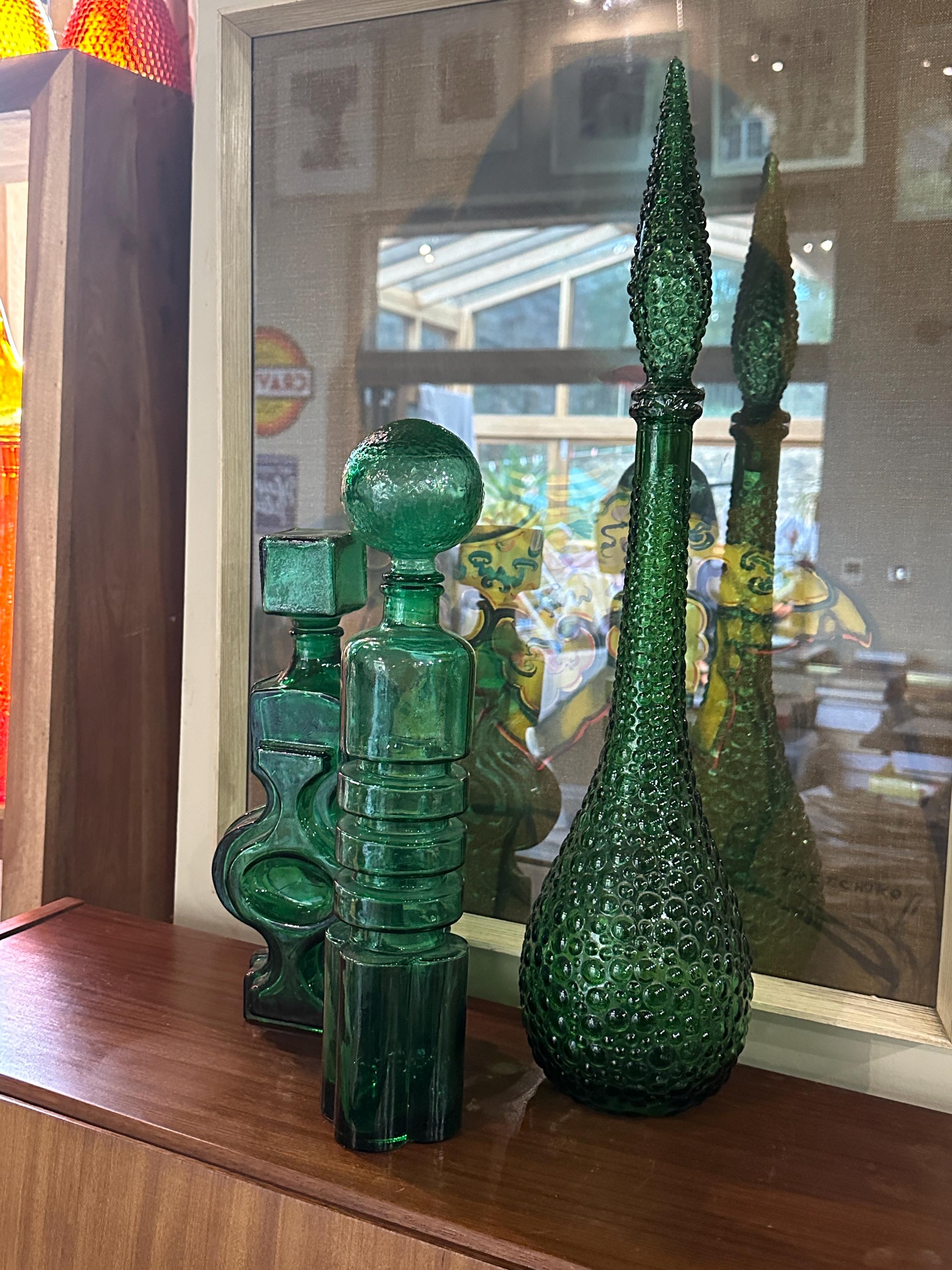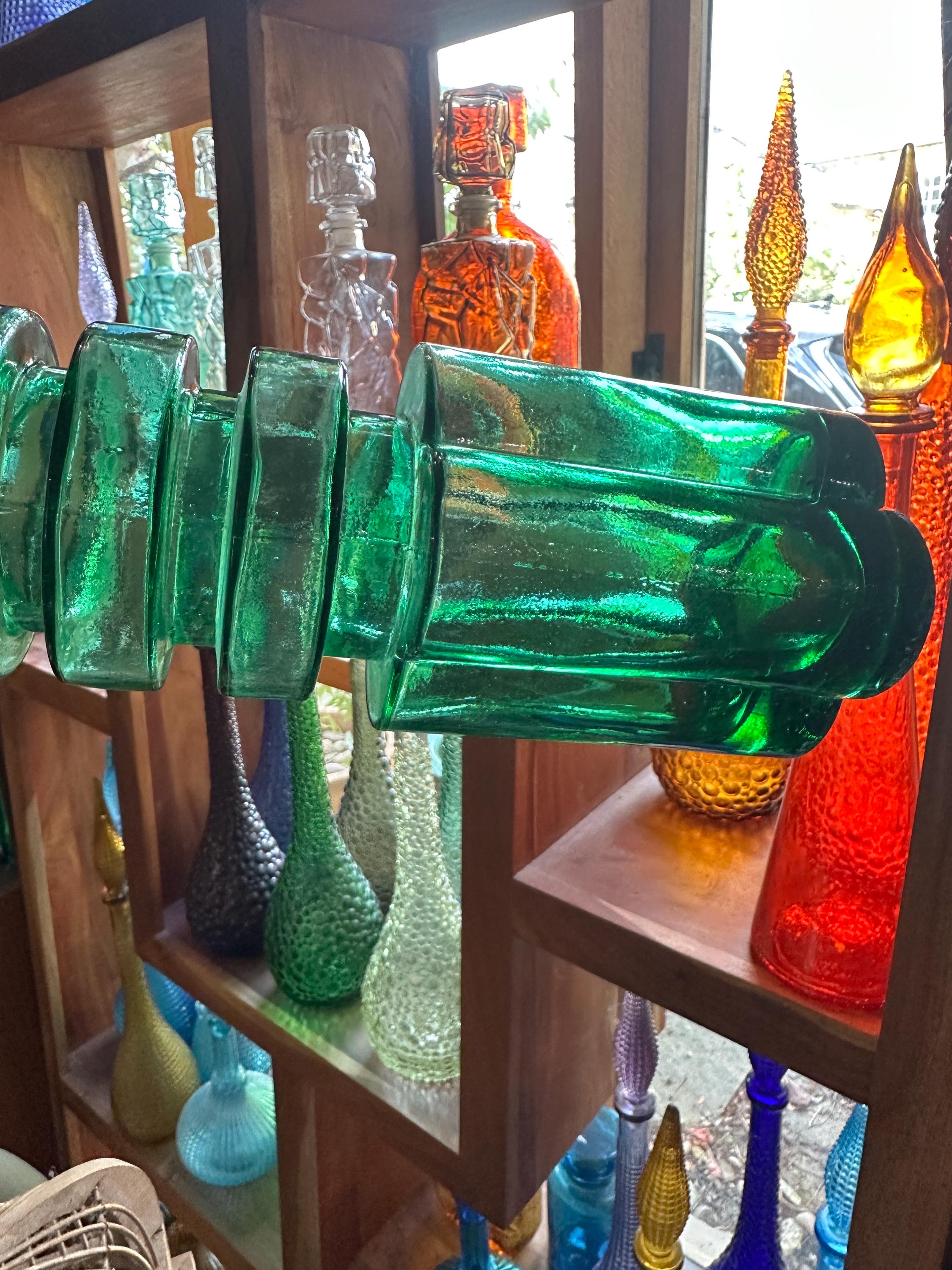 Vintage Italian Quatrefoil style green glass genie bottle decanter, made in the Empoli region of Italy near Florence.
