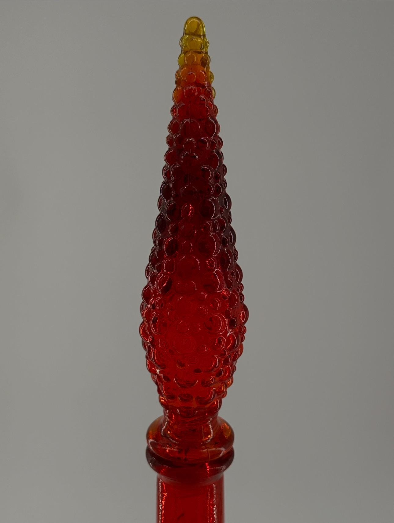 Amberina Red £685 - rare and beautiful bottle featuring tones of mostly red, with orange and golden yellow at the tip of the stopper. Unmarked to base. Plastic insulation to stopper is present and holds firm.