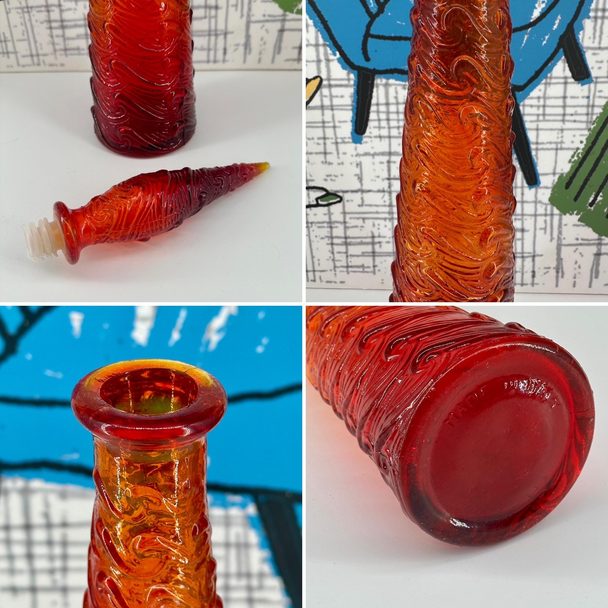 Gloriously rare amberina featuring a spectrum of red and orange colours with a touch of yellow to the stopper tip. 'Made In Italy' stamped to base. Plastic insulation still present on stopper shaft, it is split but still holds the stopper firmly.