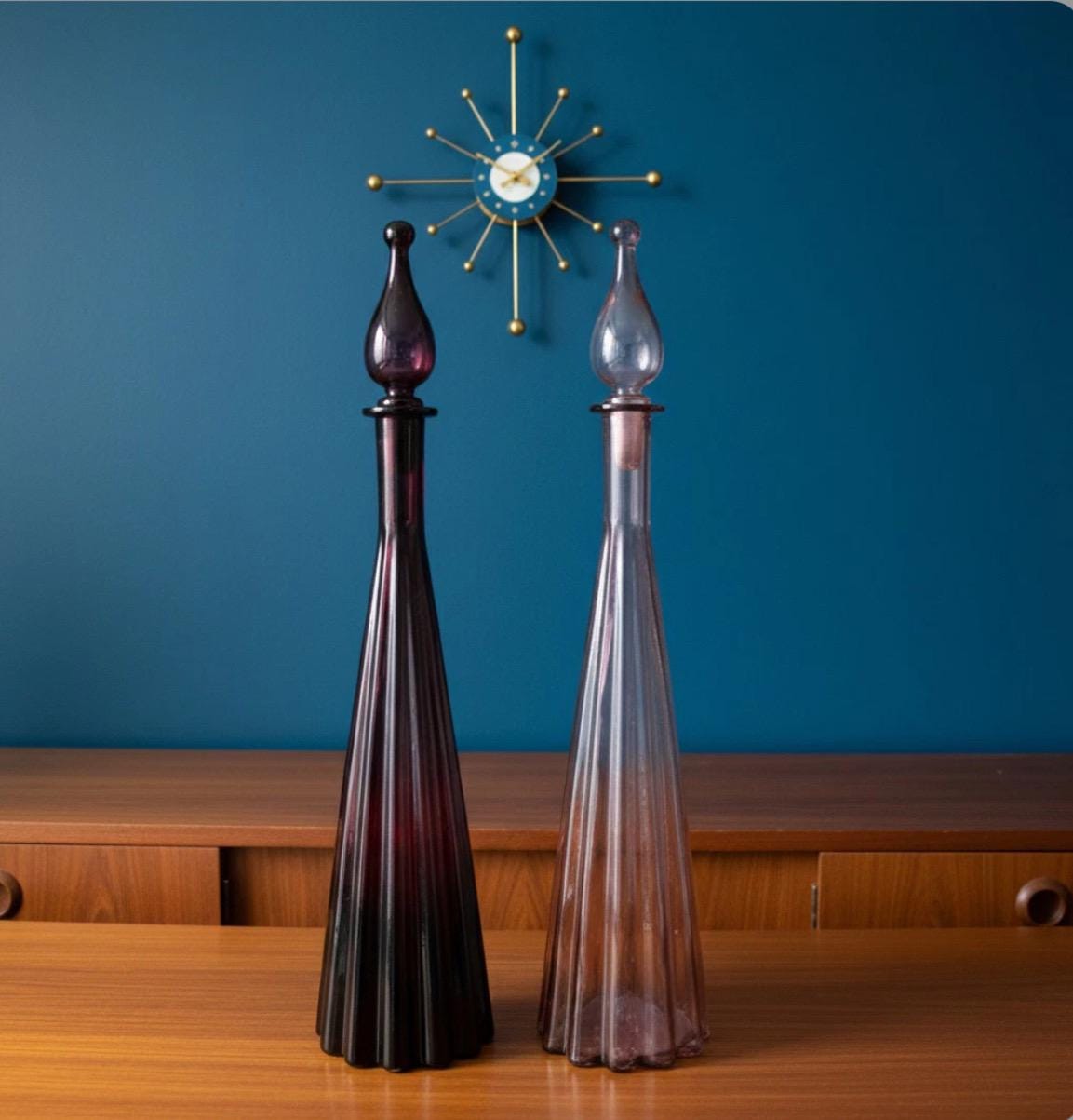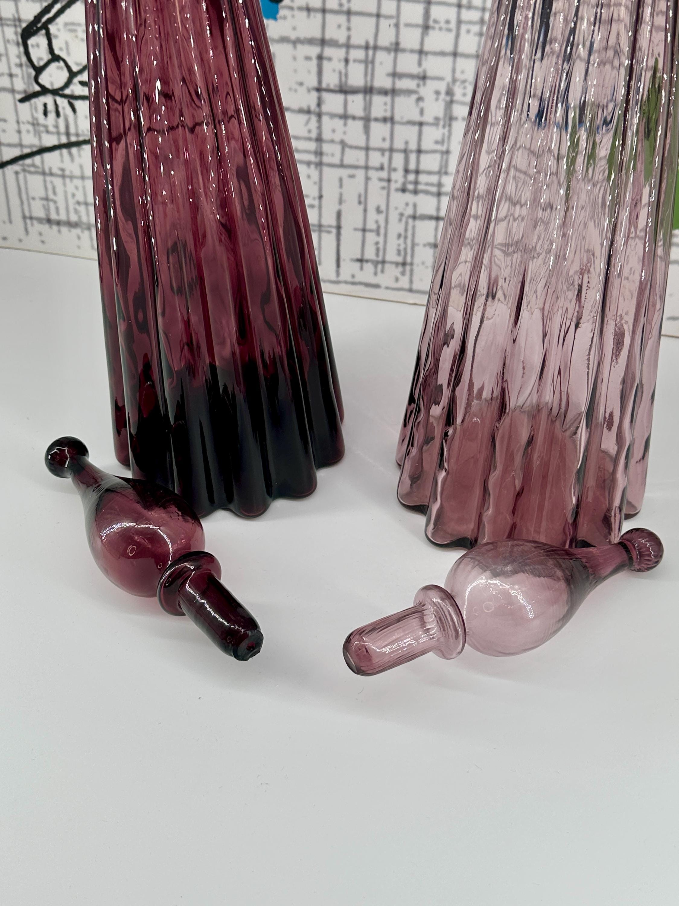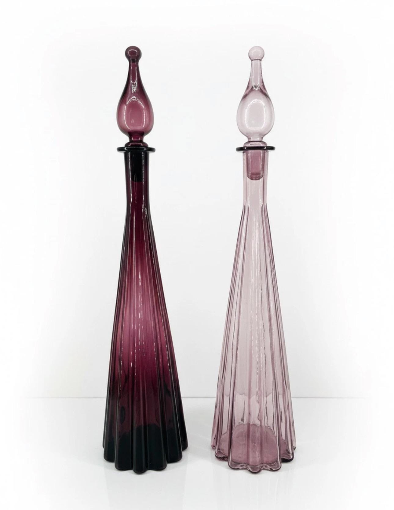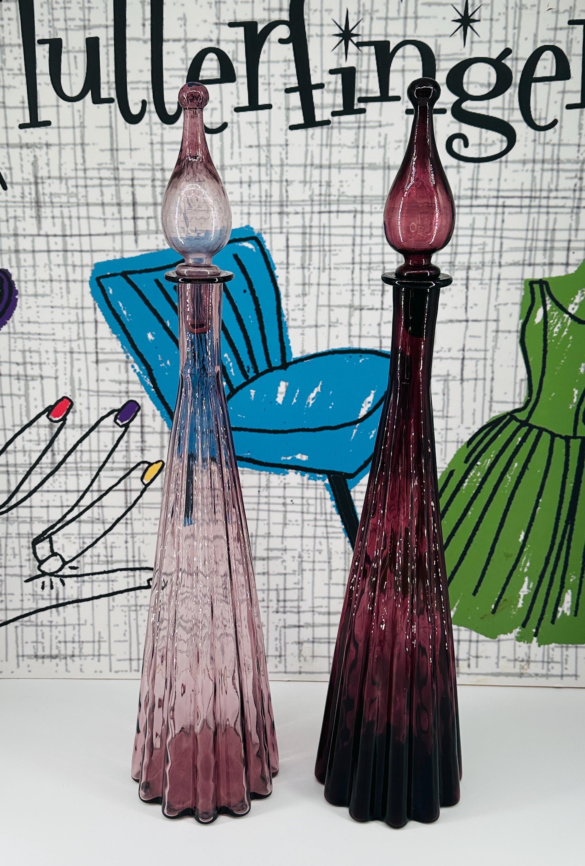 Fluted bobble-top optical genie bottles in purple and lilac.