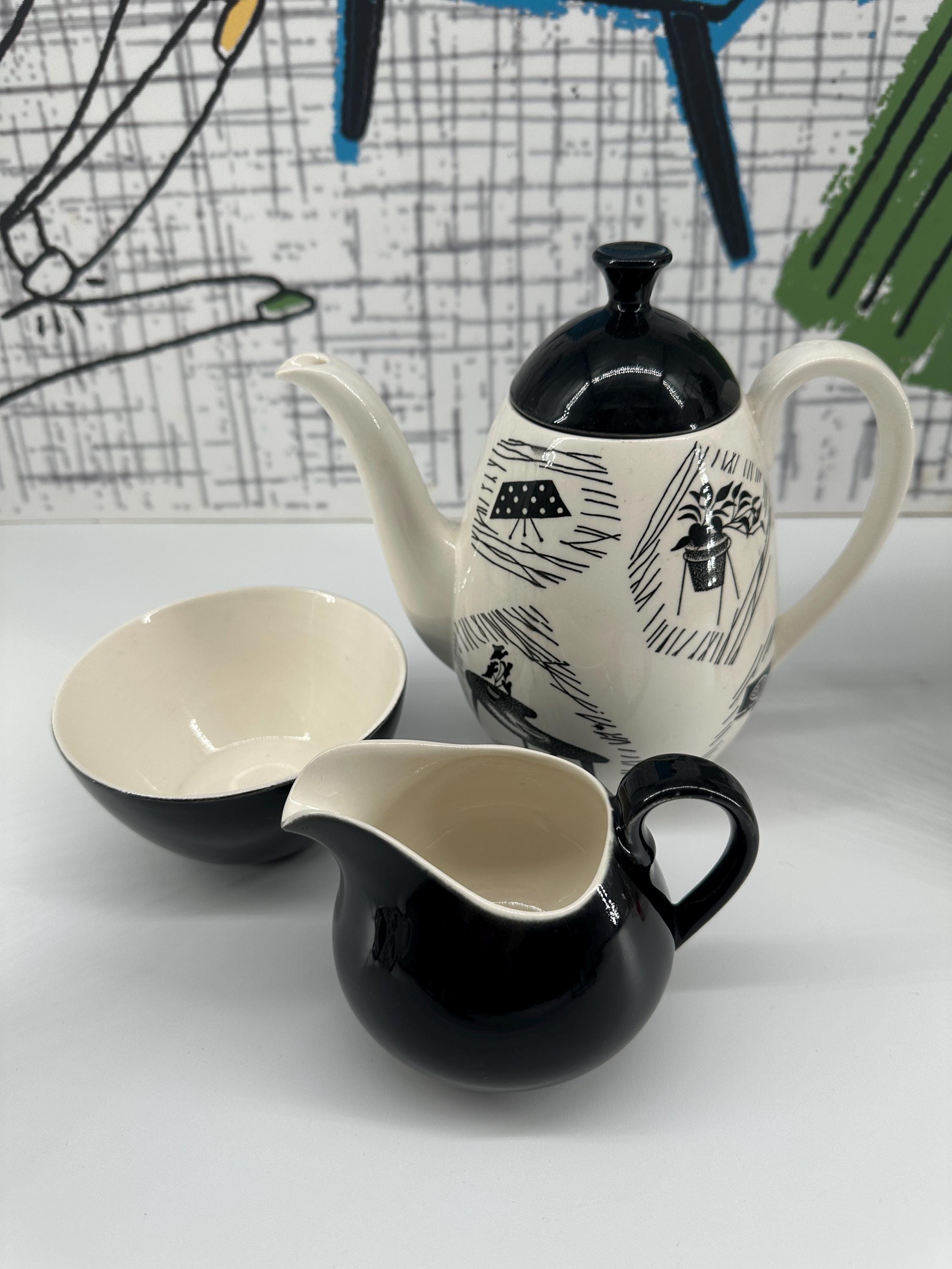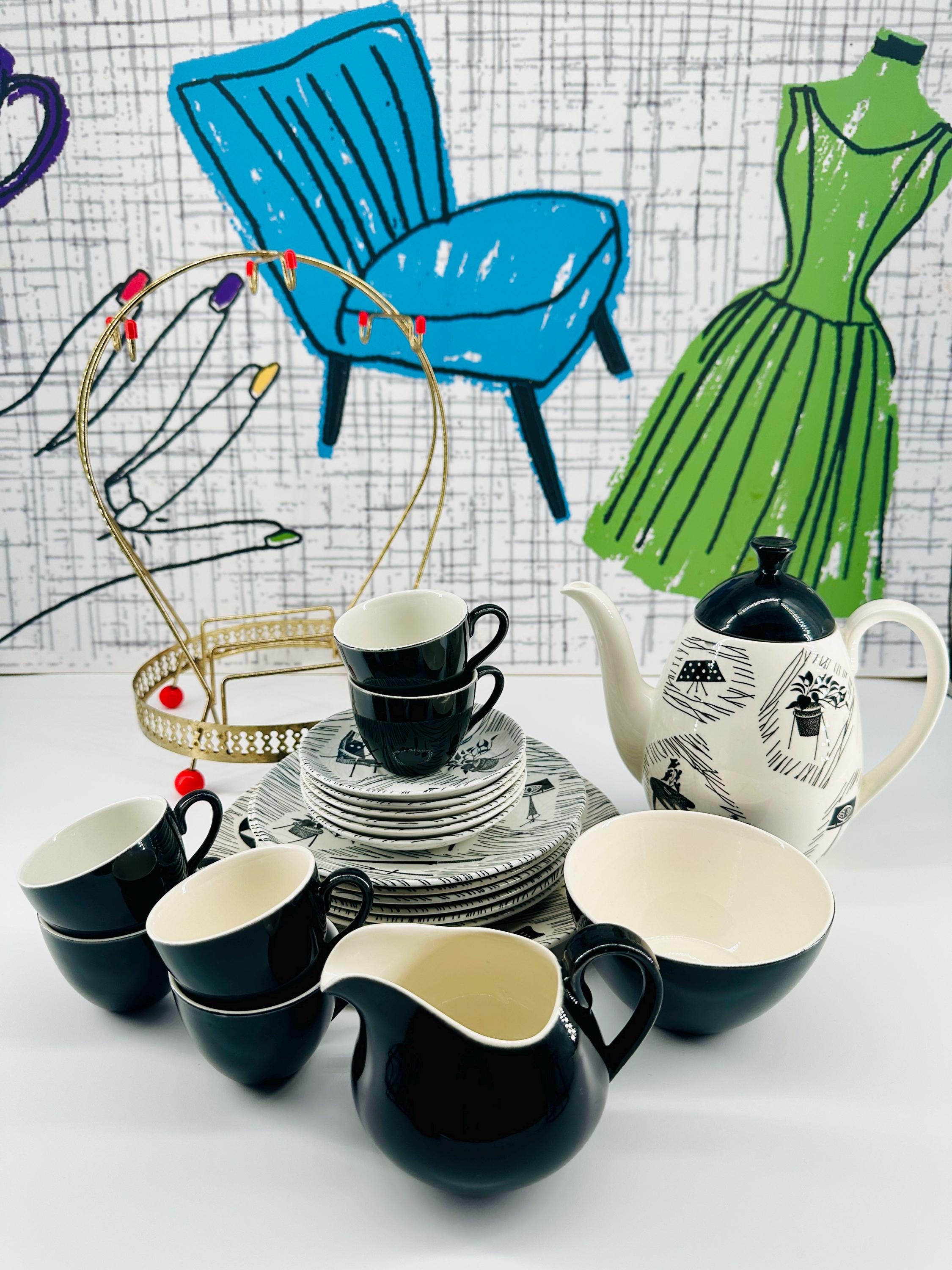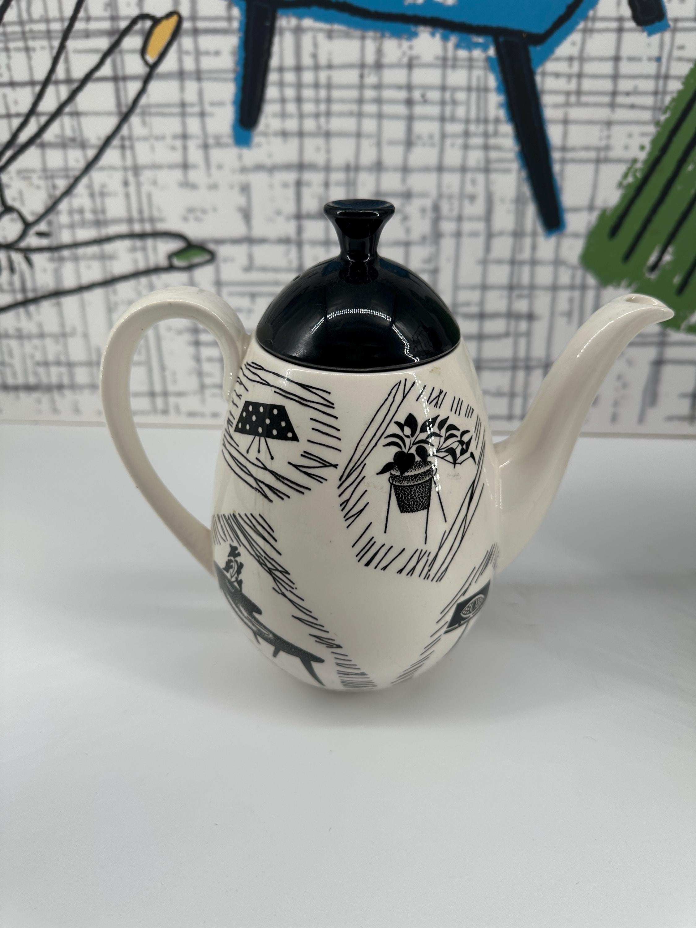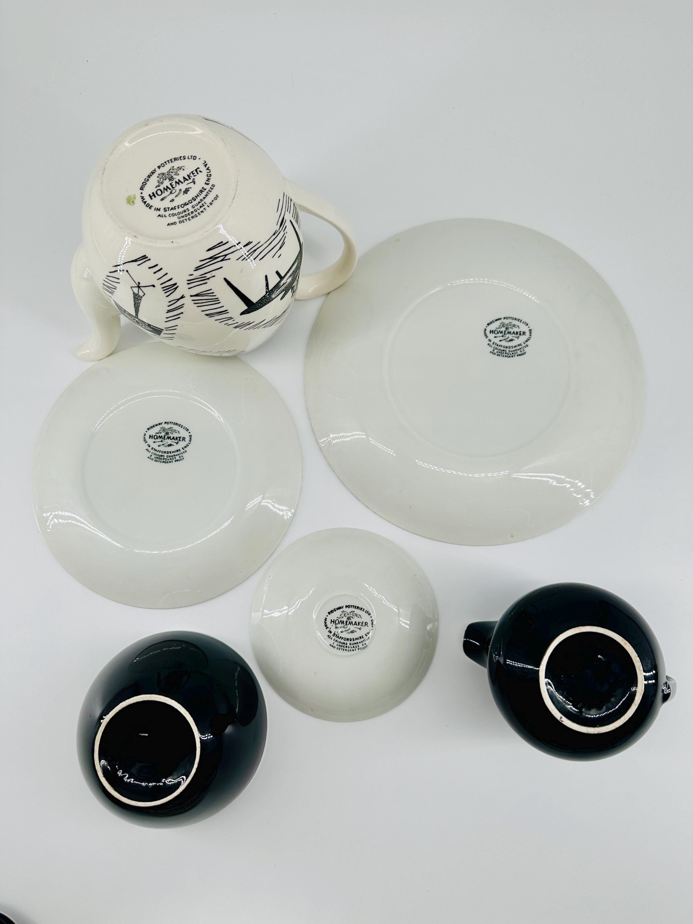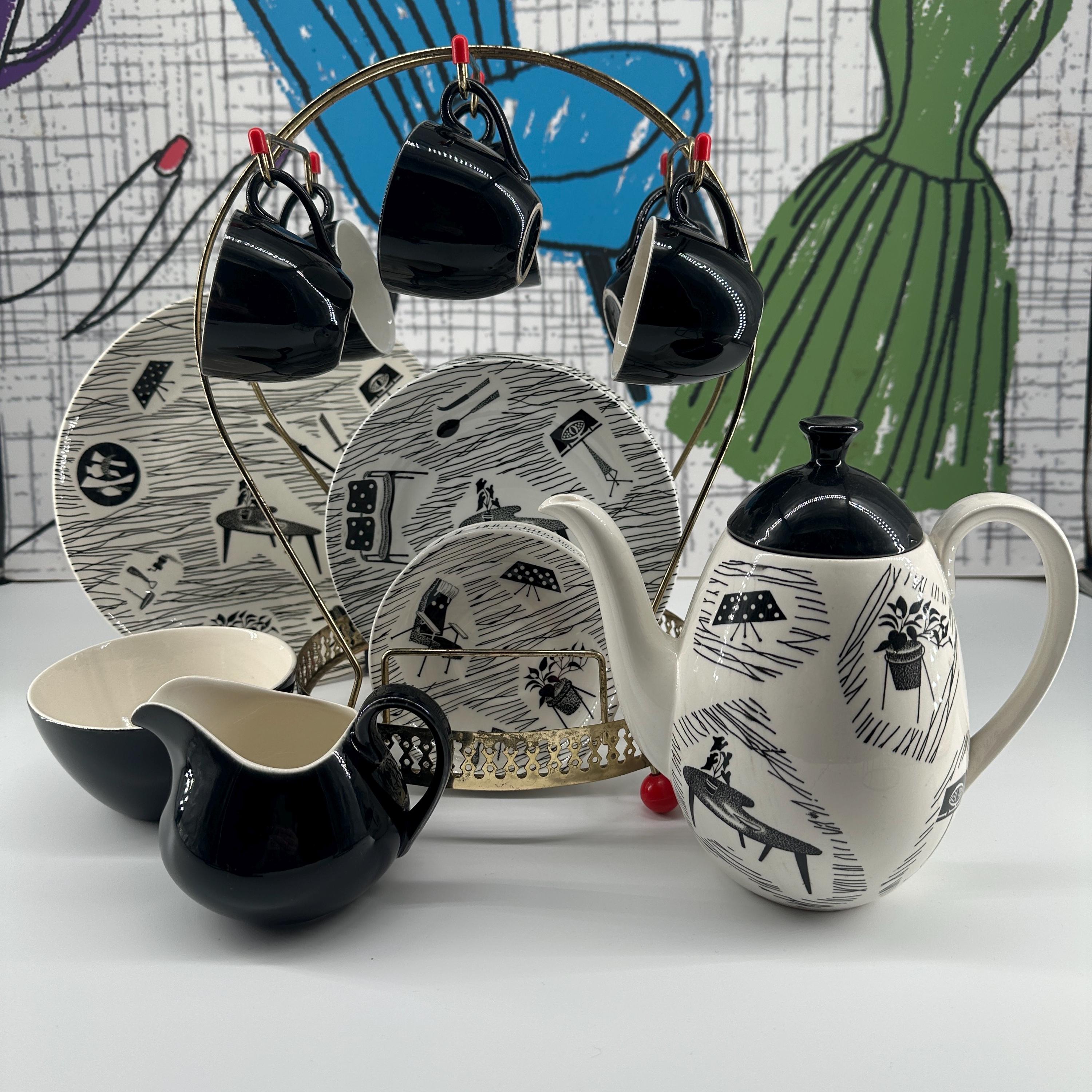 The iconic Homemaker monochrome pattern of abstract lines and mid-century furniture pieces, designed in the 1950s by Enid Seeney, on pottery shapes designed by Tom Arnold. Famously sold by the piece as budget chinaware in Woolworths stores in the UK, and hugely popular throughout the 50s and 60s. Now highly sought after by collectors and lovers of mid-century style.
