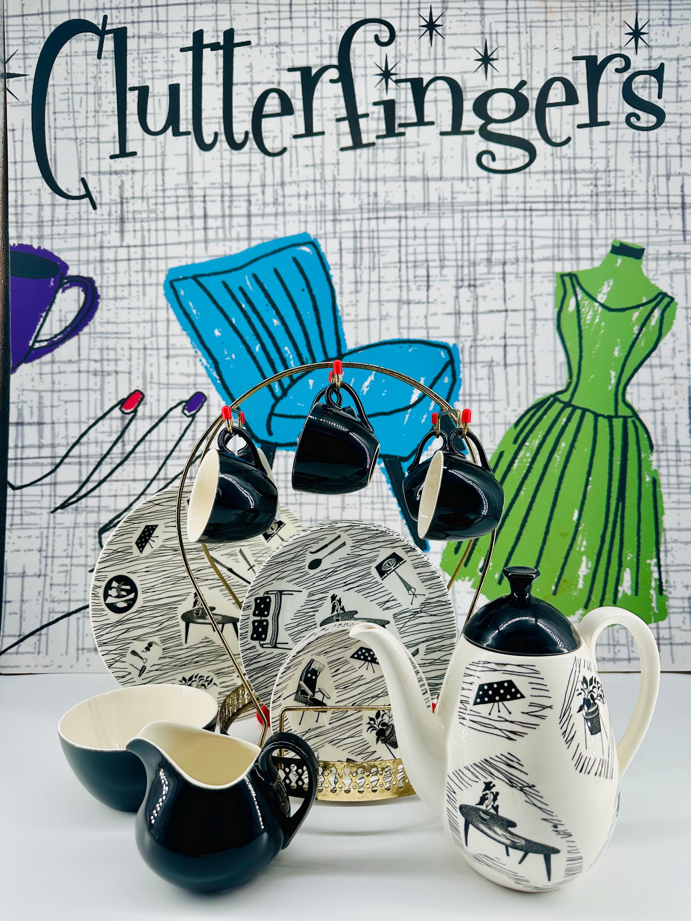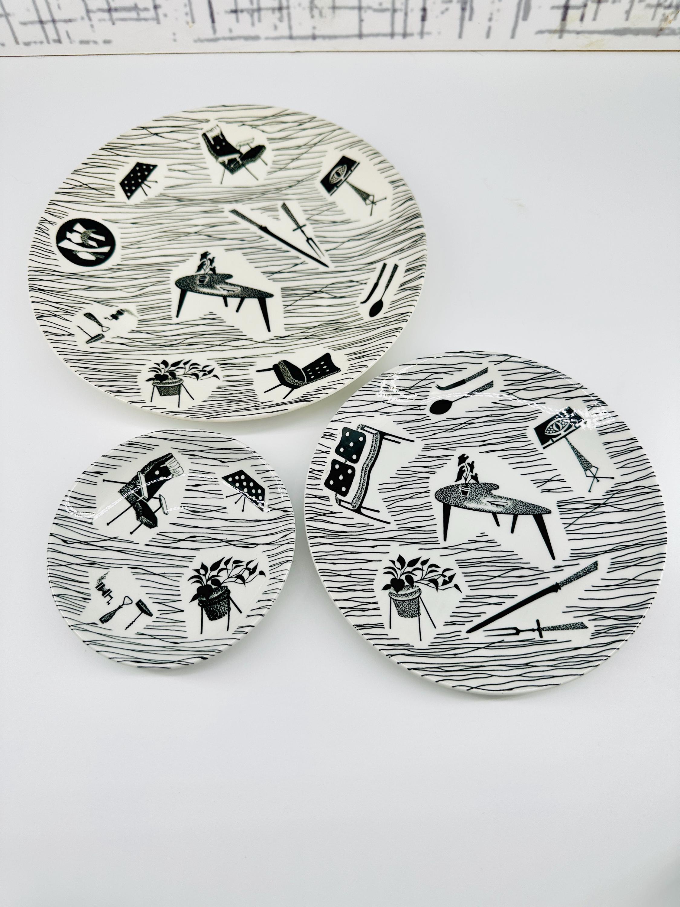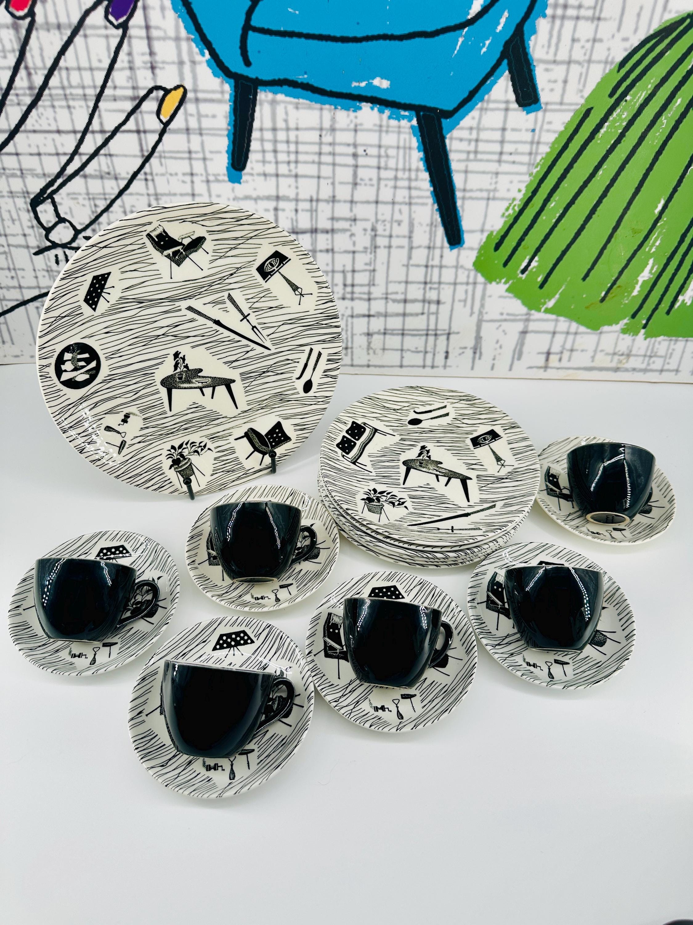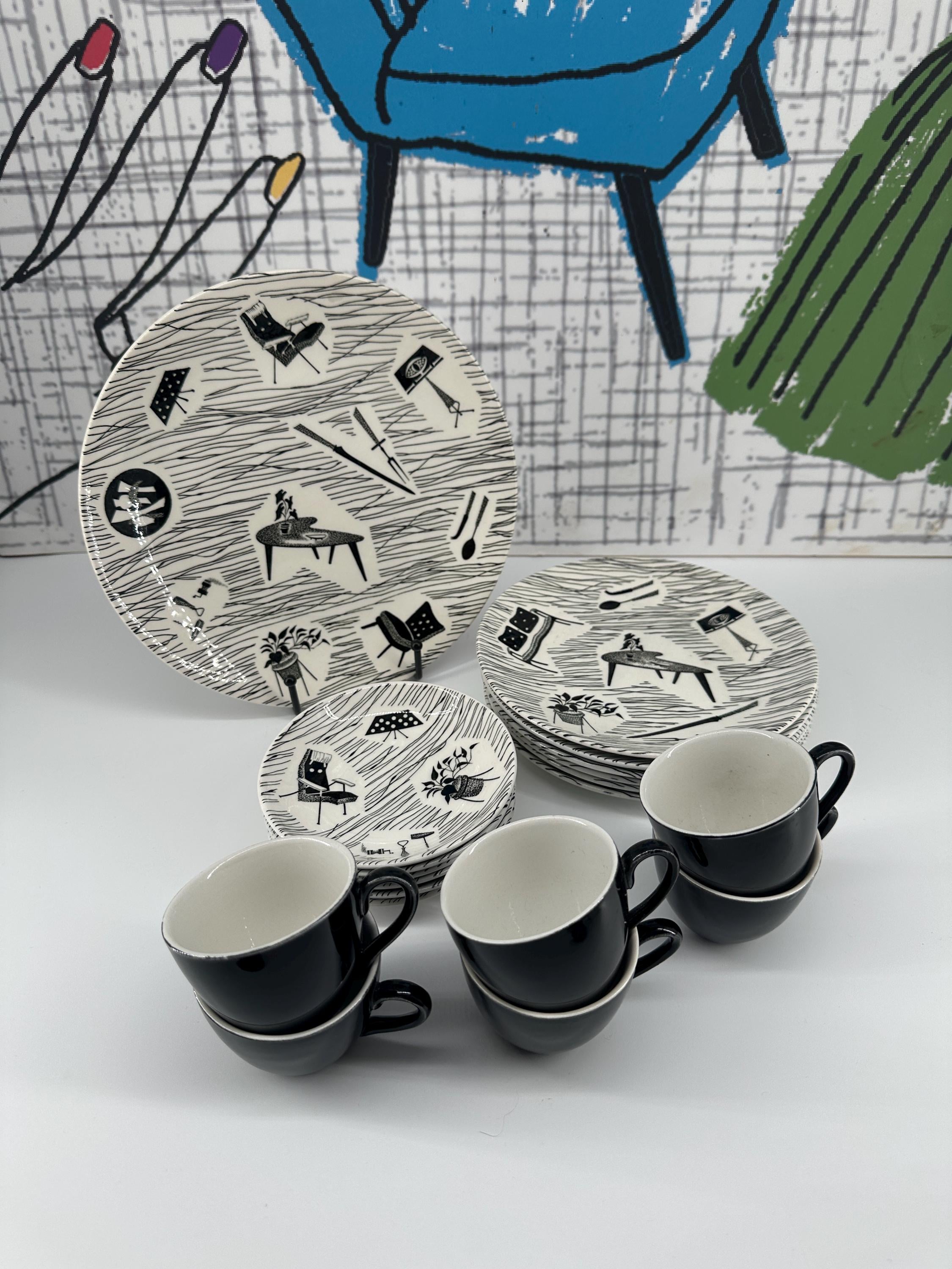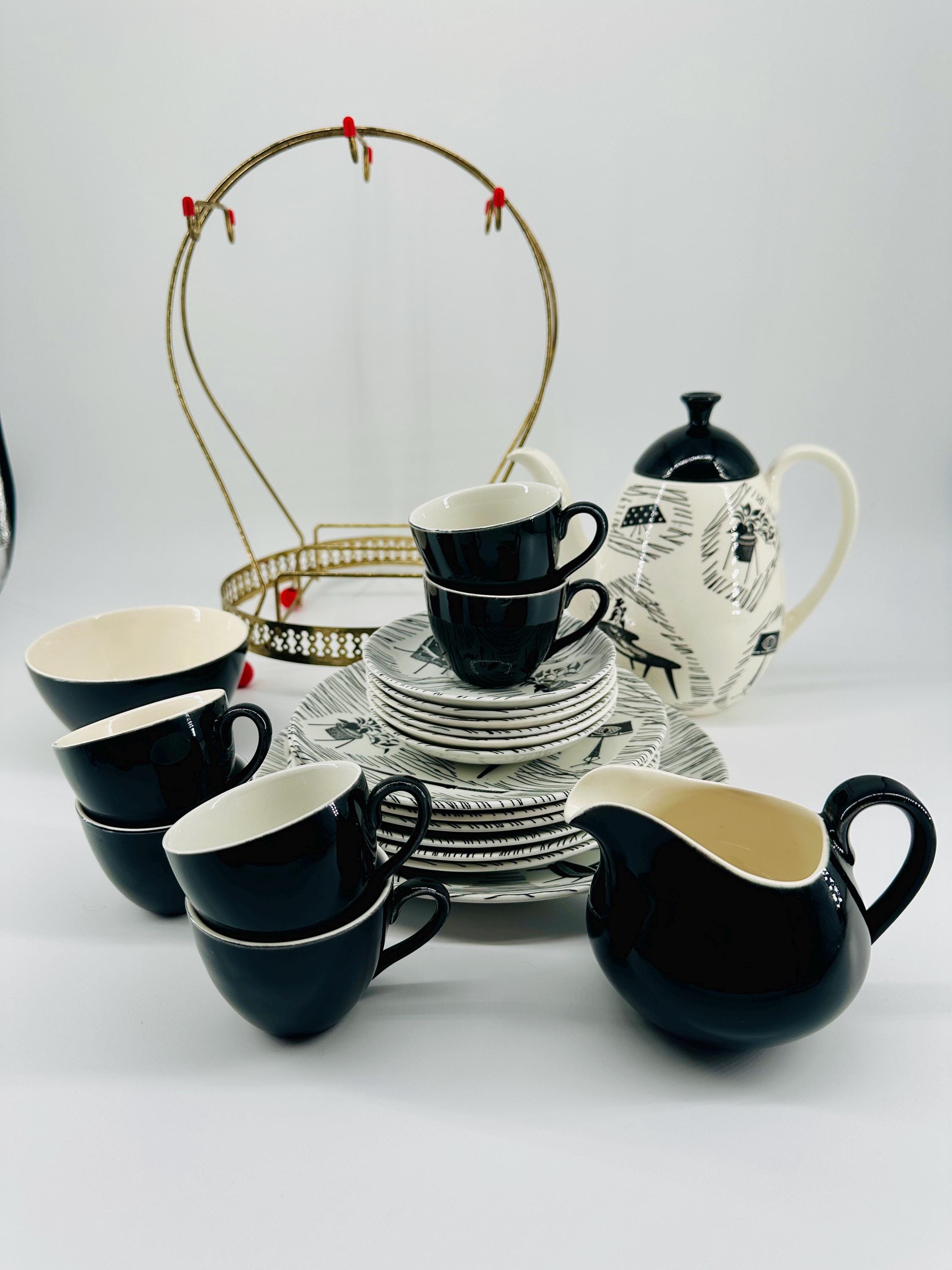 The iconic Homemaker monochrome pattern of abstract lines and mid-century furniture pieces, designed in the 1950s by Enid Seeney, on pottery shapes designed by Tom Arnold. Famously sold by the piece as budget chinaware in Woolworths stores in the UK, and hugely popular throughout the 50s and 60s. Now highly sought after by collectors and lovers of mid-century style.