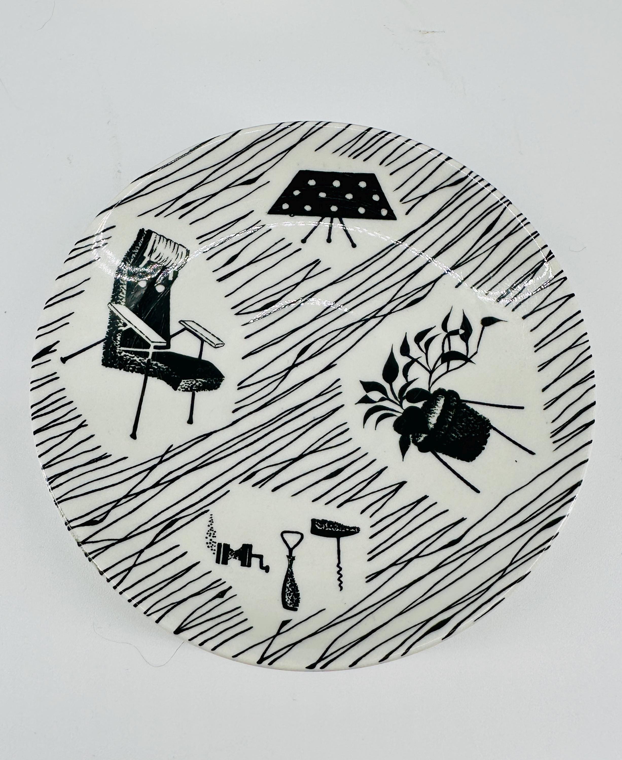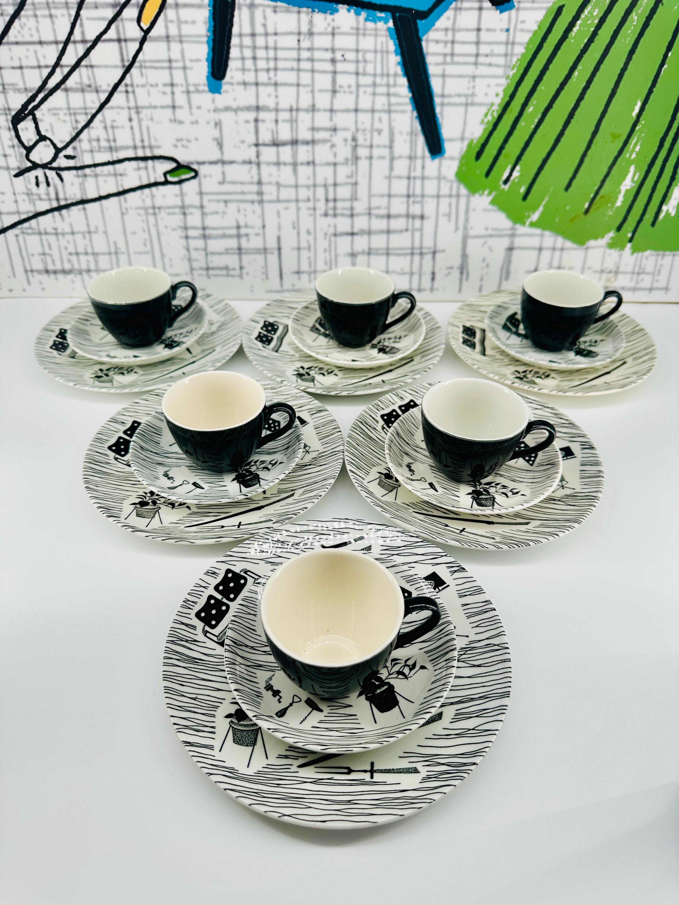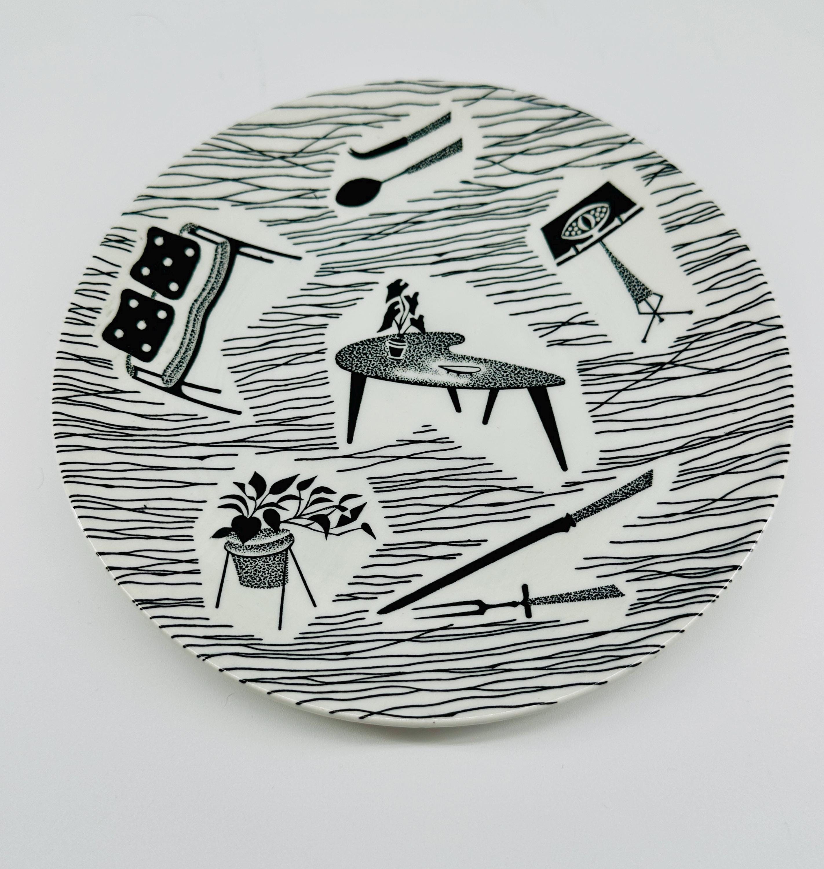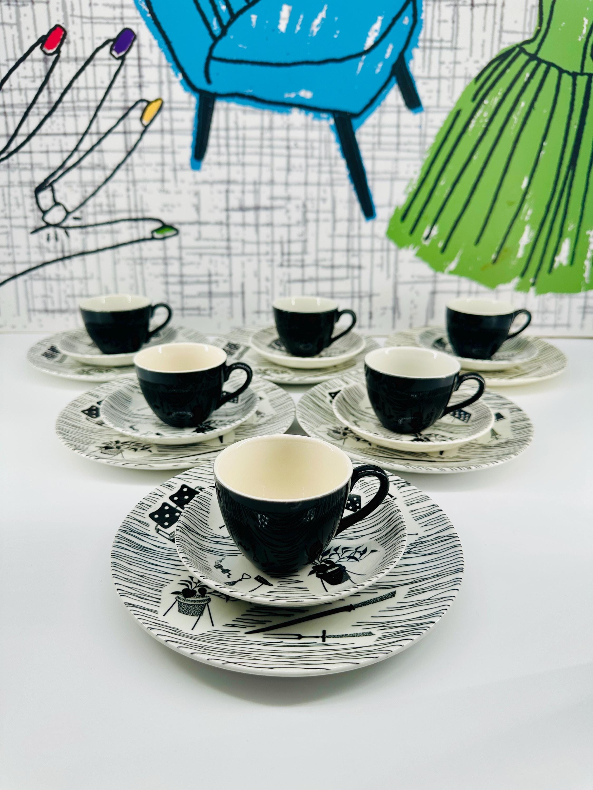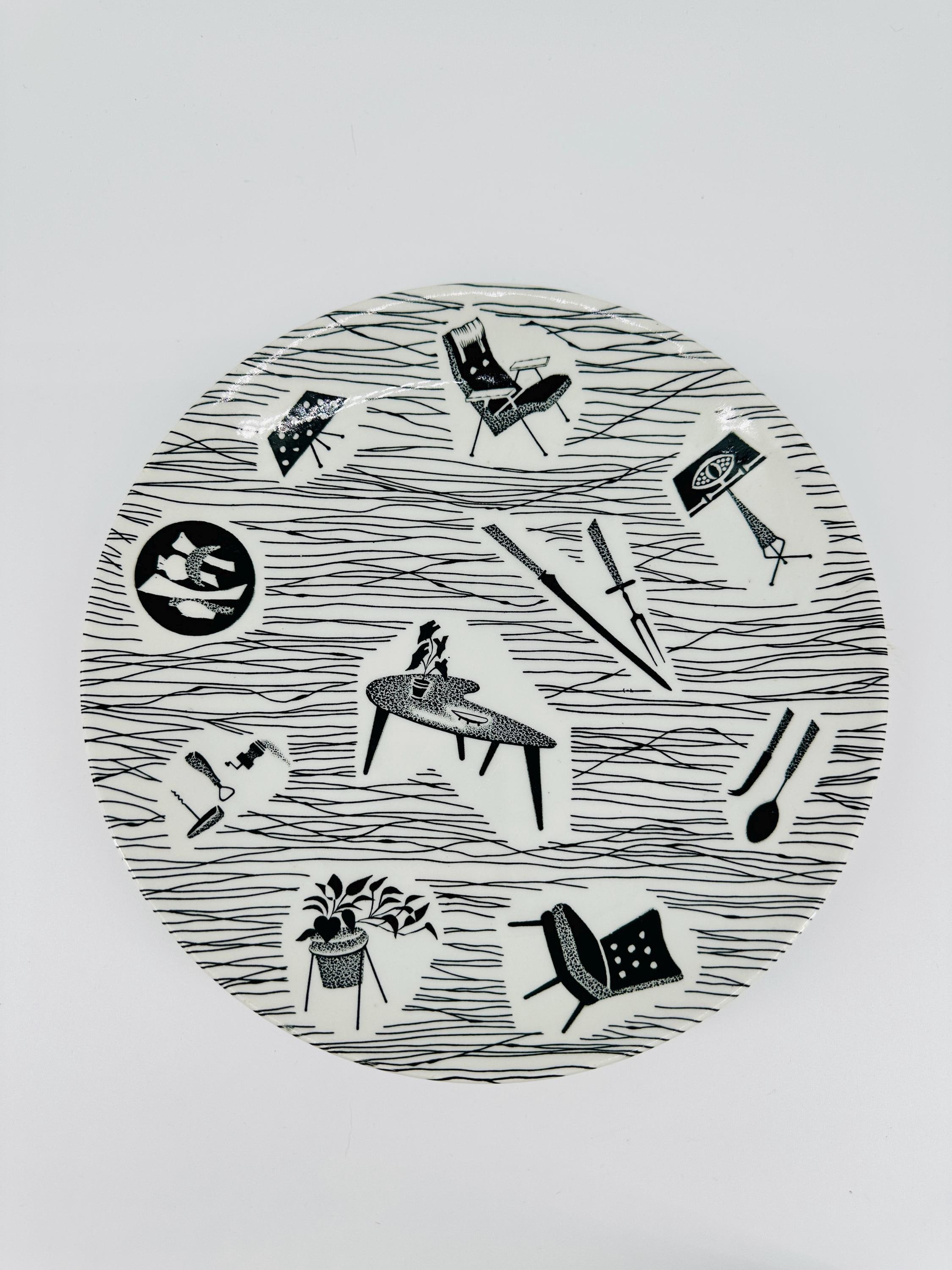 The iconic Homemaker monochrome pattern of abstract lines and mid-century furniture pieces, designed in the 1950s by Enid Seeney, on pottery shapes designed by Tom Arnold. Famously sold by the piece as budget chinaware in Woolworths stores in the UK, and hugely popular throughout the 50s and 60s. Now highly sought after by collectors and lovers of mid-century style.