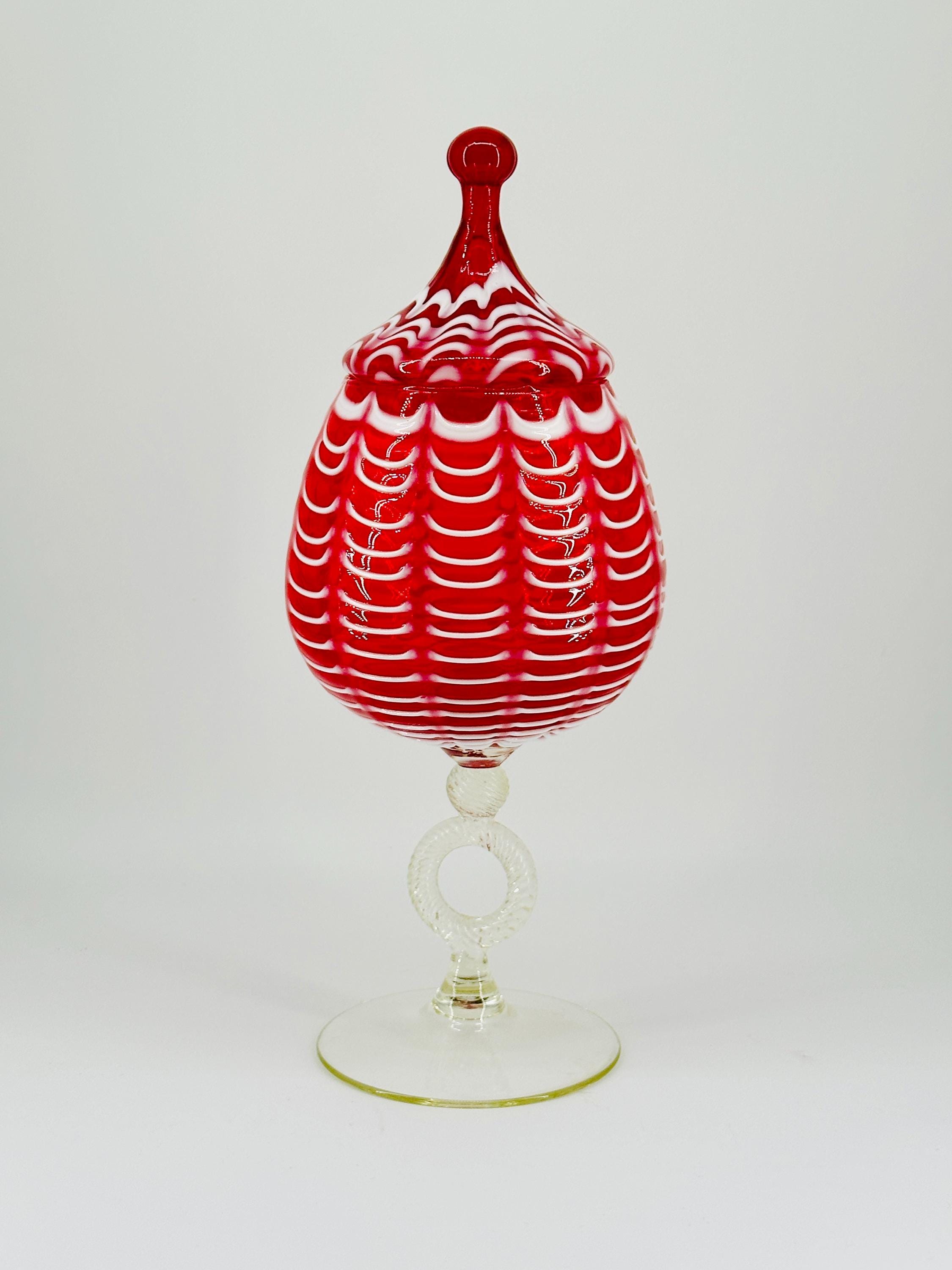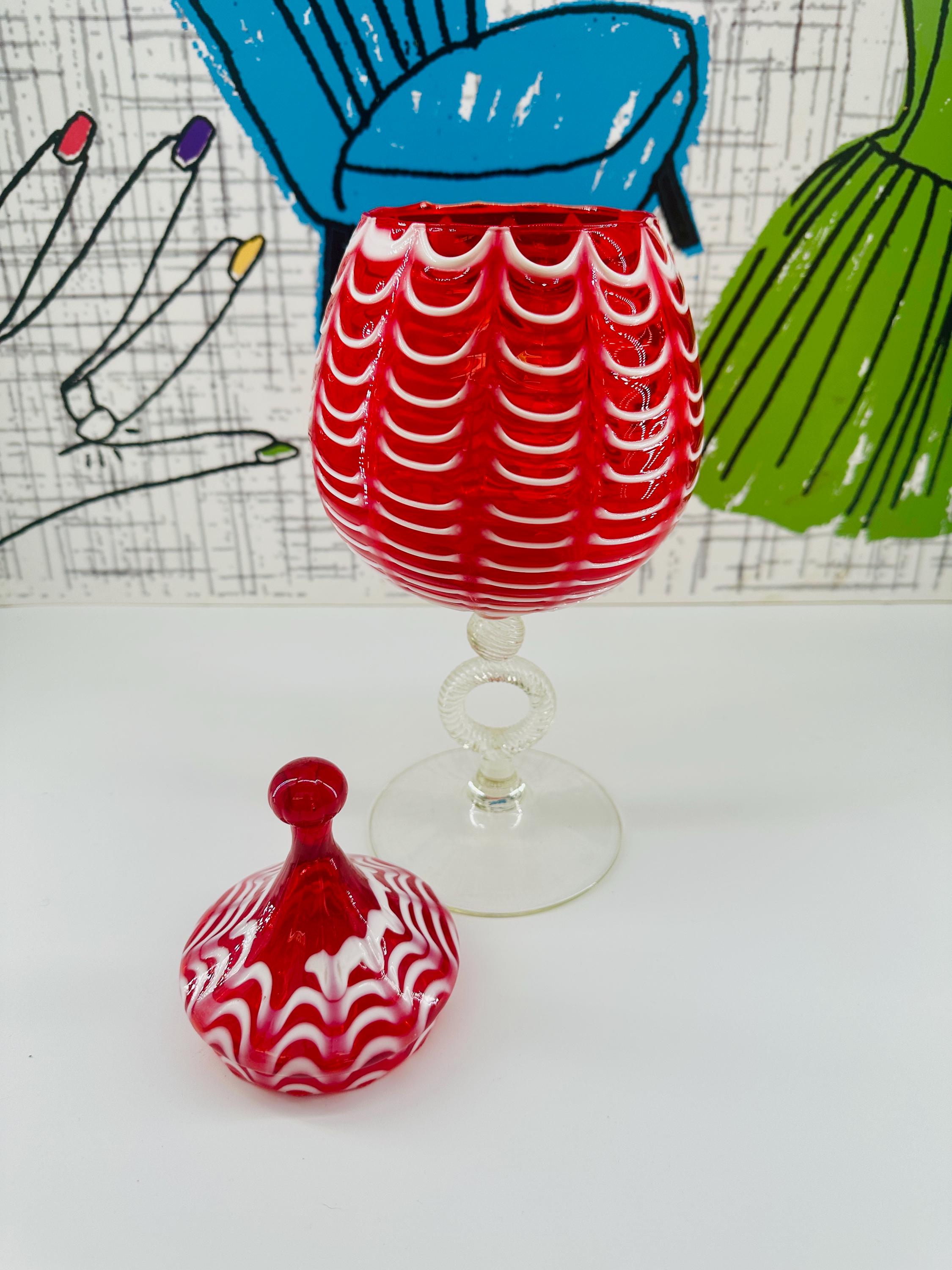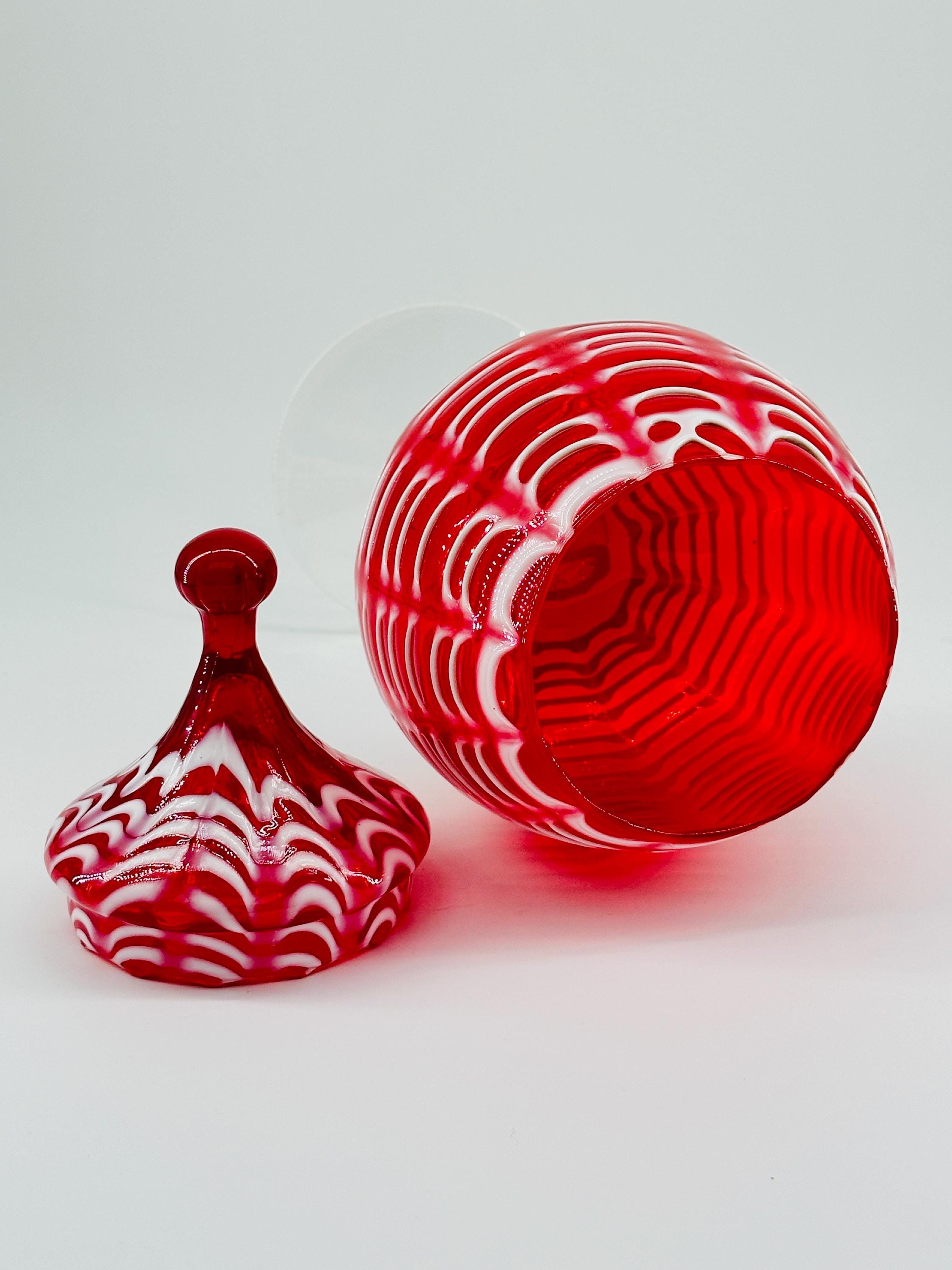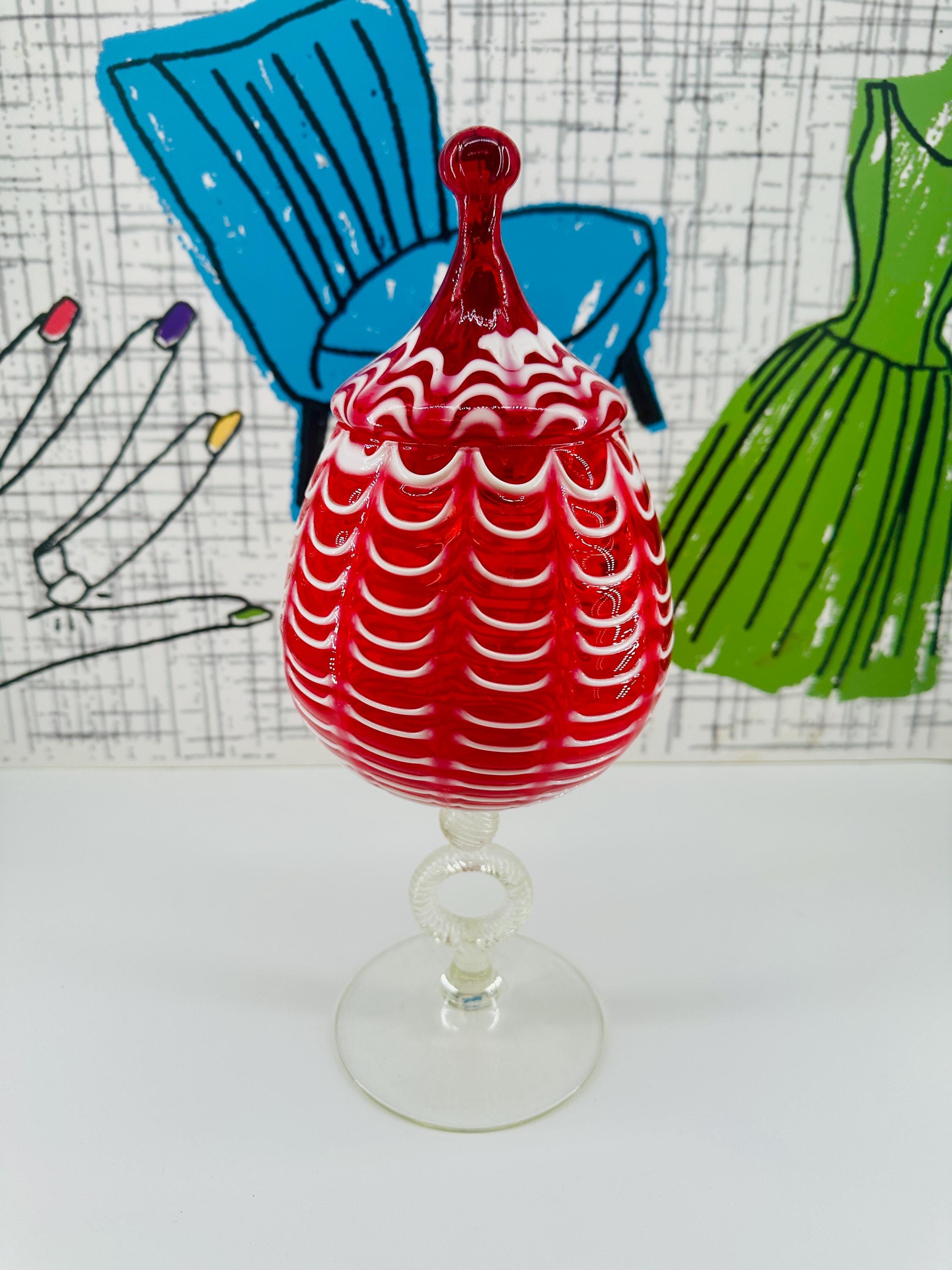 Empoli Fenicio Bonbonniere - Red and White Large Vintage Italian Apothecary Bonbon Jar with Circus Tent Lid and Swagged Lattimo Decoration. Wonderful to hold sweets and candies, or to display in a window at Christmas.