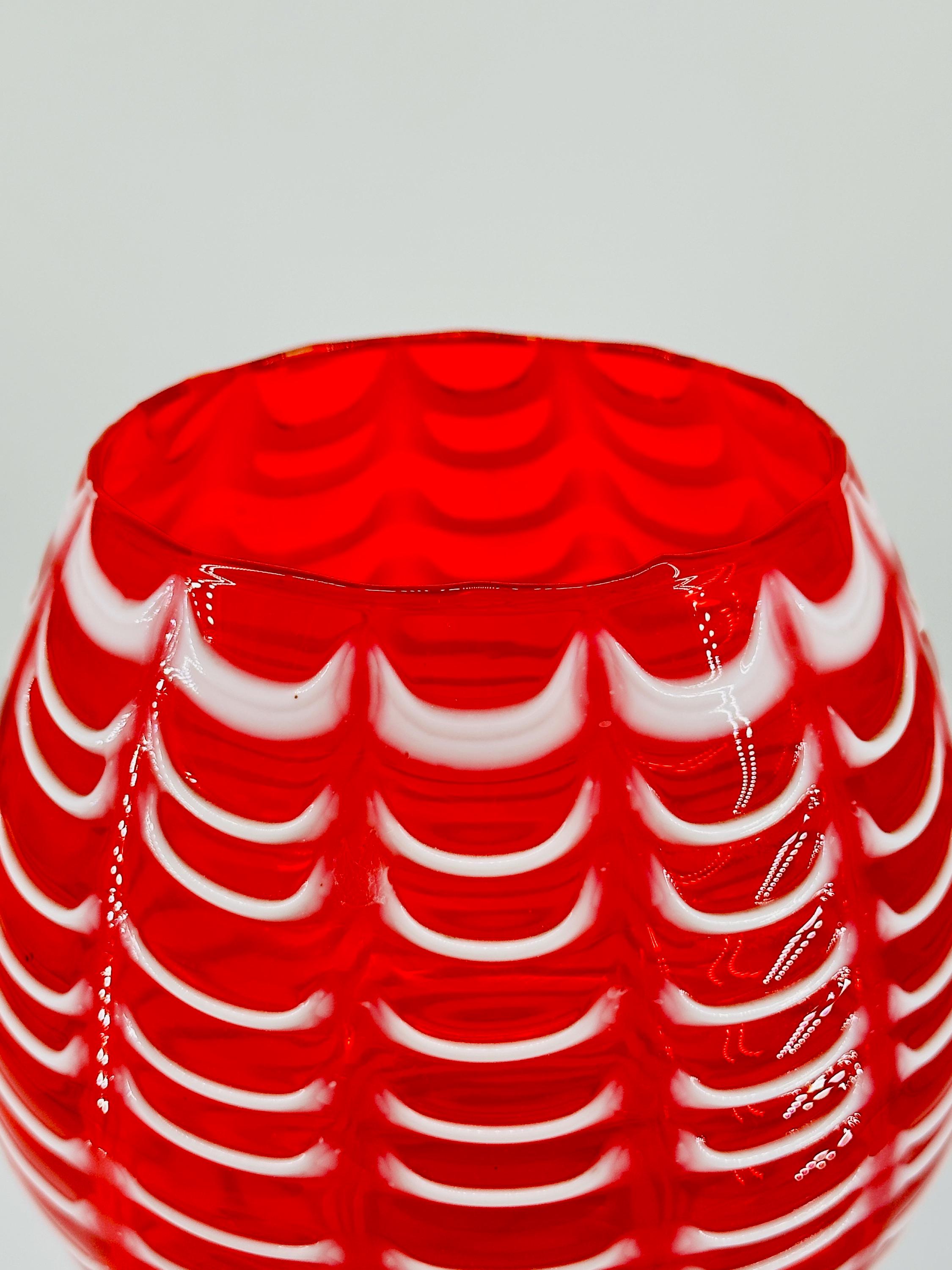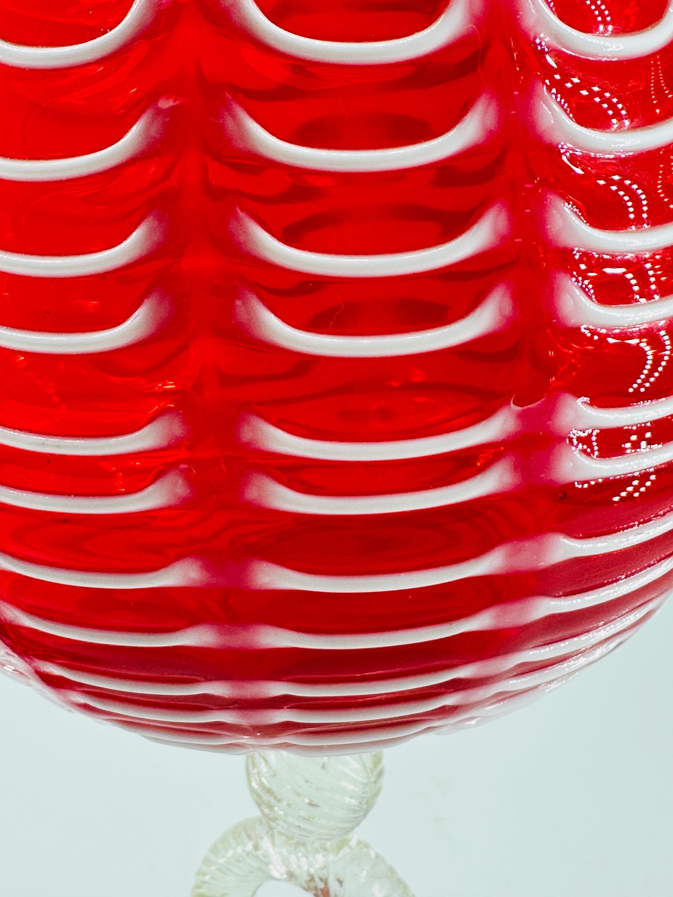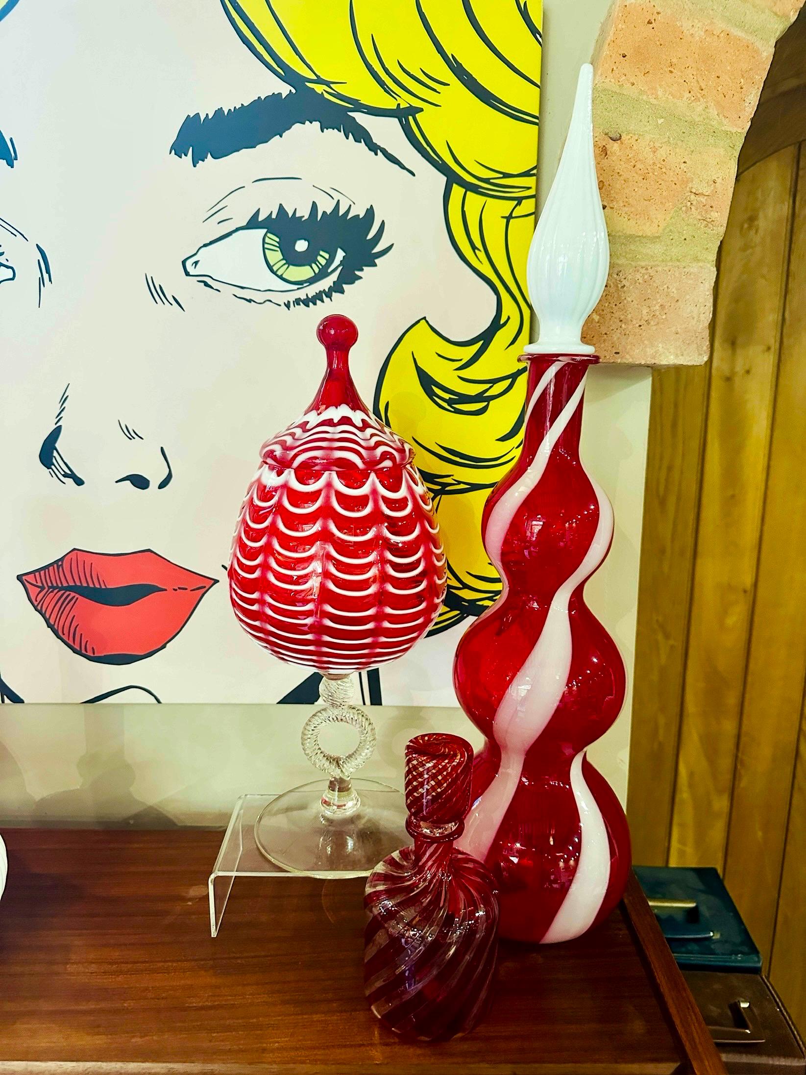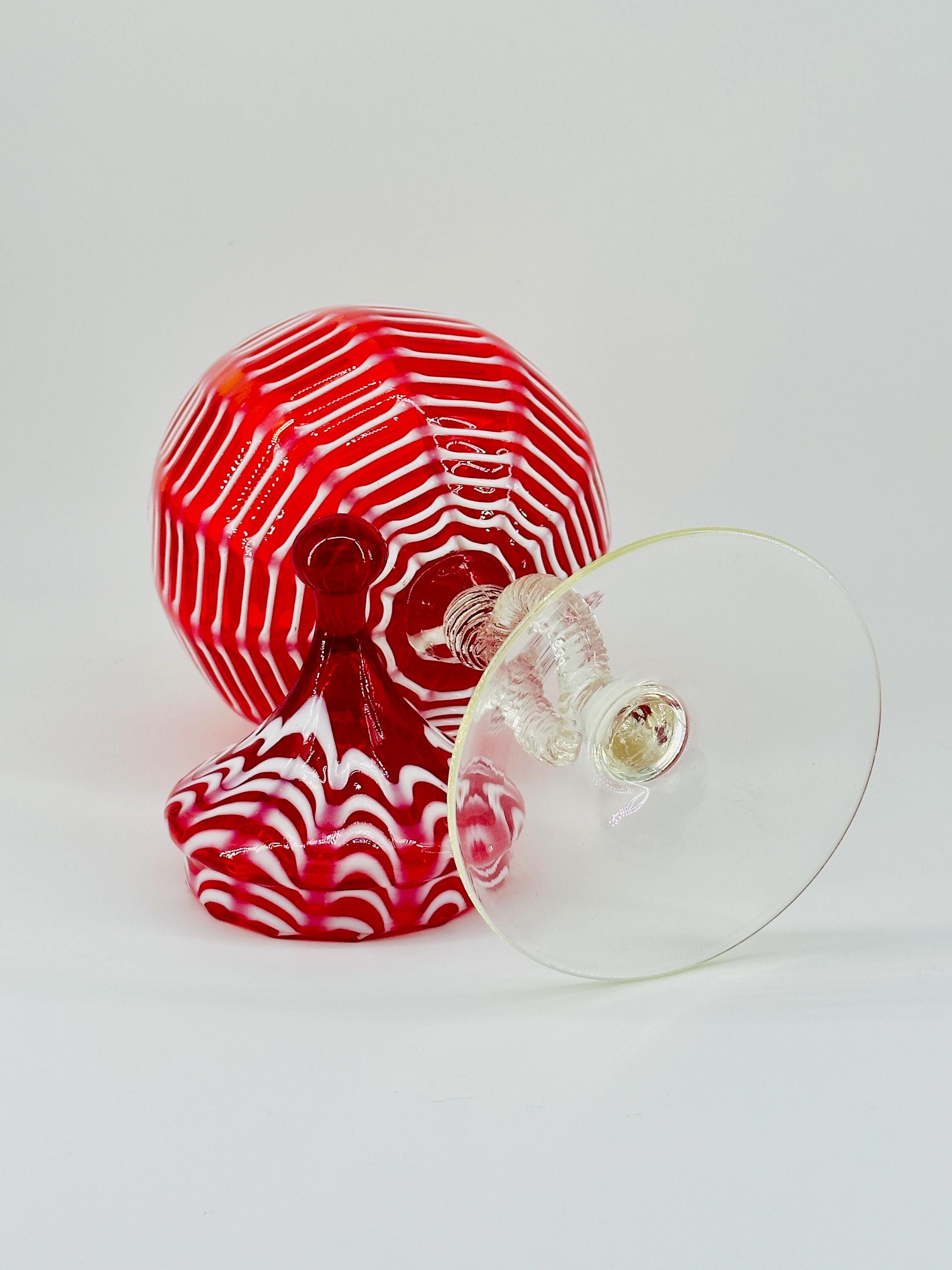 Empoli Fenicio Bonbonniere - Red and White Large Vintage Italian Apothecary Bonbon Jar with Circus Tent Lid and Swagged Lattimo Decoration. Wonderful to hold sweets and candies, or to display in a window at Christmas.