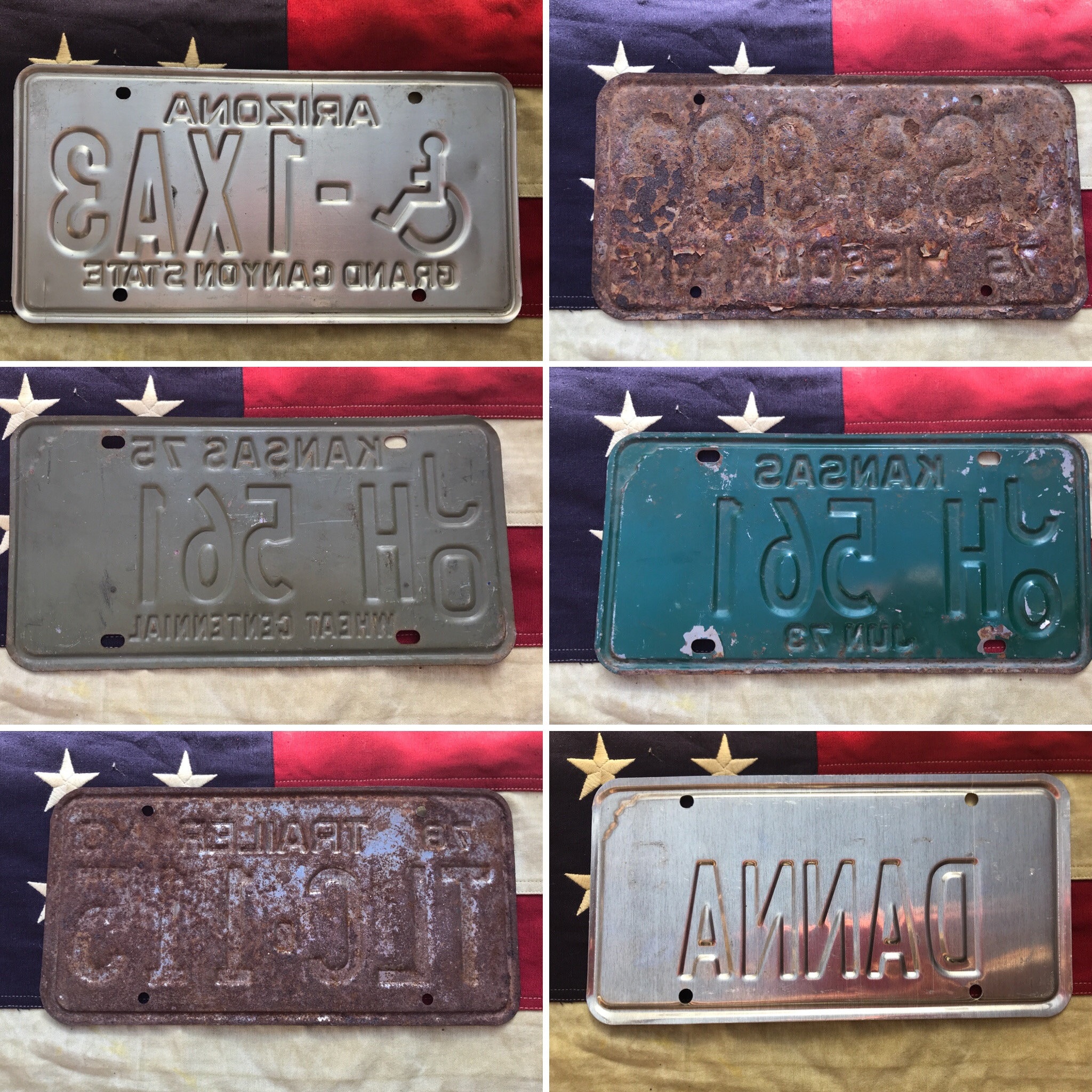Original vintage 1970s American metal license plates from Arizona, Kansas & Missouri USA.