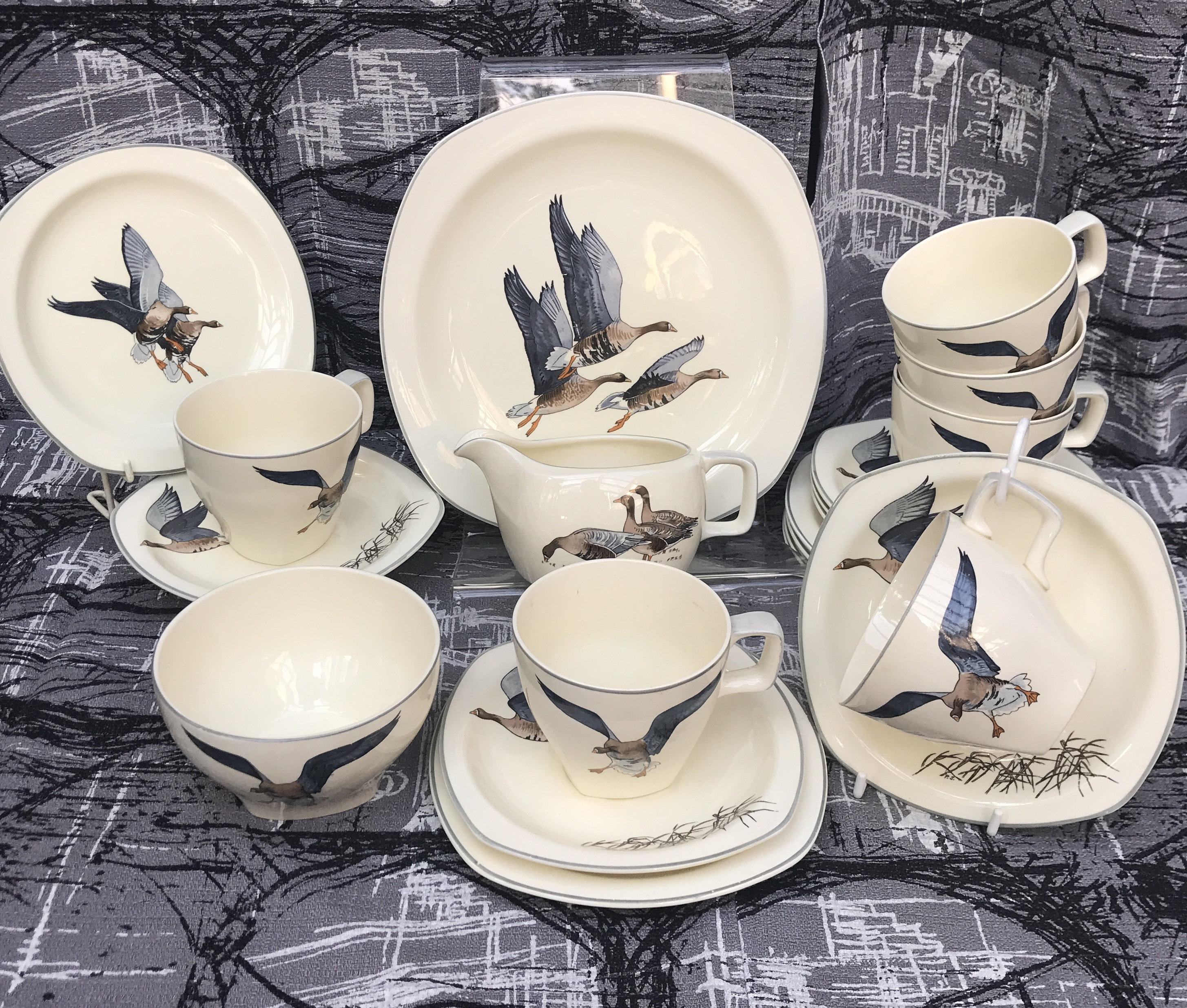 A selection of stunning Midwinter Pottery Stylecraft tea service pieces in the Wild Geese pattern, designed in the 1950s by Peter Scott.