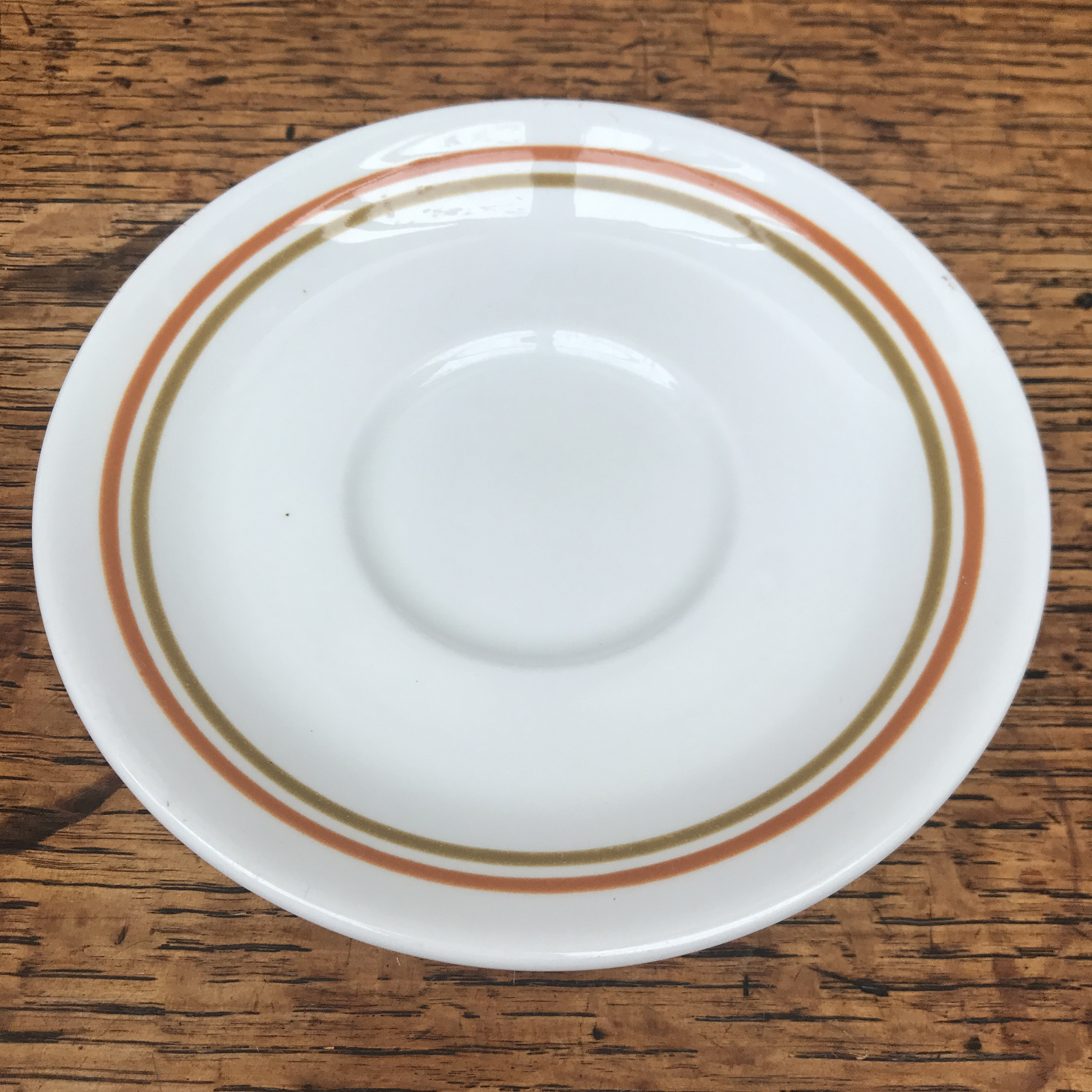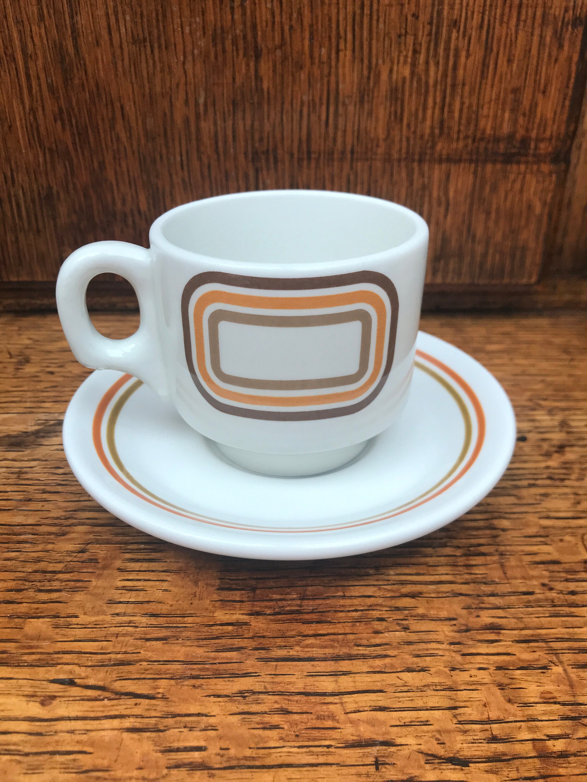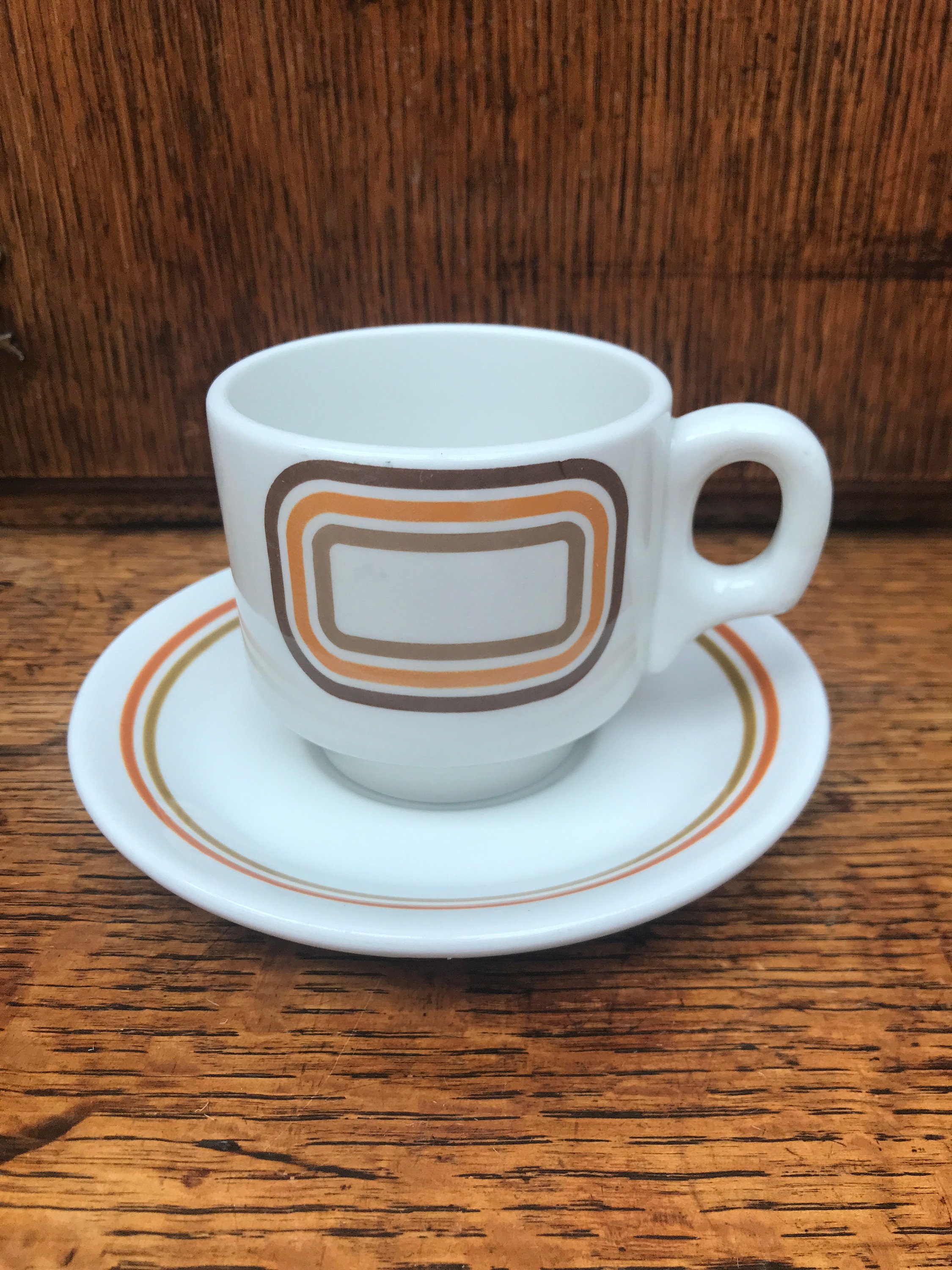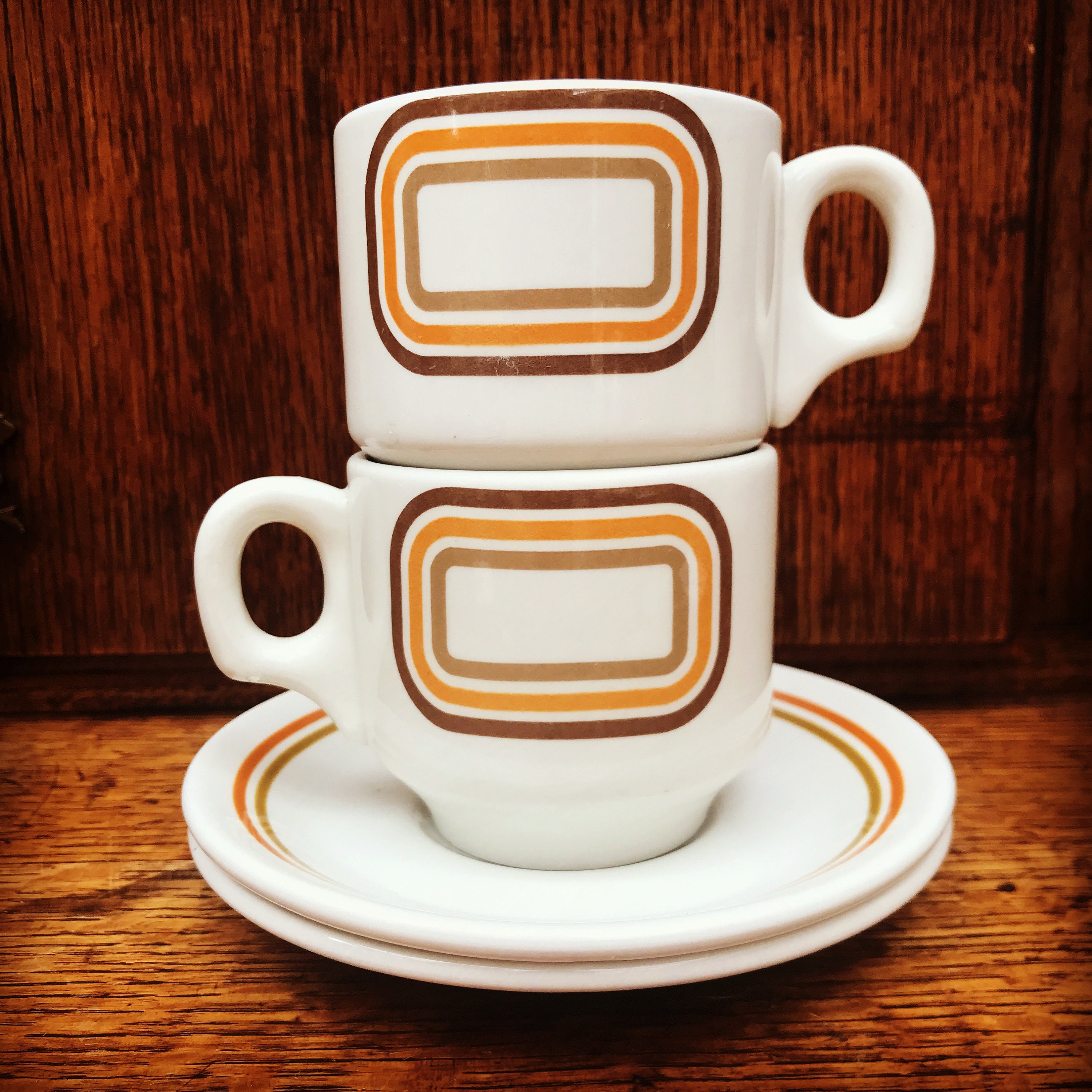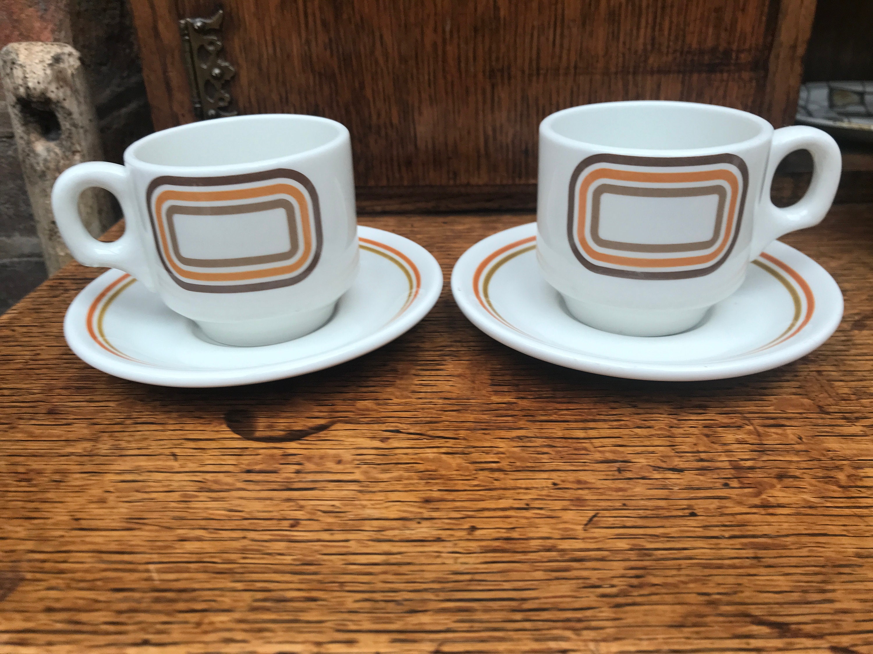 Super-retro set of two 1970s cups & saucers with 'TV screen-shaped' op-art design in orange, tan and brown stripes, that completely epitomise the design of the period.