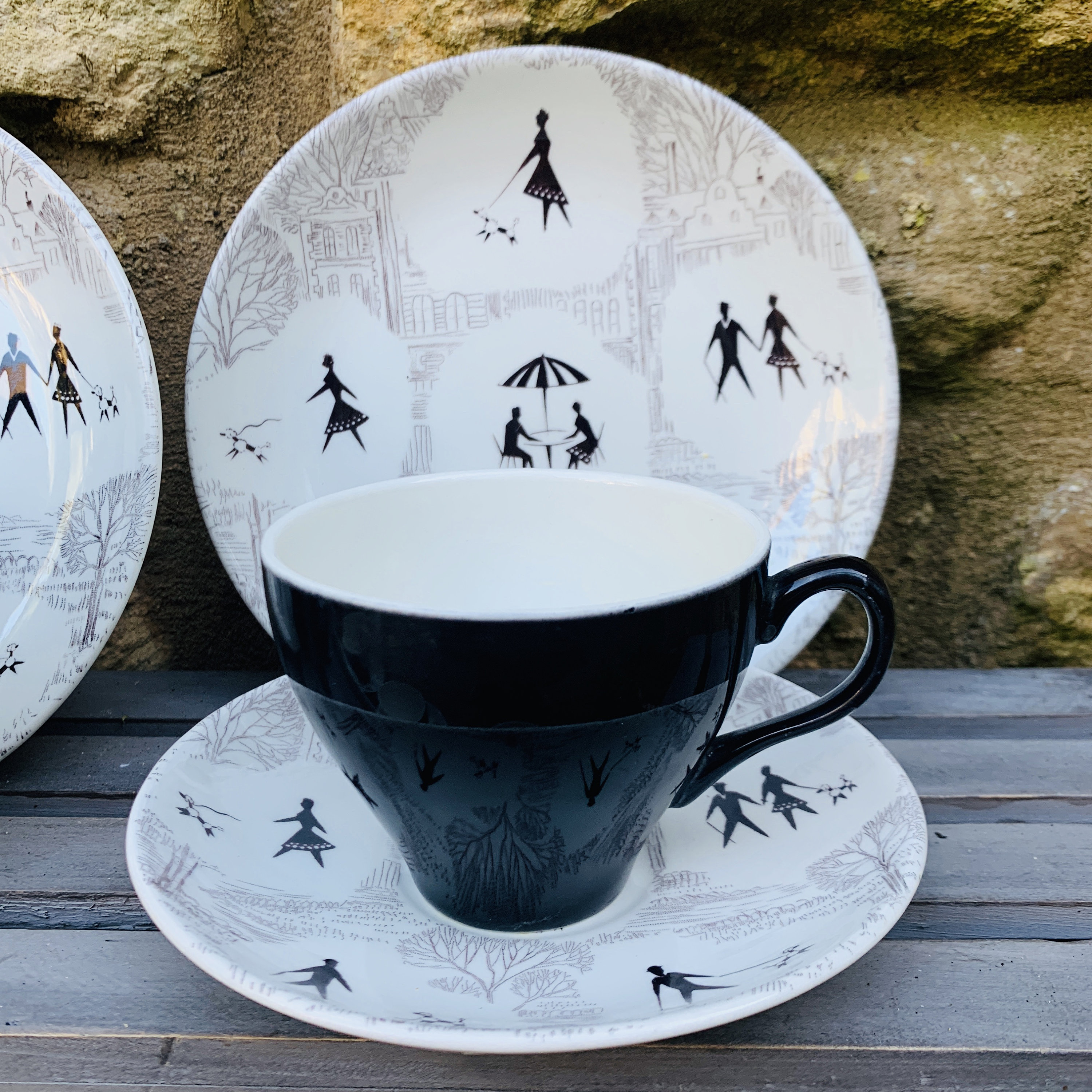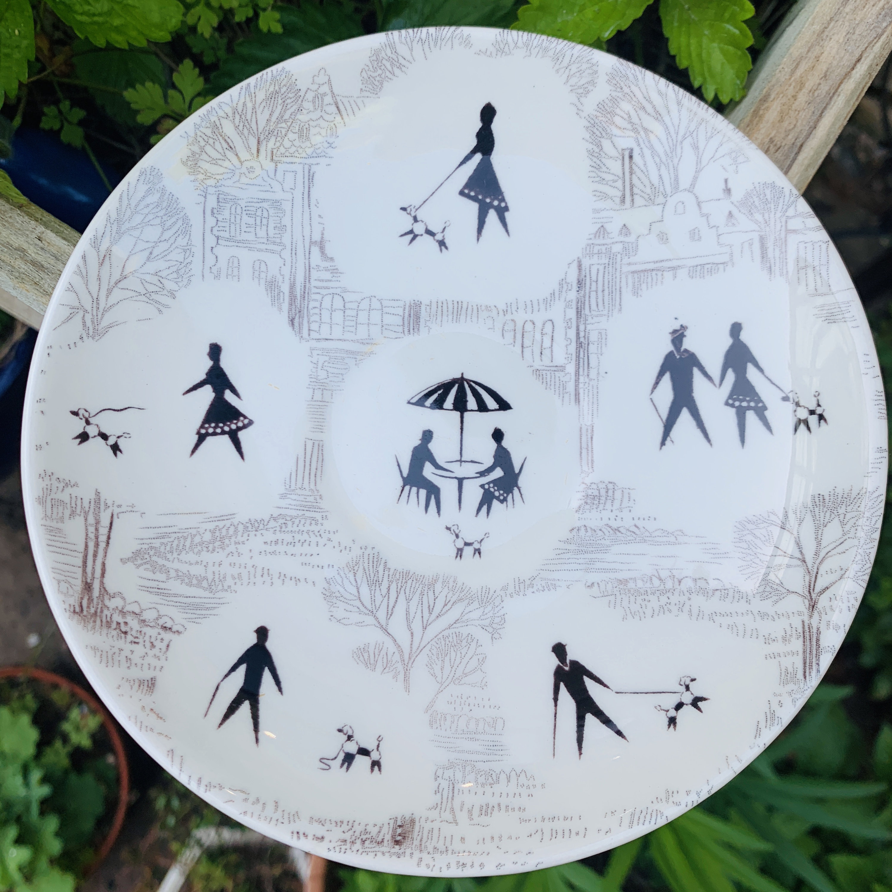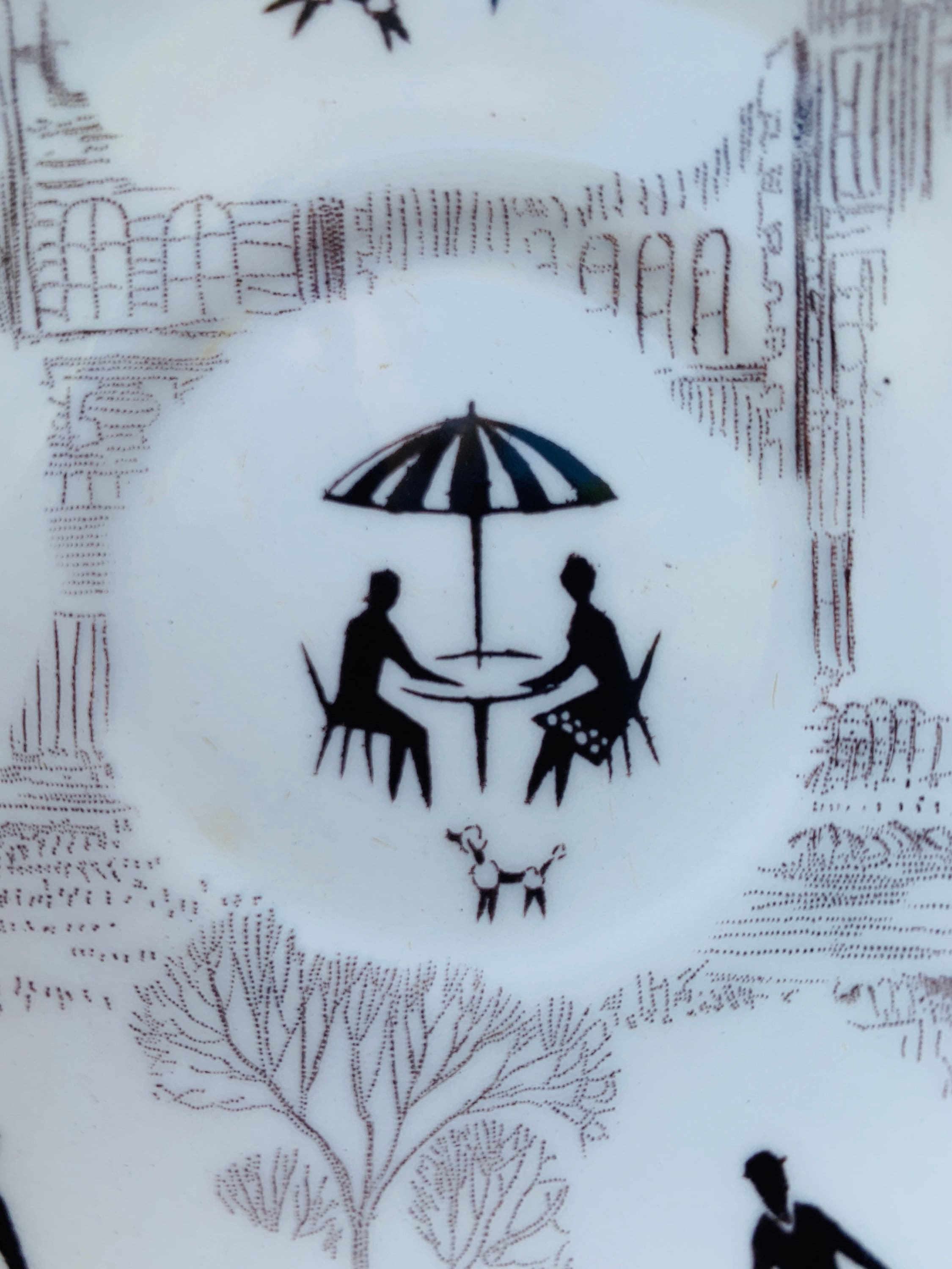 The plates and saucers each sport a little 6-part tale of black and white silhouetted figures meeting by chance when a poodle is lost in the park. The background is of trees and buildings in grey dotted line outline detail, contrasting with the bold figures and their cute little happy ending as they sit together under a striped cafe umbrella in the centre.