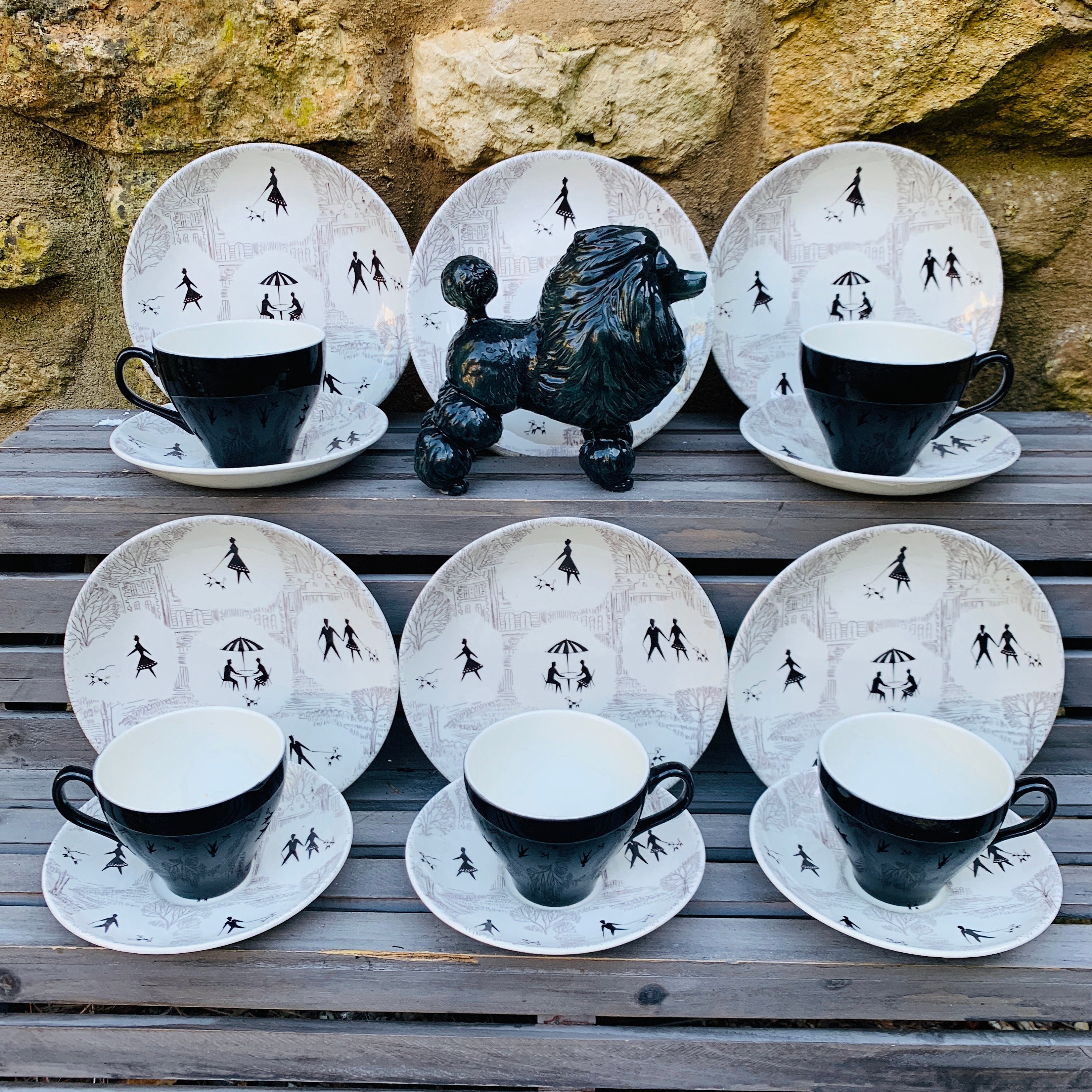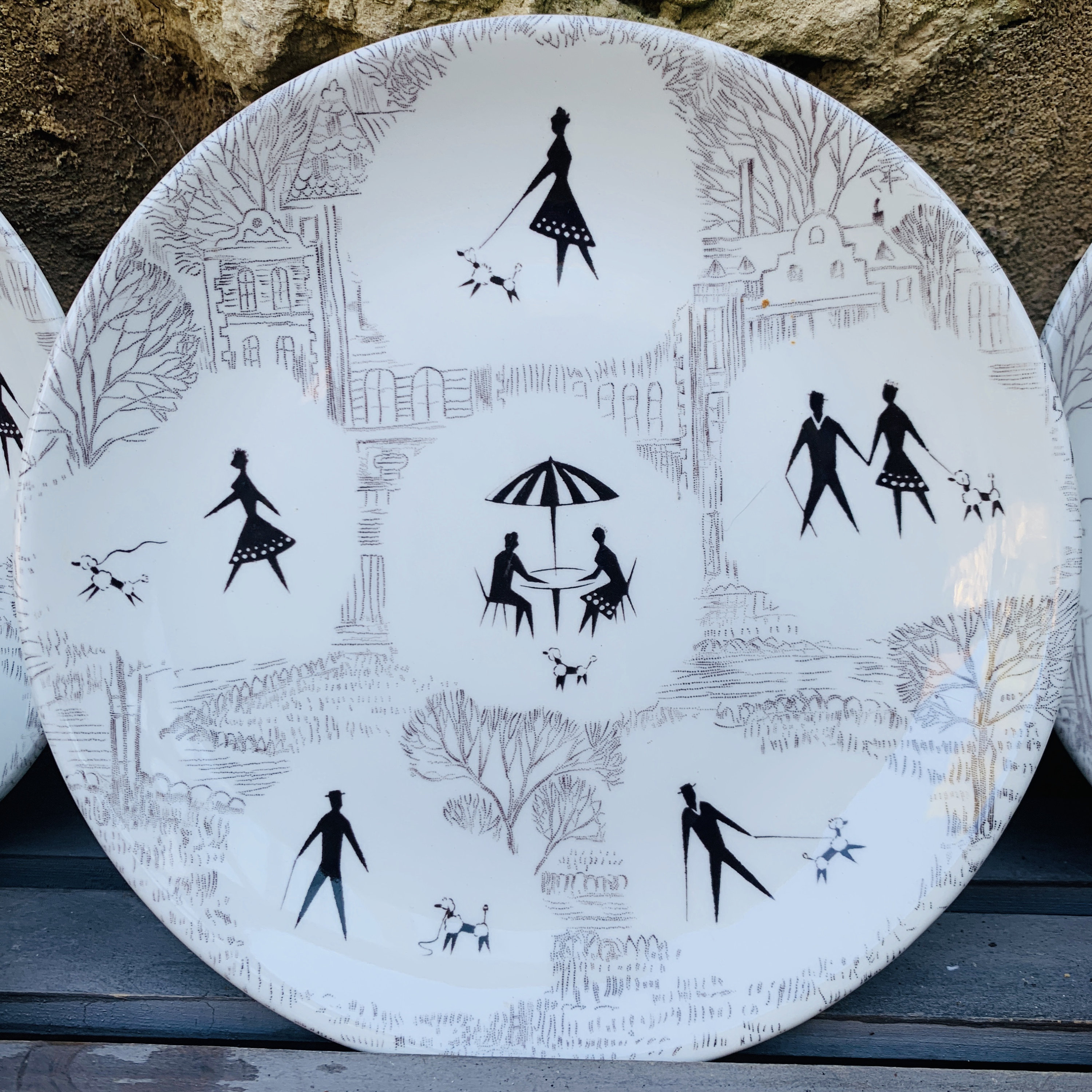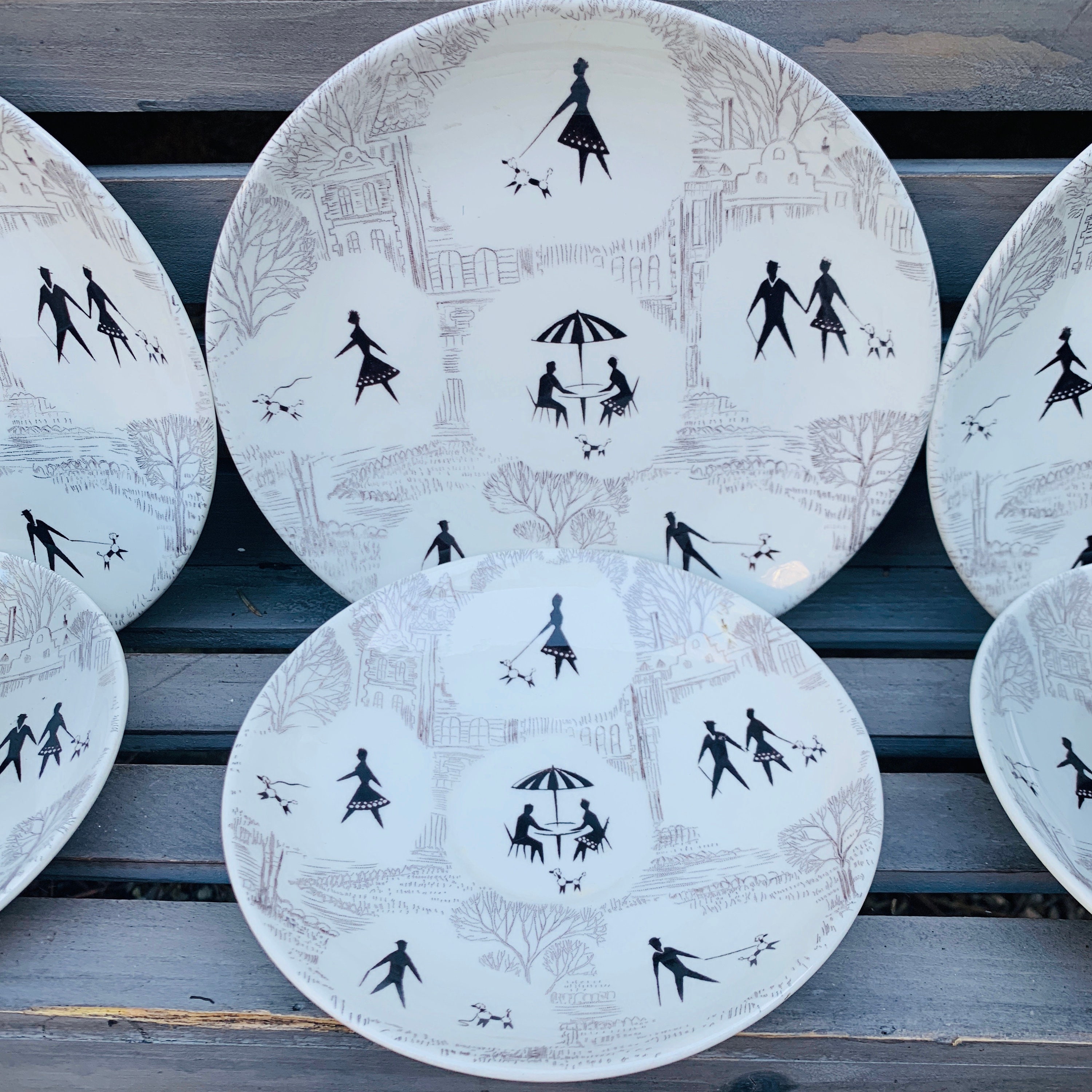 The plates and saucers each sport a little 6-part tale of black and white silhouetted figures meeting by chance when a poodle is lost in the park. The background is of trees and buildings in grey dotted line outline detail, contrasting with the bold figures and their cute little happy ending as they sit together under a striped cafe umbrella in the centre.