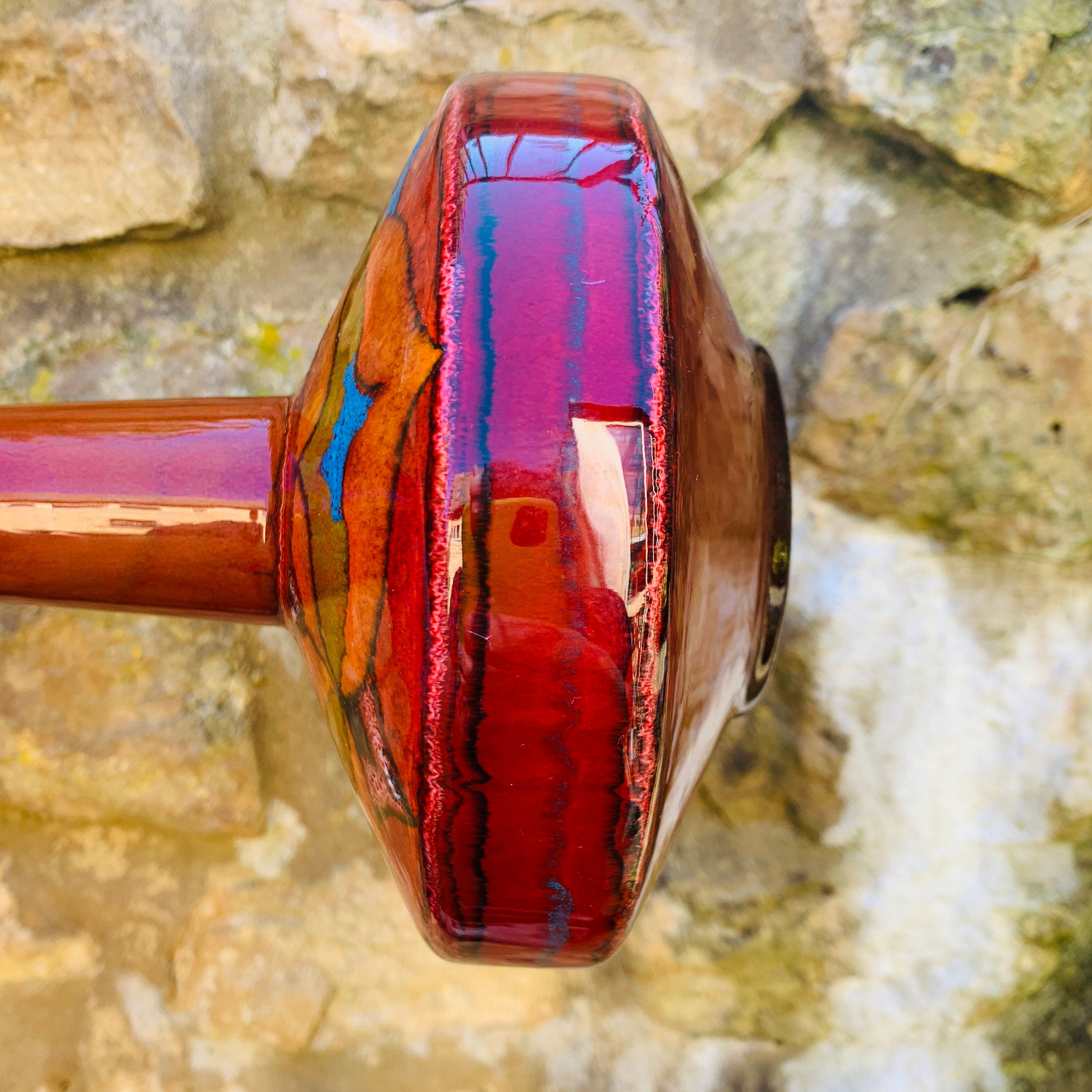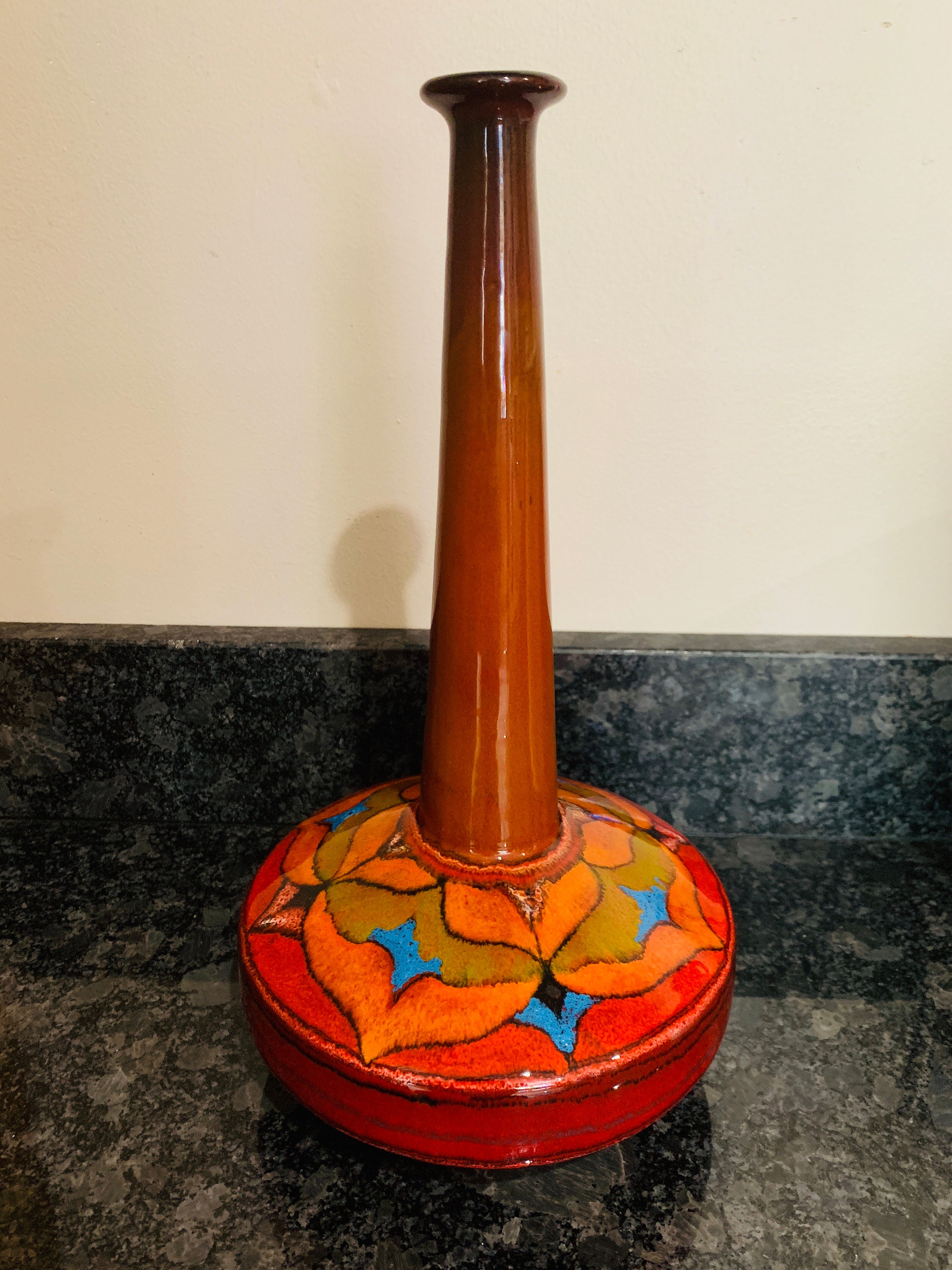Elegantly shaped ceramic vase, hand-decorated in vivid 1970’s inspired colours of red, orange, olive green, rust, black and bright turquoise with tiny white highlights and lava glaze effect.