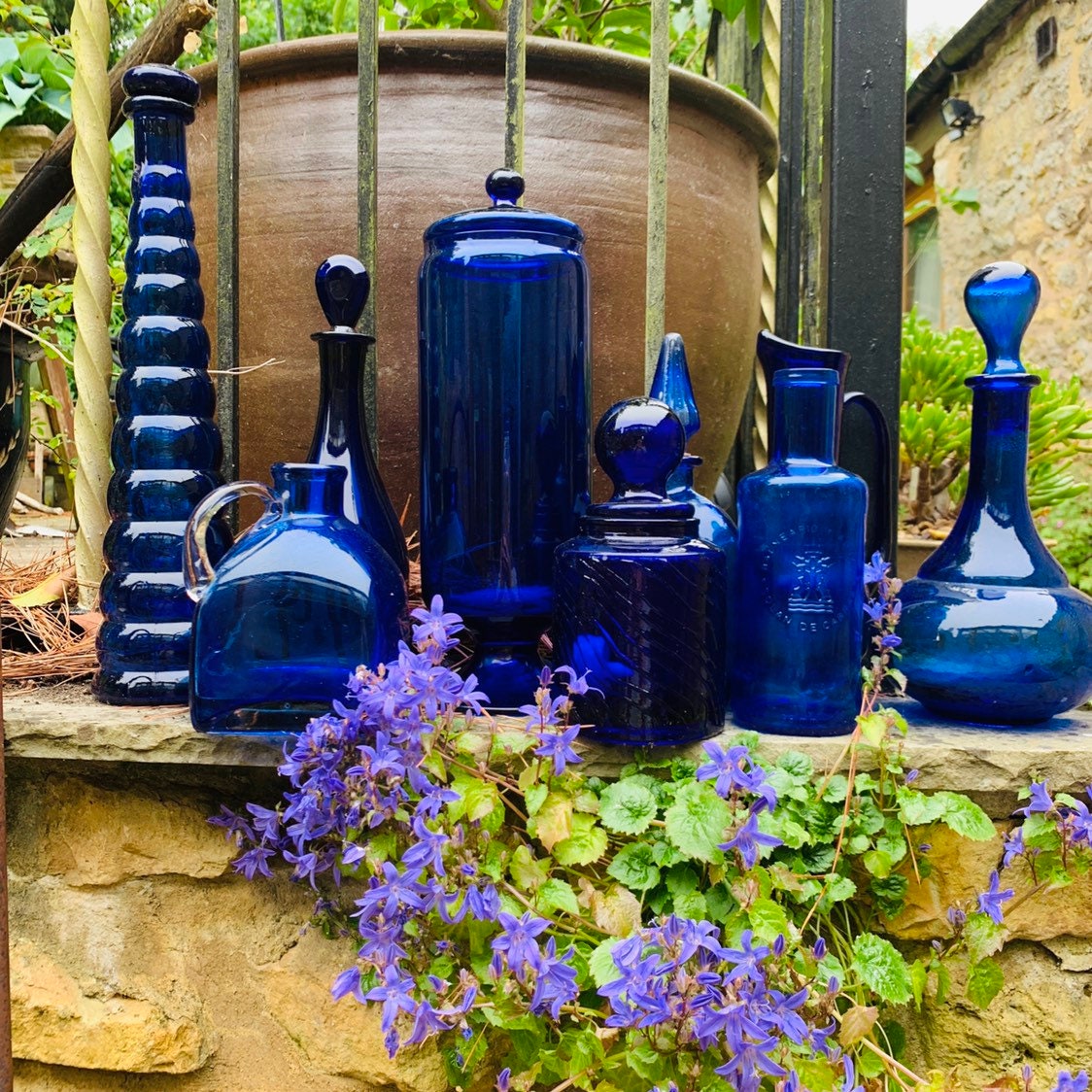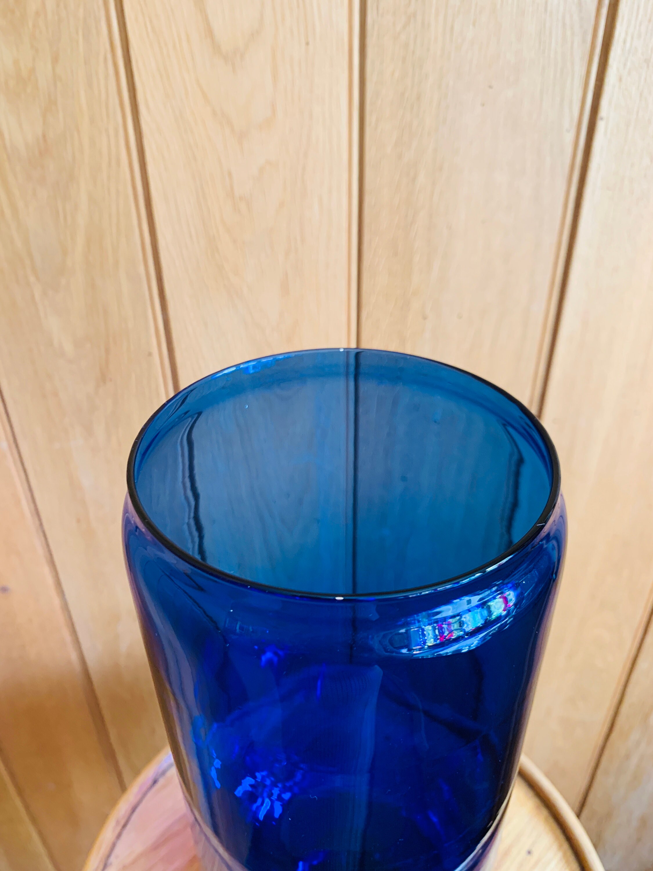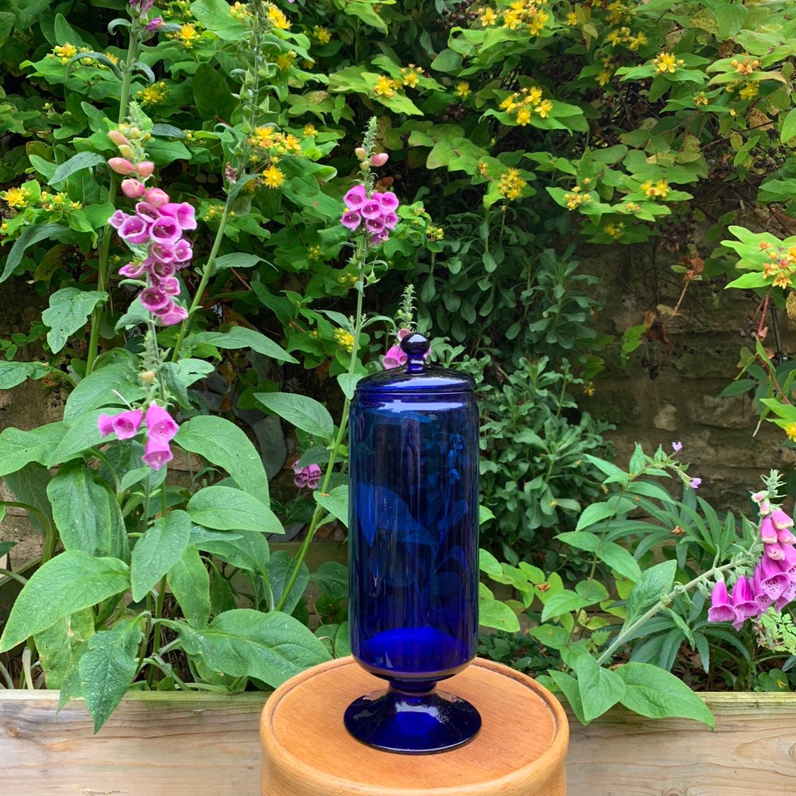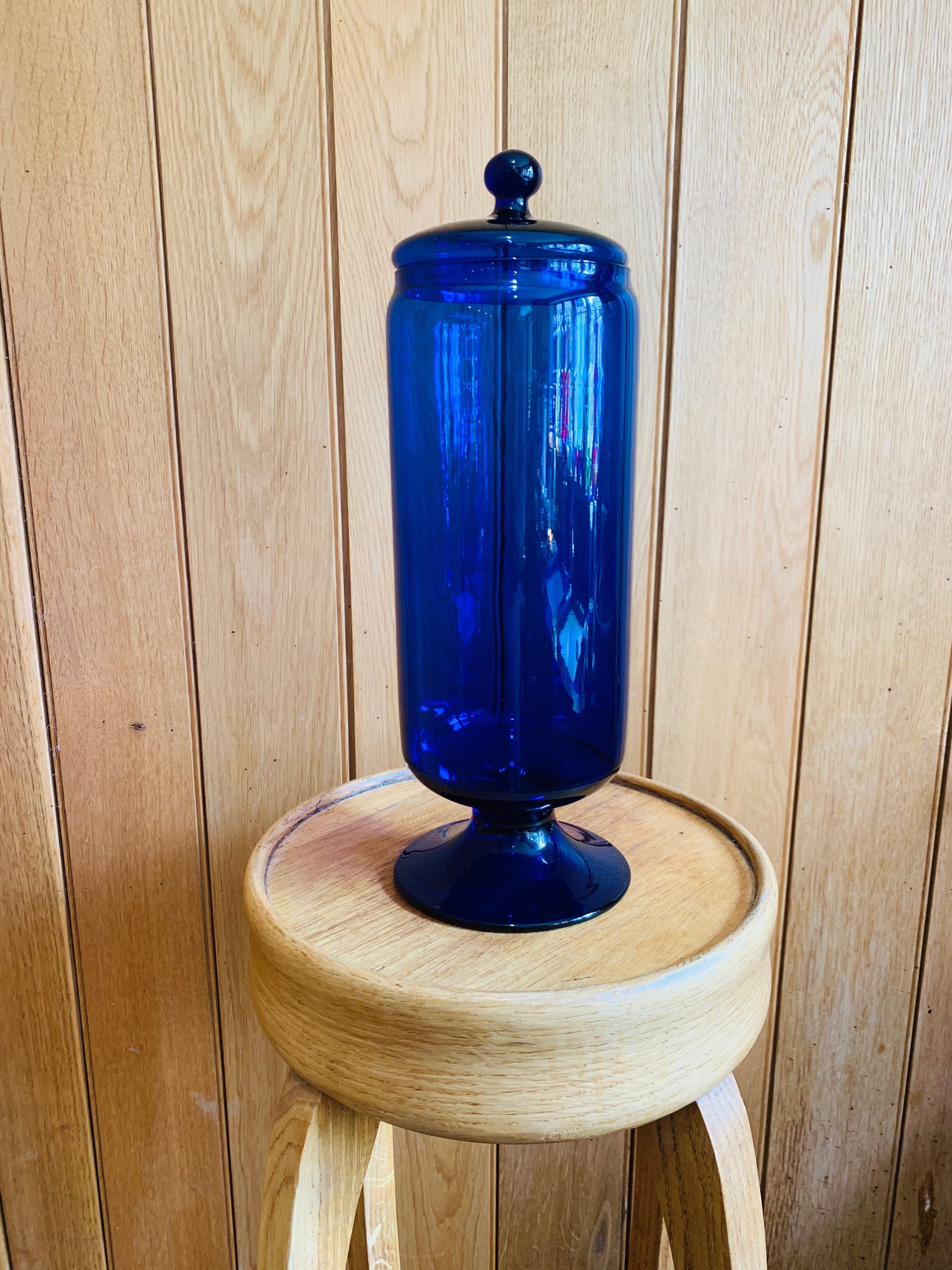 Unusual tall cylindrical straight-sided jar, looks perfect displayed alone or with other blue glass or bottles. Perfect for a bathroom, attractive kitchen storage or just as a decor accent. The photos show its height alongside standard genie bottles for comparison.